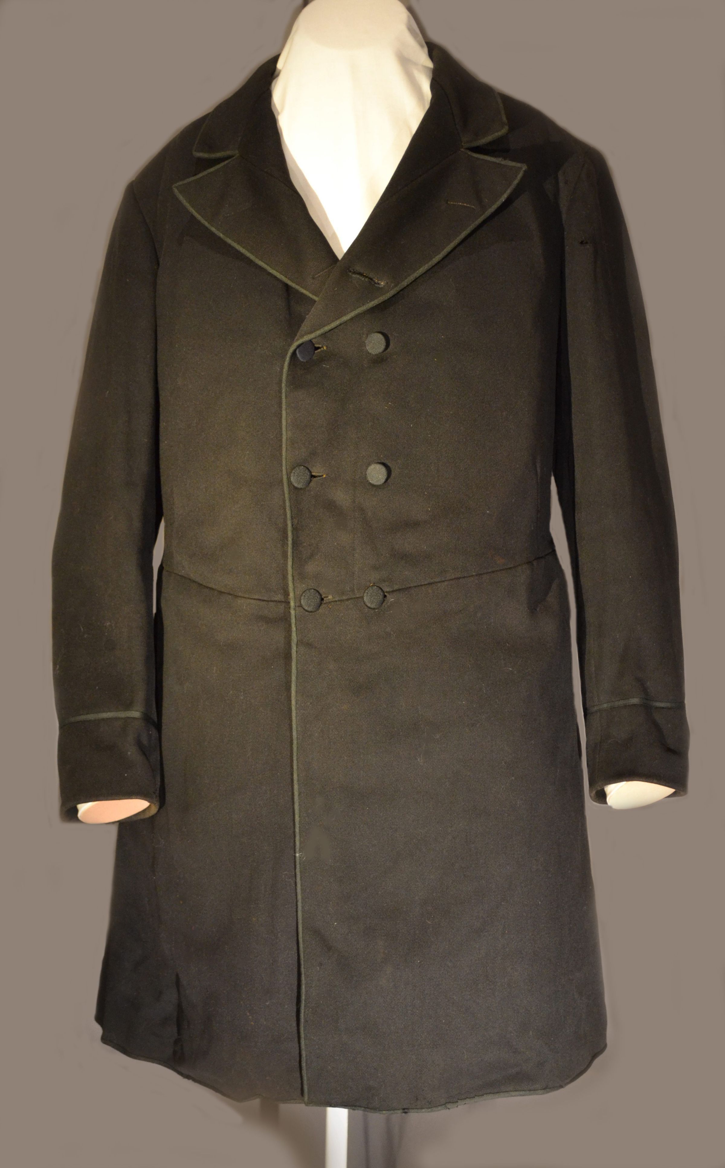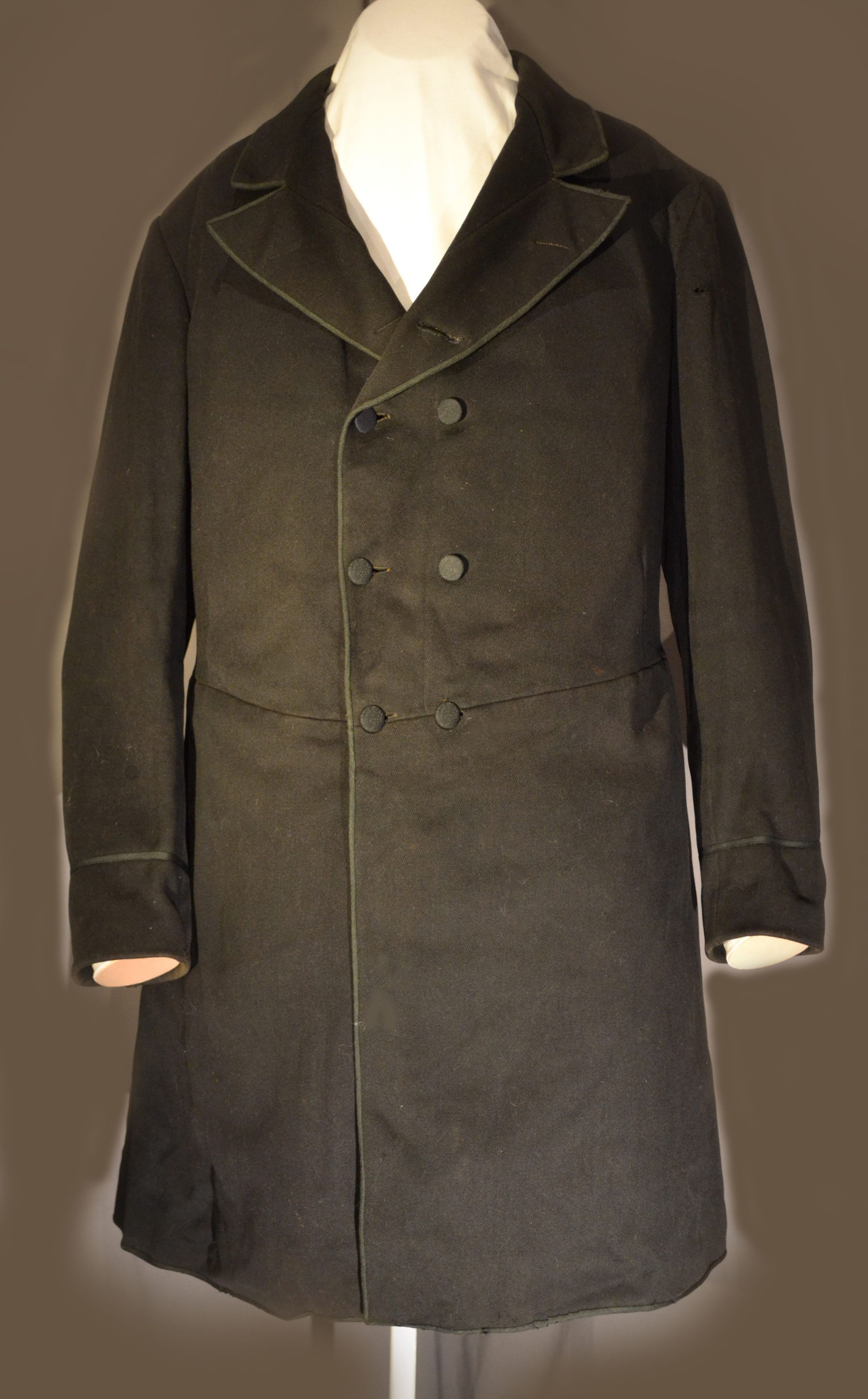 By the mid-19th century, the frock coat was considered an essential part of a man's wardrobe. Unlike the cutaway front of the tailcoats popular at the beginning of the century, frock coats had straight skirts that fell at the mid-thigh or below all the way around. Although they were made of a variety of fashionable fabrics, black wool was probably the most common material. Frock coats worn with straight trousers, a short vest, and a shirt with a high collar formed the basic man's “business suit” of the 19th century.