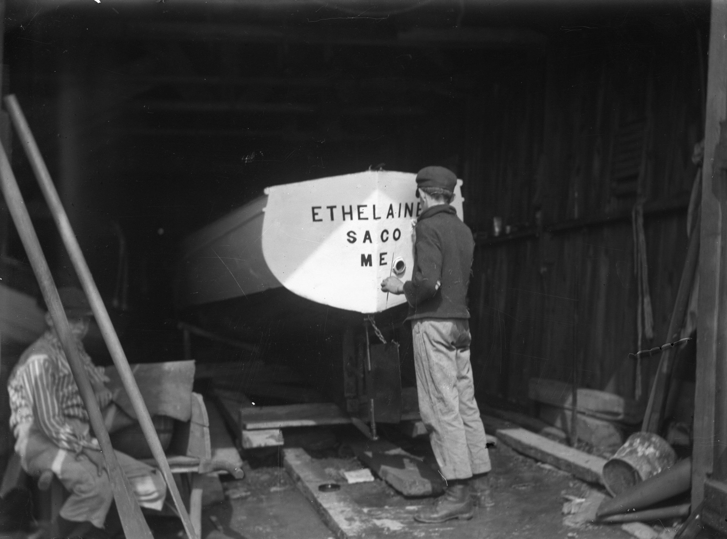 Glass plate negative photo of a boy painting the words, "Ethelaine Saco ME" on the back side of a boat.
