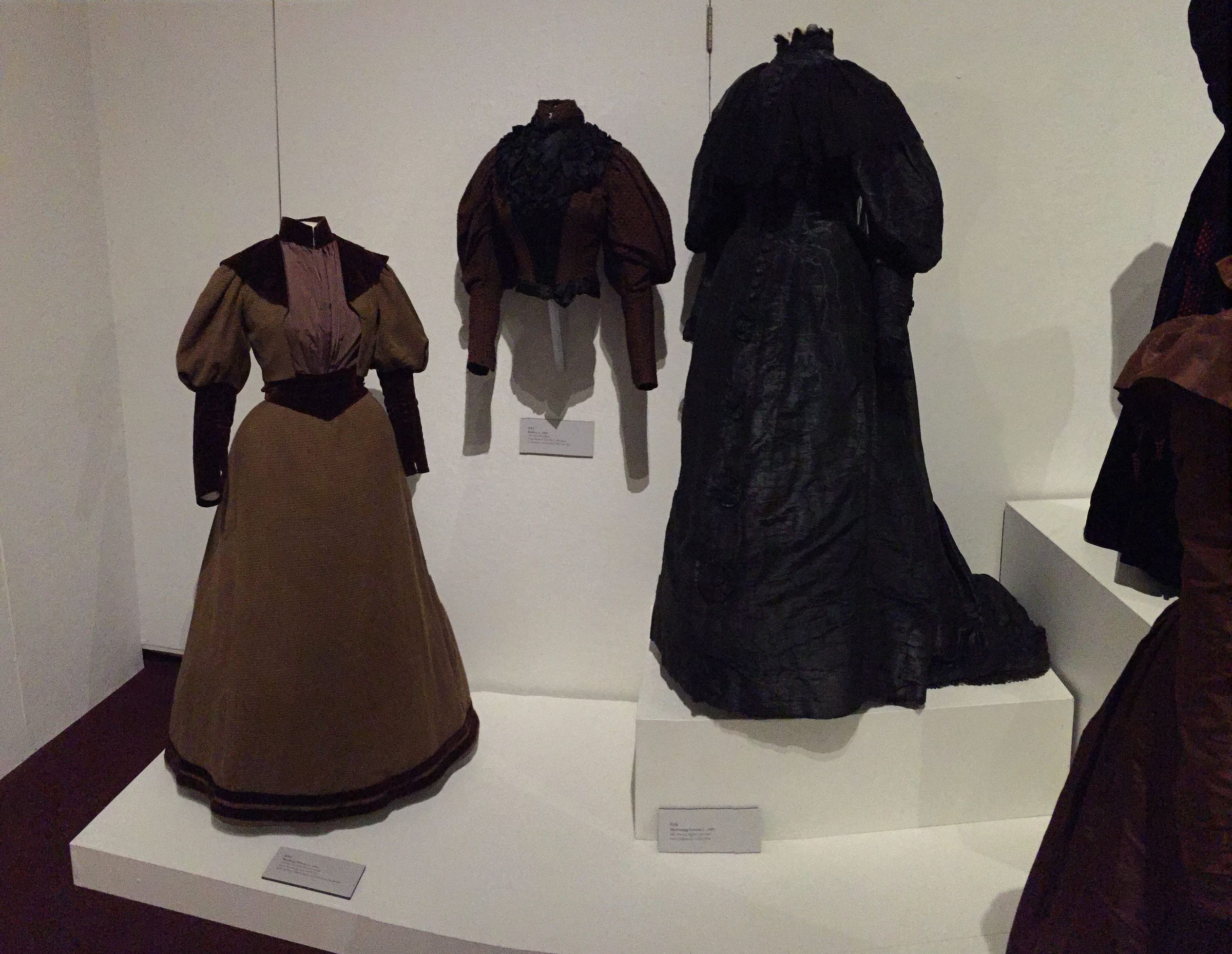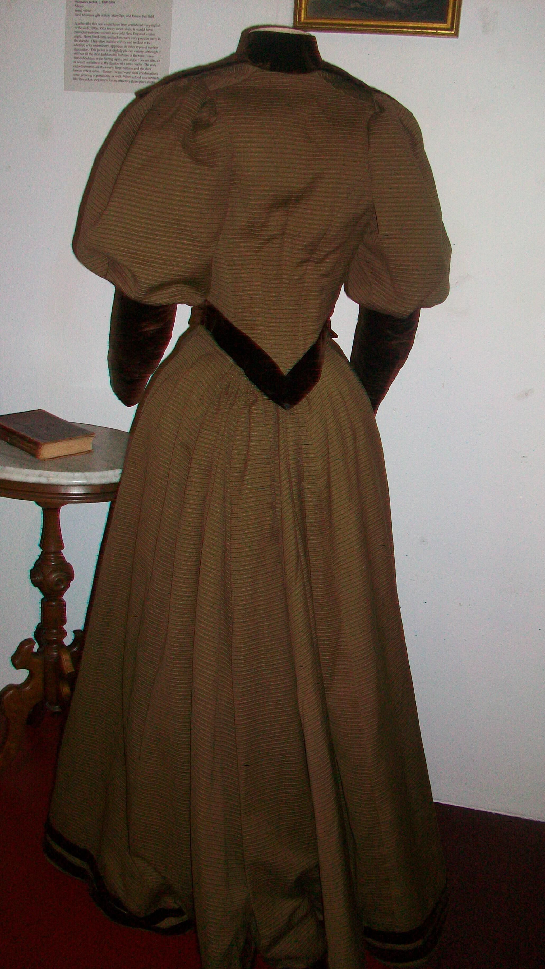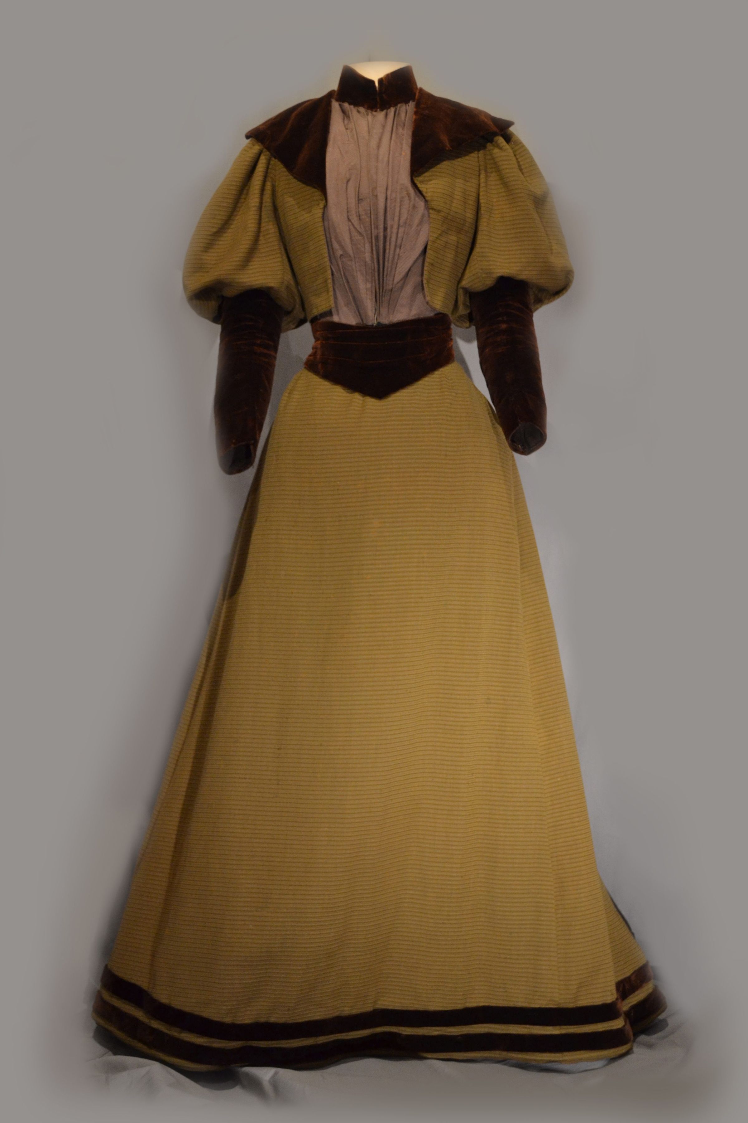 The 1890s witnessed a return to the hourglass figure, which was achieved by reviving the large leg-of-mutton sleeves of the 1830s and using a gored skirt, which was made with triangular pieces of material to create a graceful A-line. Both the wide sleeves and flared skirt emphasized the waist and made it appear smaller in comparison. The dark band of velvet at the waist on this garment reinforces the illusion. The bodice of this dress is also deceptive. It was constructed to appear like two separate garments, a pleated shirt and a separate jacket, when it is in fact one. Worn with a hat and a pair of gloves in a coordinated color, this walking dress would have been the centerpiece of a very stylish ensemble for a promenade in the park or an afternoon of shopping.Label Type