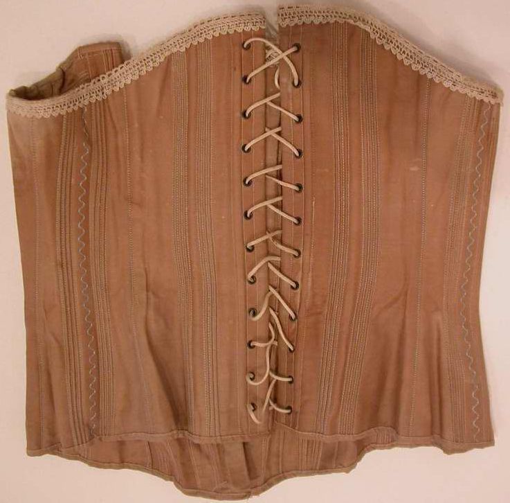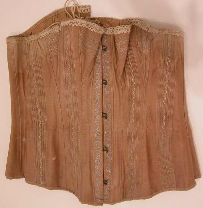 Tan boned corset. Outside has decorative blue stitching. Metal hook and eye fasteners in back and white lacing in the front.
