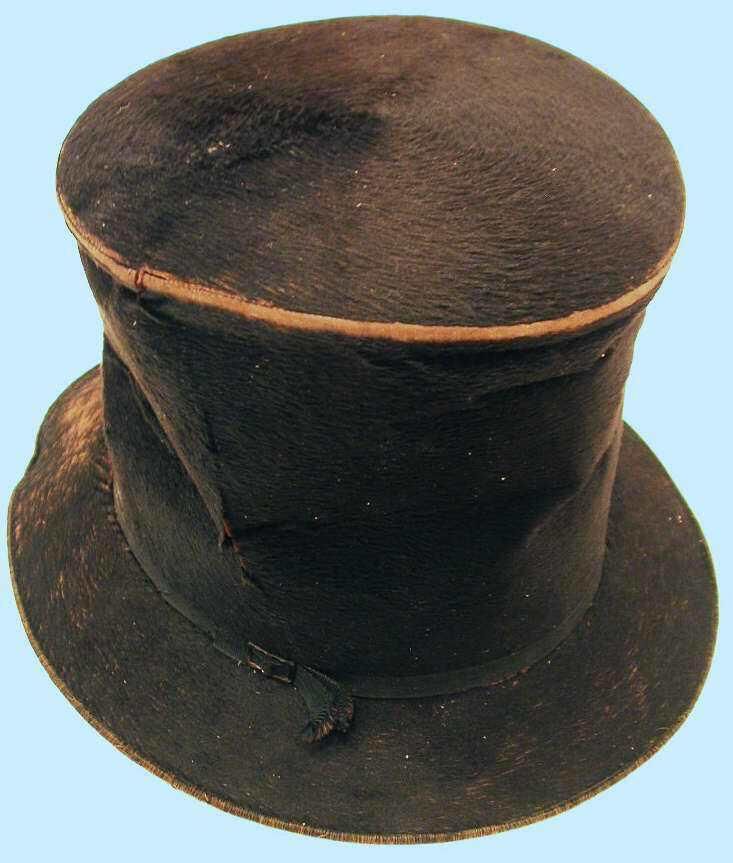 Black beaver felt top hat with straight sides, crown rising 6 1/2 inches with 2 inch brim. Half-inch black grosgrain ribbon trim with black painted metal buckle at base of crown. Lined with blue paper, cracked and torn. Interior label reads: "David 299 1/2 Broadway." Leather interior of back separating from crown includes green and beige striped adjustment ribbon at rear, closed with three-leaf clover brass clip.Material