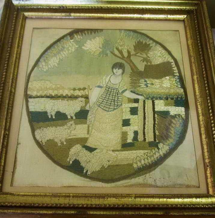 The naïve nature of this thick-armed shepherdess, accompanied by her lopsided sheep, makes it very likely the work of a small town school, drawn by an inexperienced teacher. At larger academies, teachers frequently resorted to tracing or copying prints of the era; the resulting needlework has a sophistication of design and level of artistry that belie the age of most of the embroiderers. This shepherdess appears to have been drawn by an unskilled hand, but is nonetheless charmingly unique.Label Type