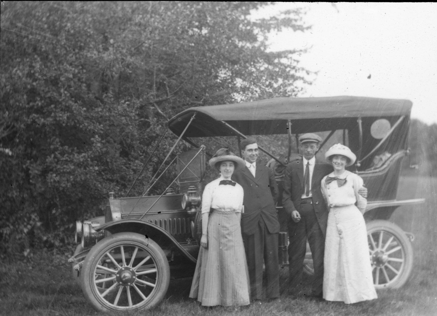 Glass lantern slide of (from left to right) Ella Winifred Cole Sawyer, Howard B. Sawyer, Charles E. Moody and Vivian Lois Cole - Moody's "North Street Gang" in Saco - posing in front of a car. The Moodys and Sawyers were neighbors on North Street and socialized together.