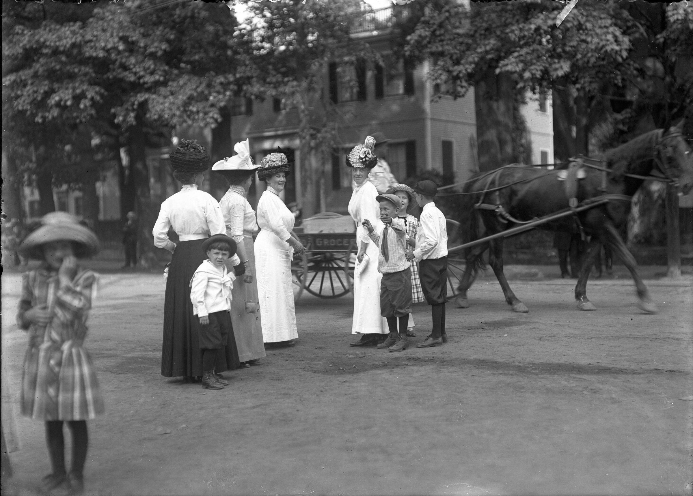 Glass plate negative photo of a group of women and children gathering by a horse-drawn wagon in front of the Jonathan Tucker House (now site of Most Holy Trinity Church).