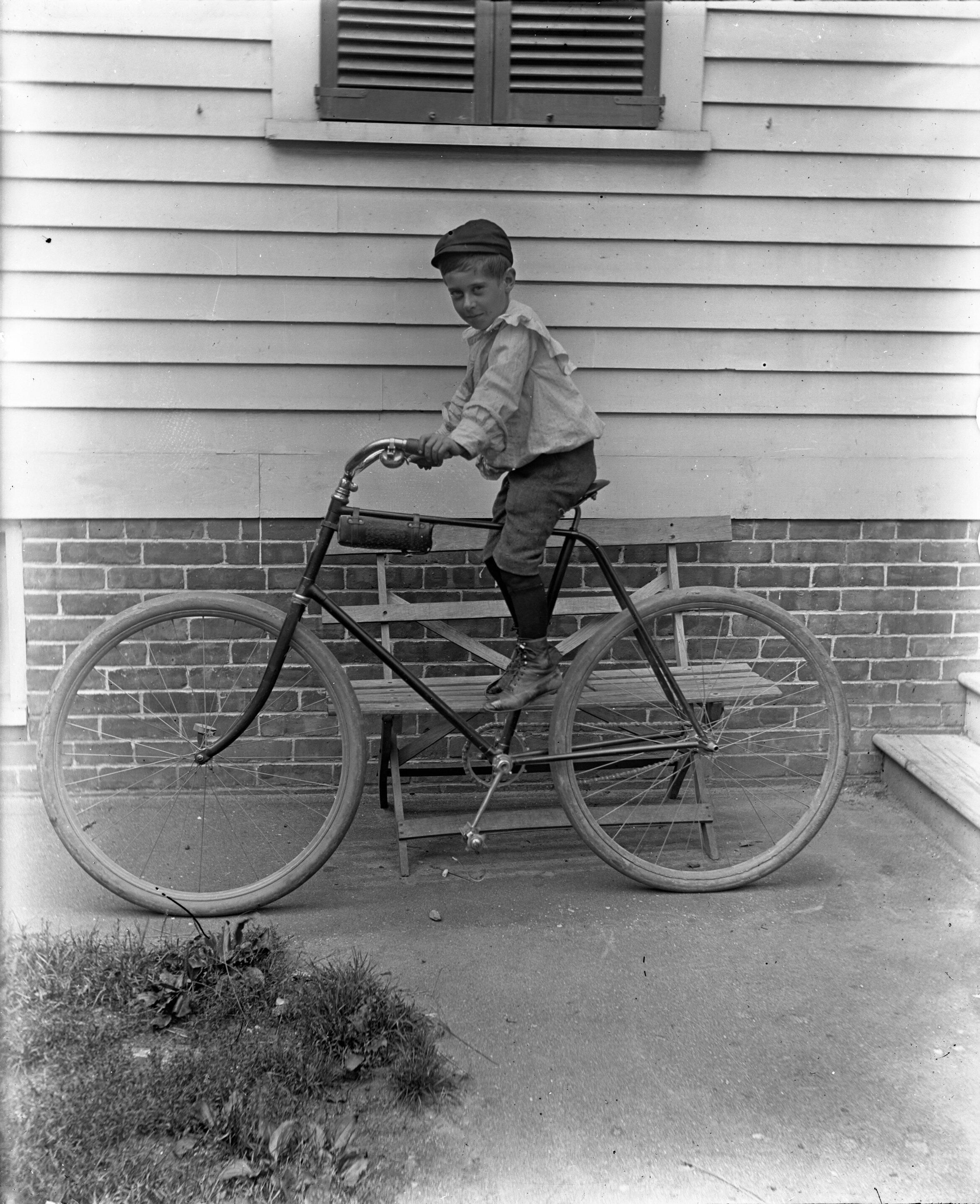 A glass plate negative photo of a boy riding on a bicycle in front of a house. "Charles on a bicycle" is written on the plate sleeve.Made/Created