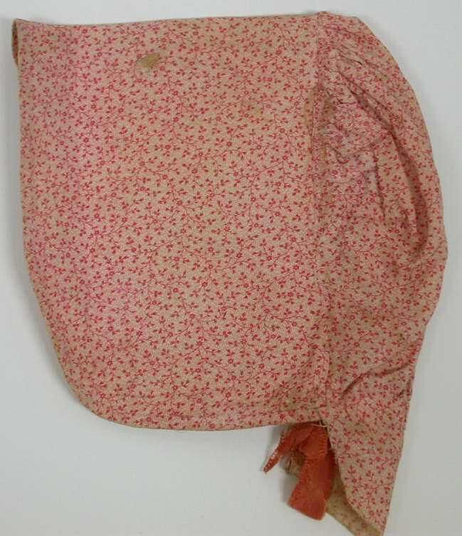 Child's bonnet made of a cotton double pink print, hand-sewn. The brim is stiffened with buckram. The back of the bonnet is gathered into the brim at the top. At the bottom is a casing with dark pink ribbons that tied under the chin.Dimensions