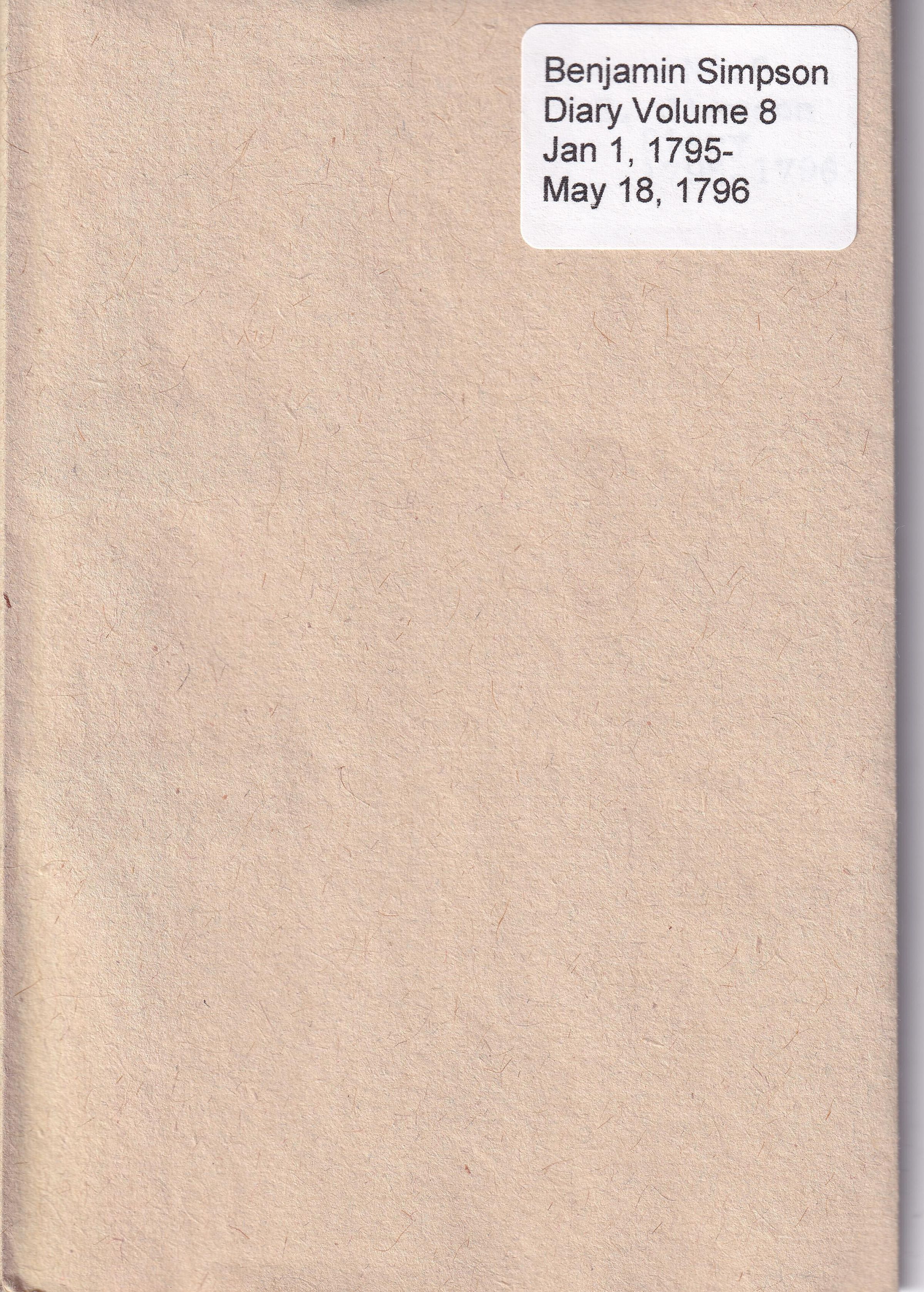 Eighth volume of the diary of Benjamin Simpson of Saco, 1781-1849. This volume covers the period January 1, 1795 through May 18, 1796. It is handwritten in ink on rag paper with a handsewn binding; it is now housed in a modern paper cover. This volume consists of two original volumes, January-August 1795 and August-May 1796 in the same modern enclosure. Most of the entries are a single line. The date is listed at the top of each page, with individual entries (without dates) listed below. Simpson noted his major task of the day and the weather. His entries reflect the seasonal nature of the work of a man who owned a farm but also was a skilled mason.