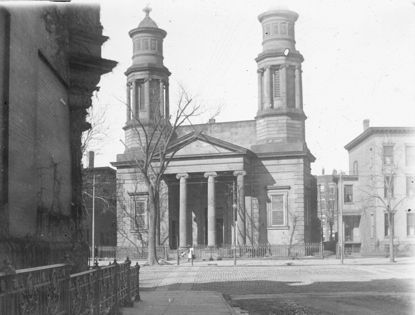 Glass lantern slide of the South Park Presbyterian Church, Newark, NJ. "So. Park Church Looking out from Chestnut Street" is written on the label.Made/Created
