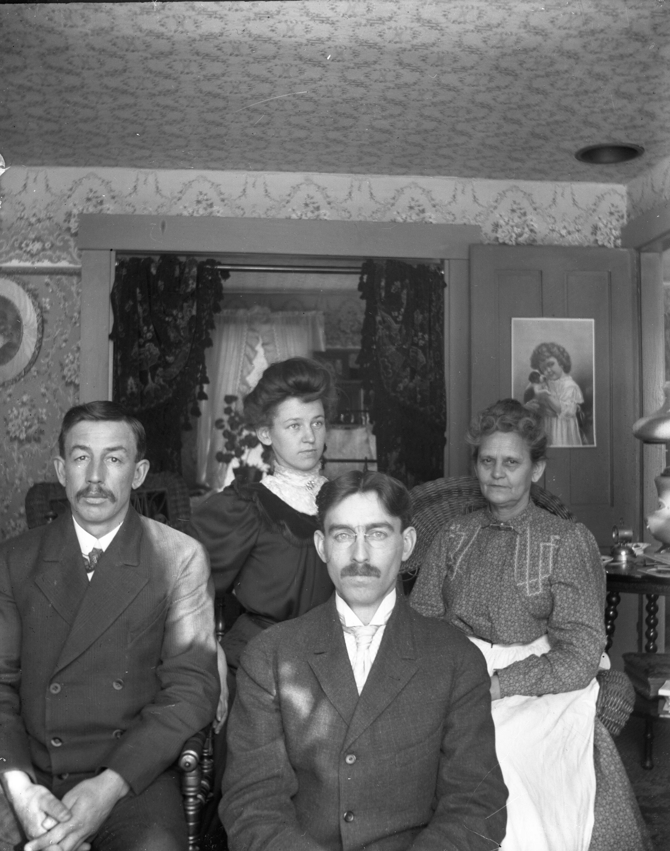 Glass plate negative photo of (from left to right) Josiah Milton Hobbs, Eunice Amanda Hobbs Staples, Dr. Ivan W. Staples, Sarah E Lane Hobbs at 31 Hill Street house in Saco, ME. Circa 1908.