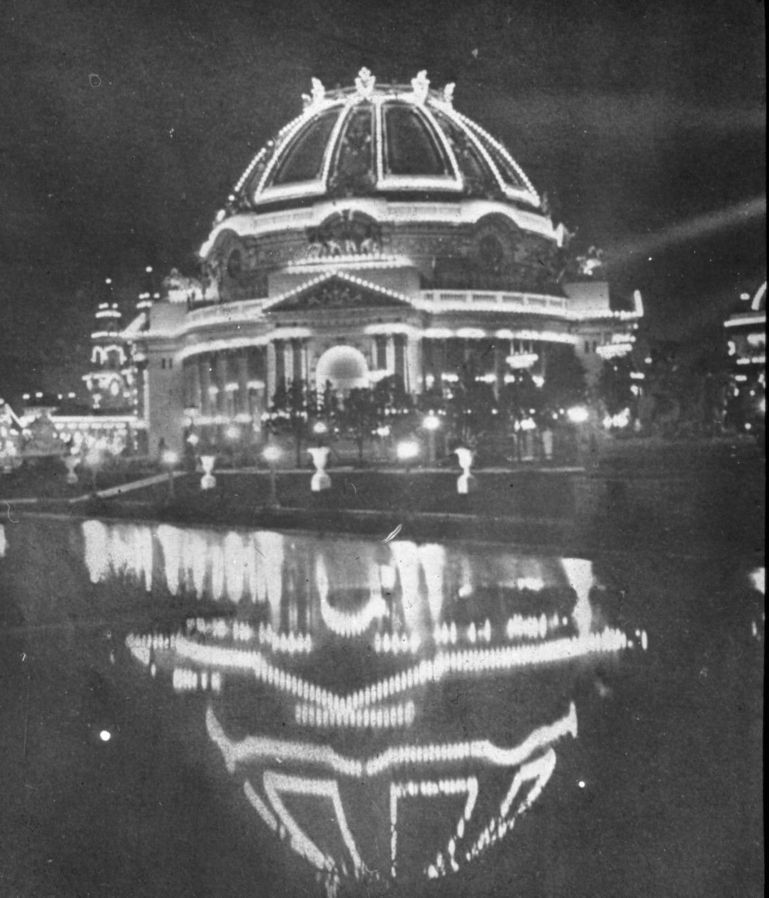 Glass lantern slide of the Temple of Music illuminated at night at the Pan American Exposition in Buffalo, New York in 1901. "Illumination" is written on the label on the slide. The Pan American Expo was the first public display of electricity at a grand scale. The lights were actually multicolored and described as a "rainbow" of colors. President William McKinley was assassinated at this site on September 6, 1901. The Expo concluded in November and all the buildings were torn down.