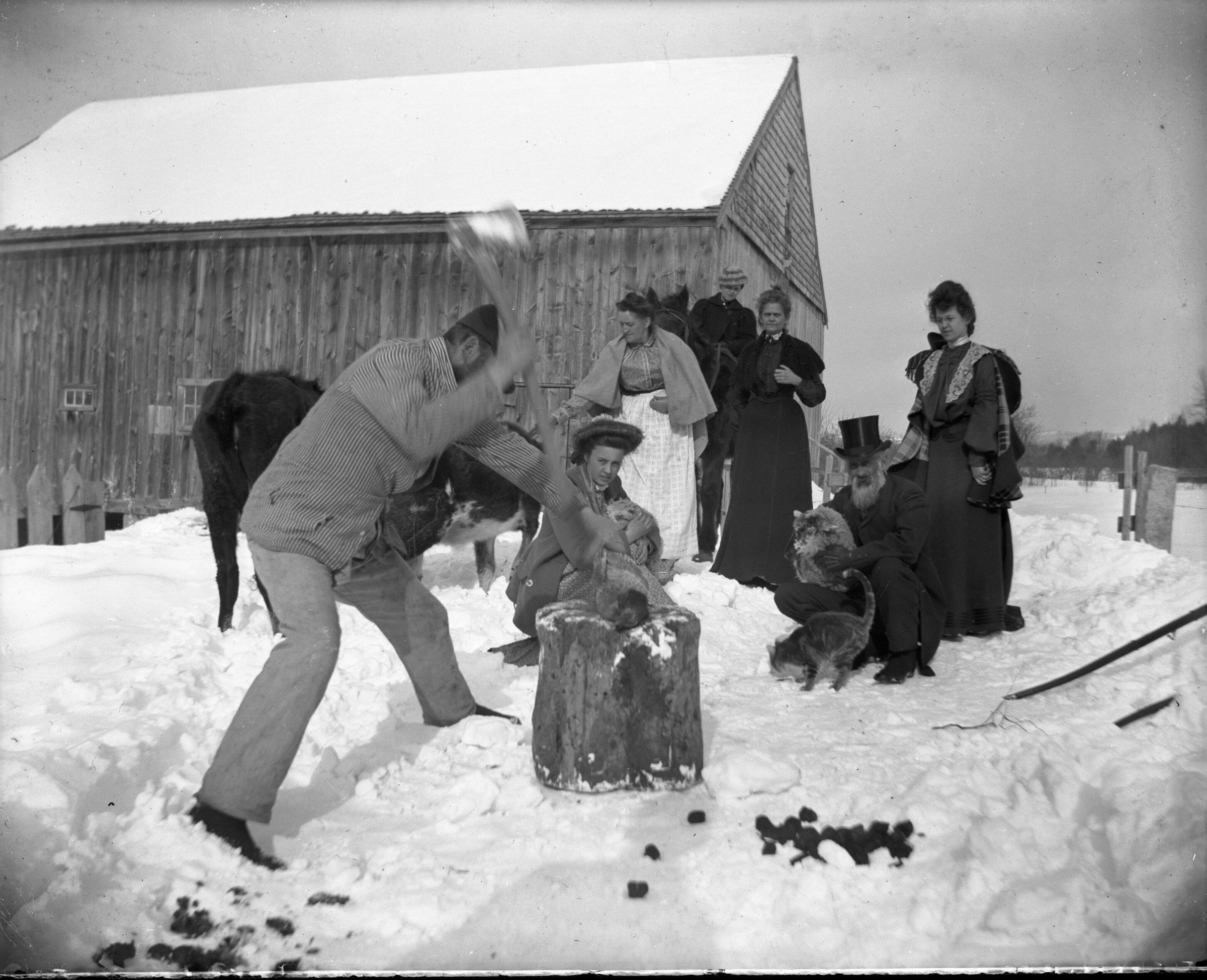Glass plate negative photo of George Edgar Lane beheading chickens with an axe at his farm in Limerick, ME. Watching the scene is possibly Francis A Lane, Minnie S Snow Lane, an unidentified woman on horseback, Sarah E Lane Hobbs, Dr. Charles Francis Lane, Eunice Amanda Hobbs Staples. Circa 1907.