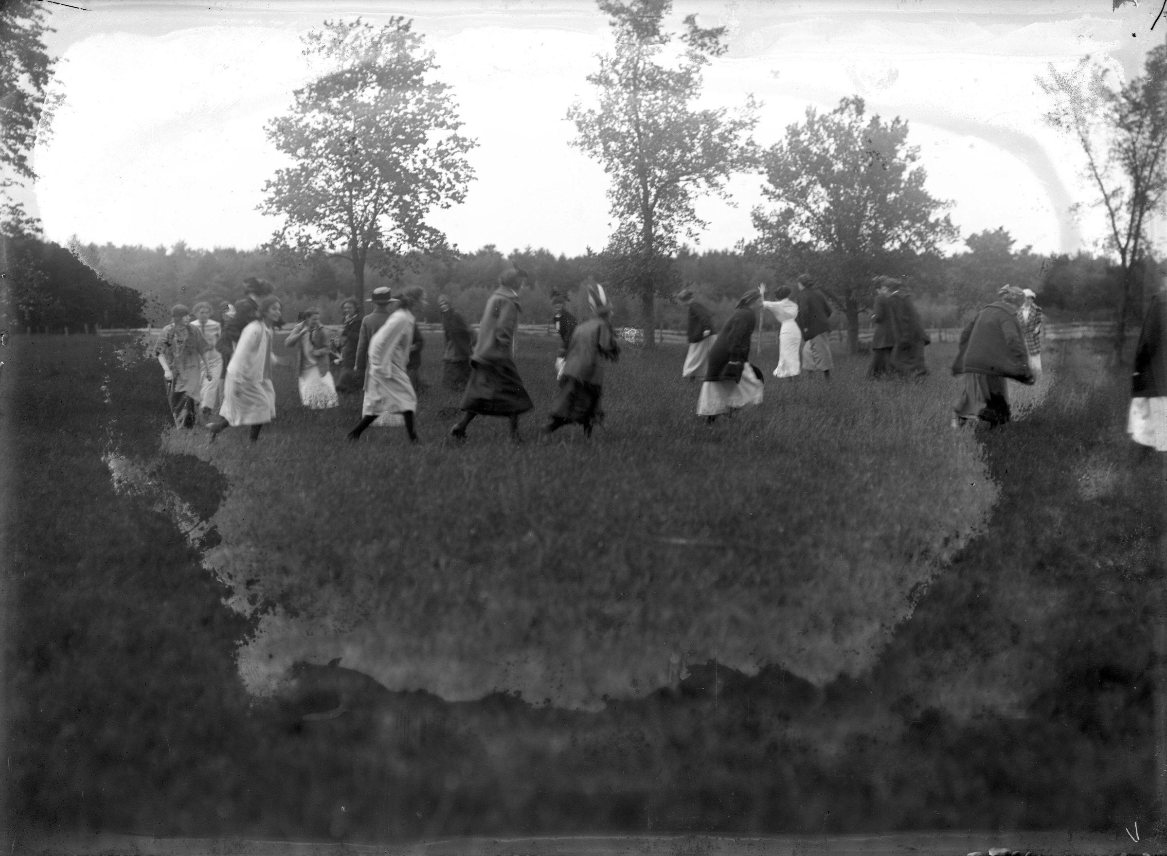 Glass plate negative photo of students dancing in costumes for the Thornton Academy Centennial Celebration, June 19, 1913. Thornton Academy put on a "History of Saco" pageant to celebrate the founding of the school. (Also see 2021.24.85 though 2021.24.90)
