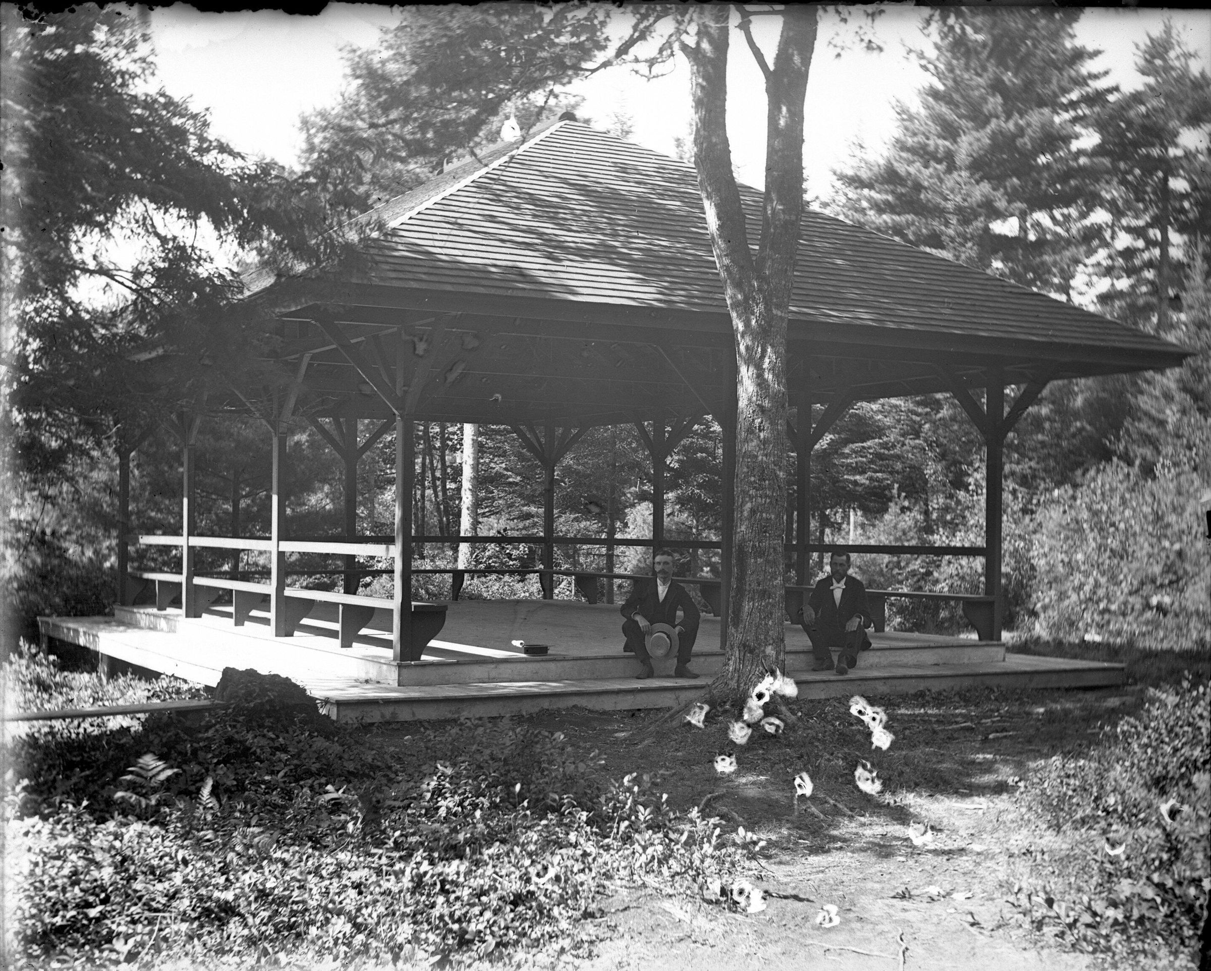 A glass plate negative photo of two men sitting in front of a roofed pavilion.