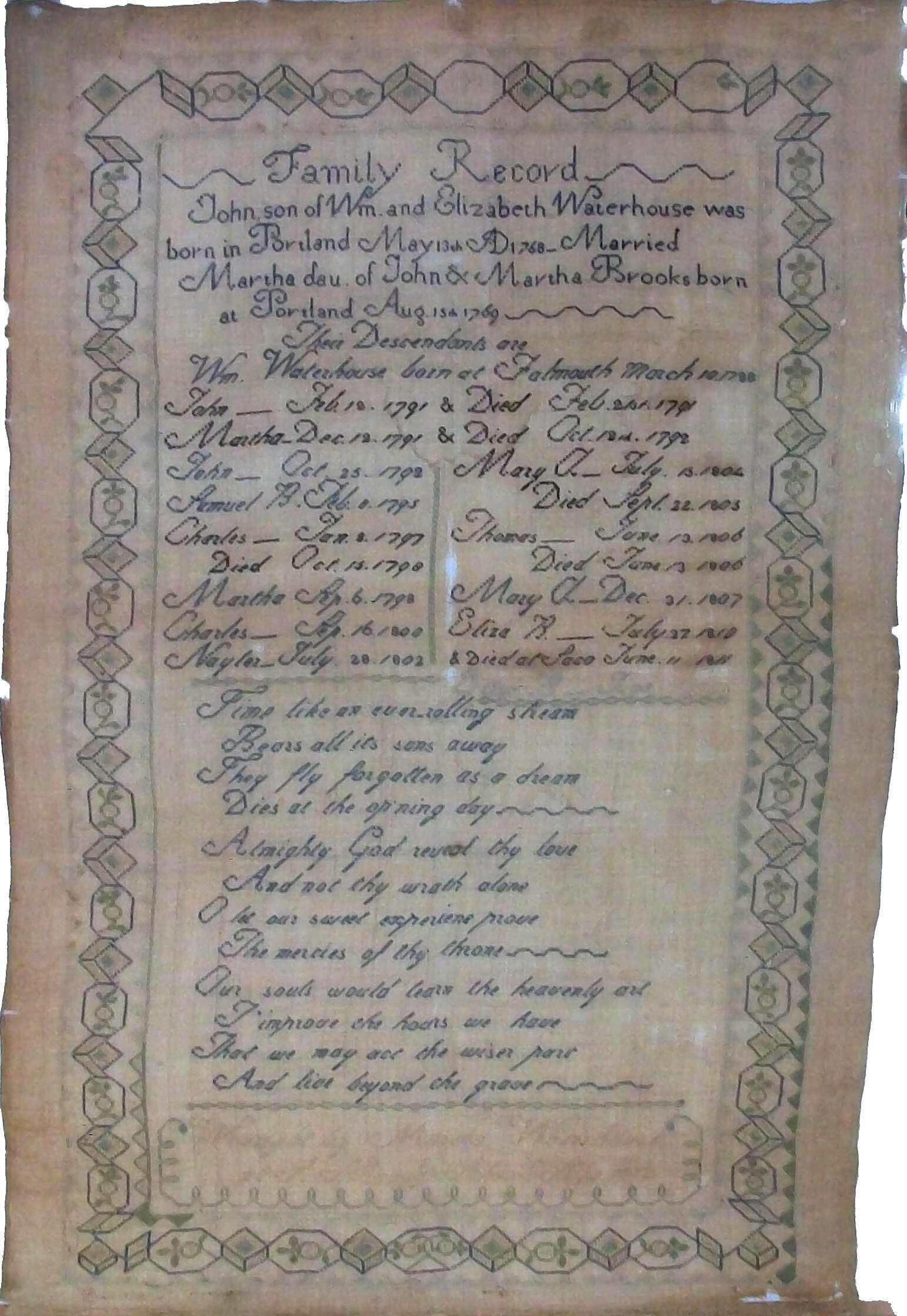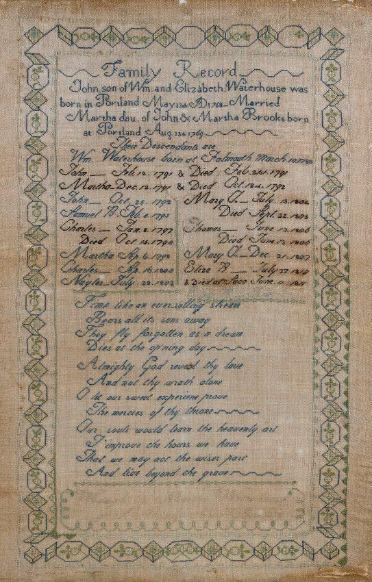 Family register sampler made by Martha Waterhouse in 1812. Work in silk thread on linen in cross, straight, and satin stitches in shades of blue and gray, with black thread used for death dates. Geometric border in blue and gray. embroidery thread on linen. Embroidered in blue thread for living relatives, black thread for deceased. Borders worked in shades of blue and grey. Embroidered text reads: