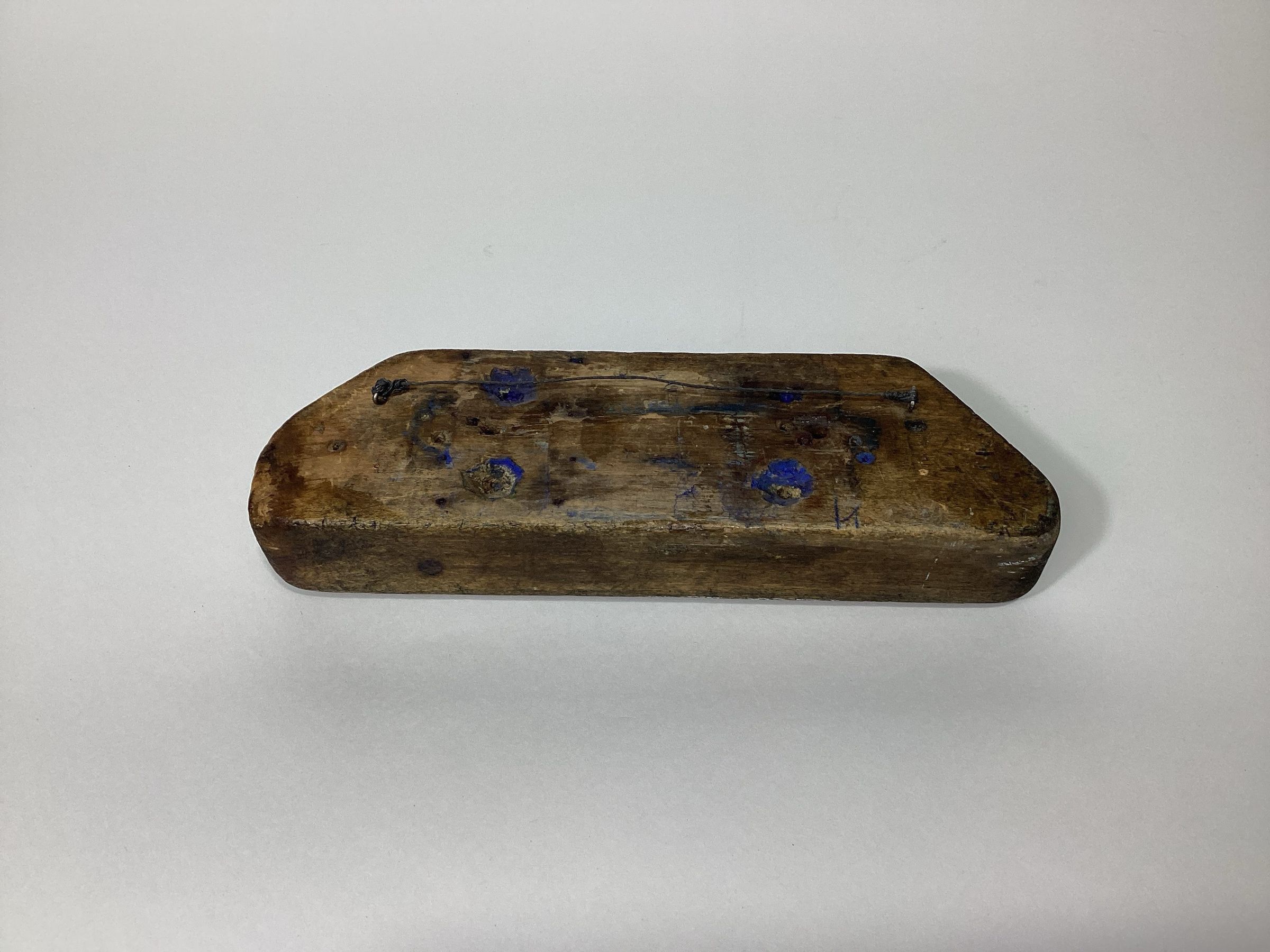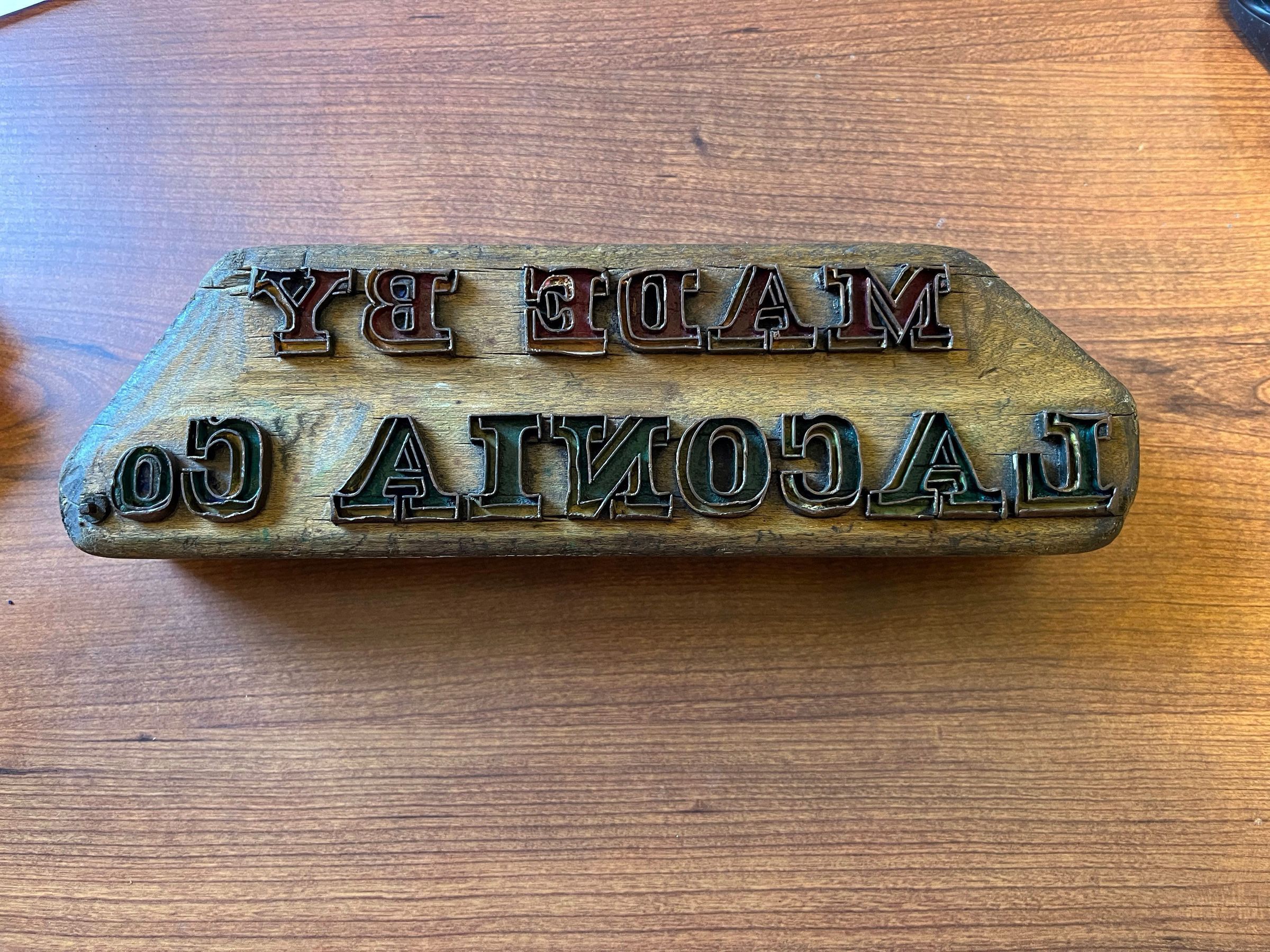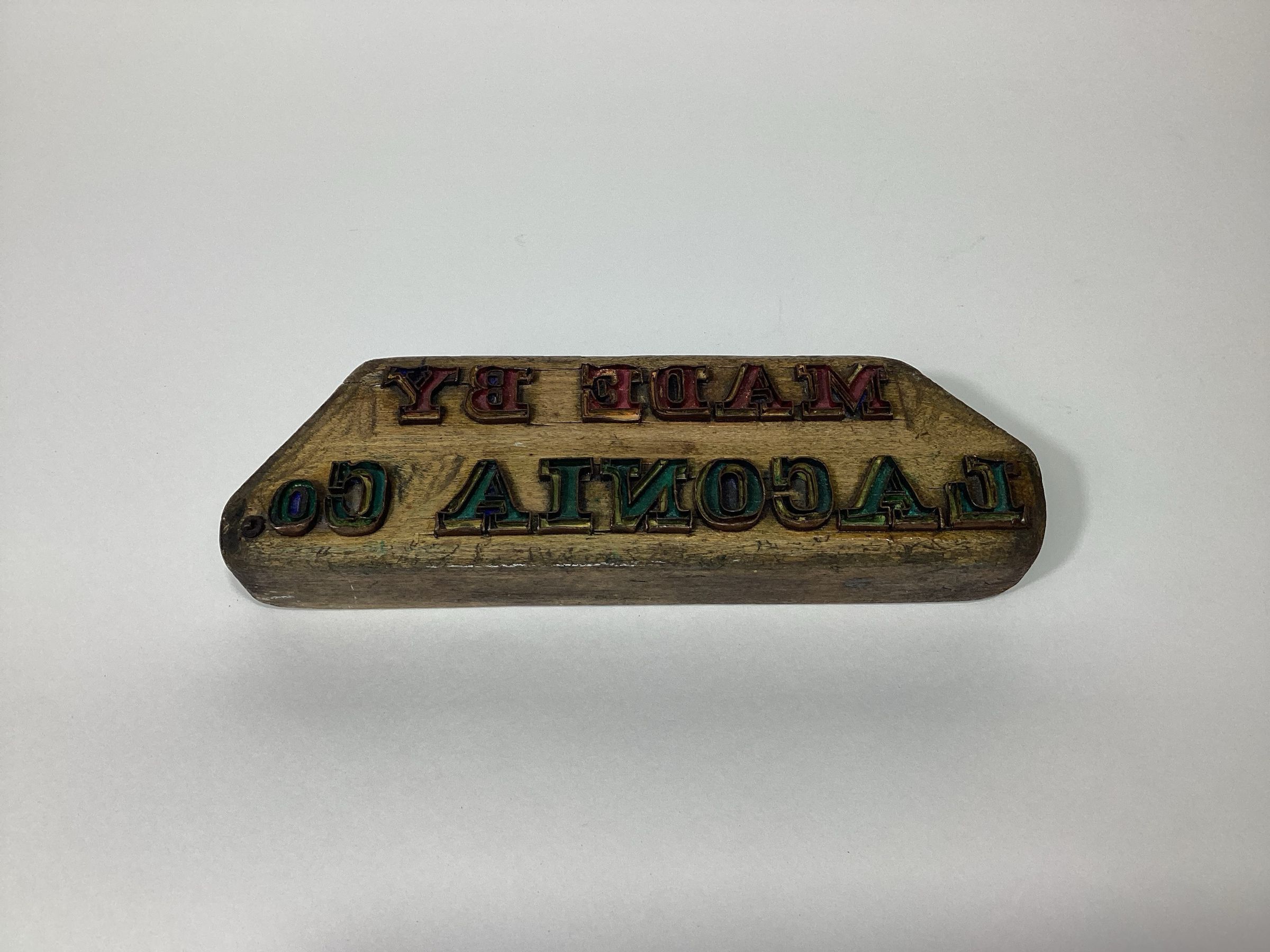 Copper strips are set into a wooden block to form the pattern depicting one of the trademark patterns of the Laconia Mills. The strips form the words "MADE BY / LACONIA CO." Later paint in red, green, and blue, "enhance" the letters. Holes on the back also indicate where a pair of metal brackets would have been originally attached.Dimensions