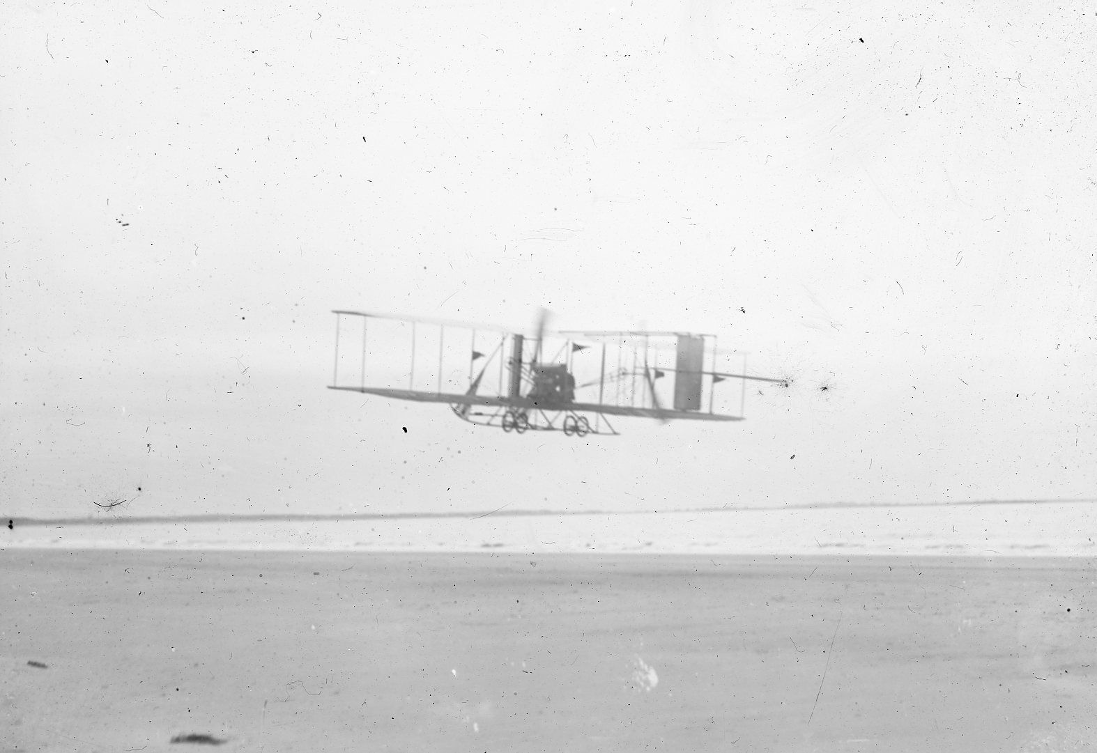 Glass lantern slide of a biplane flying over Old Orchard Beach.