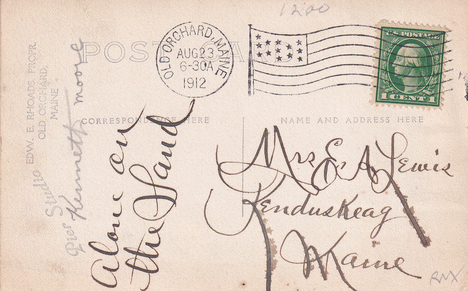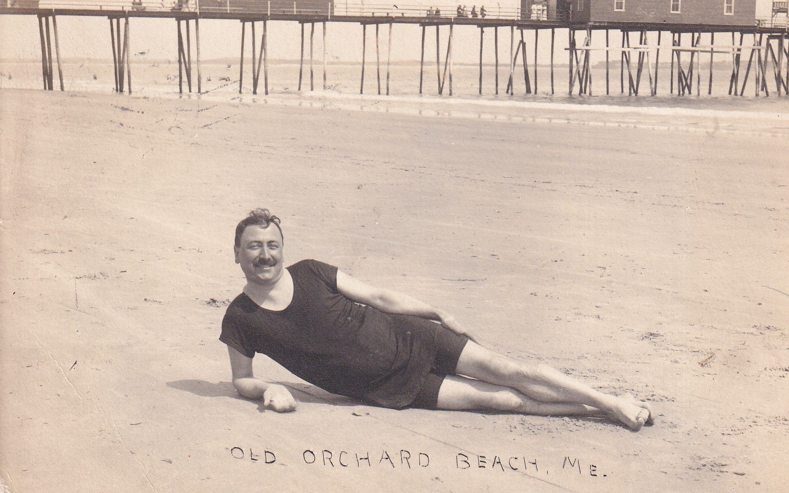 A postcard bearing a black and white photograph of a man reclining on the beach.
