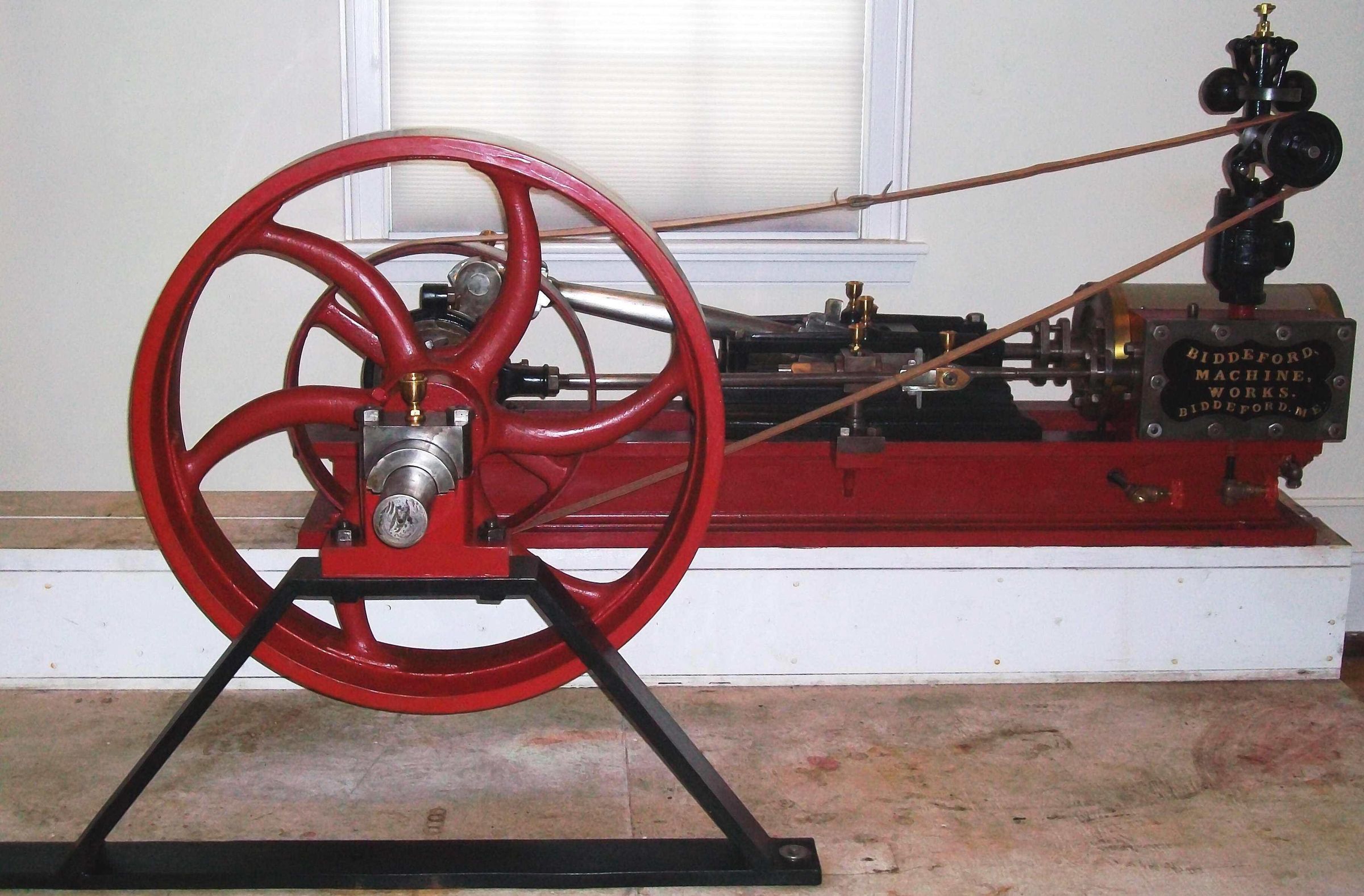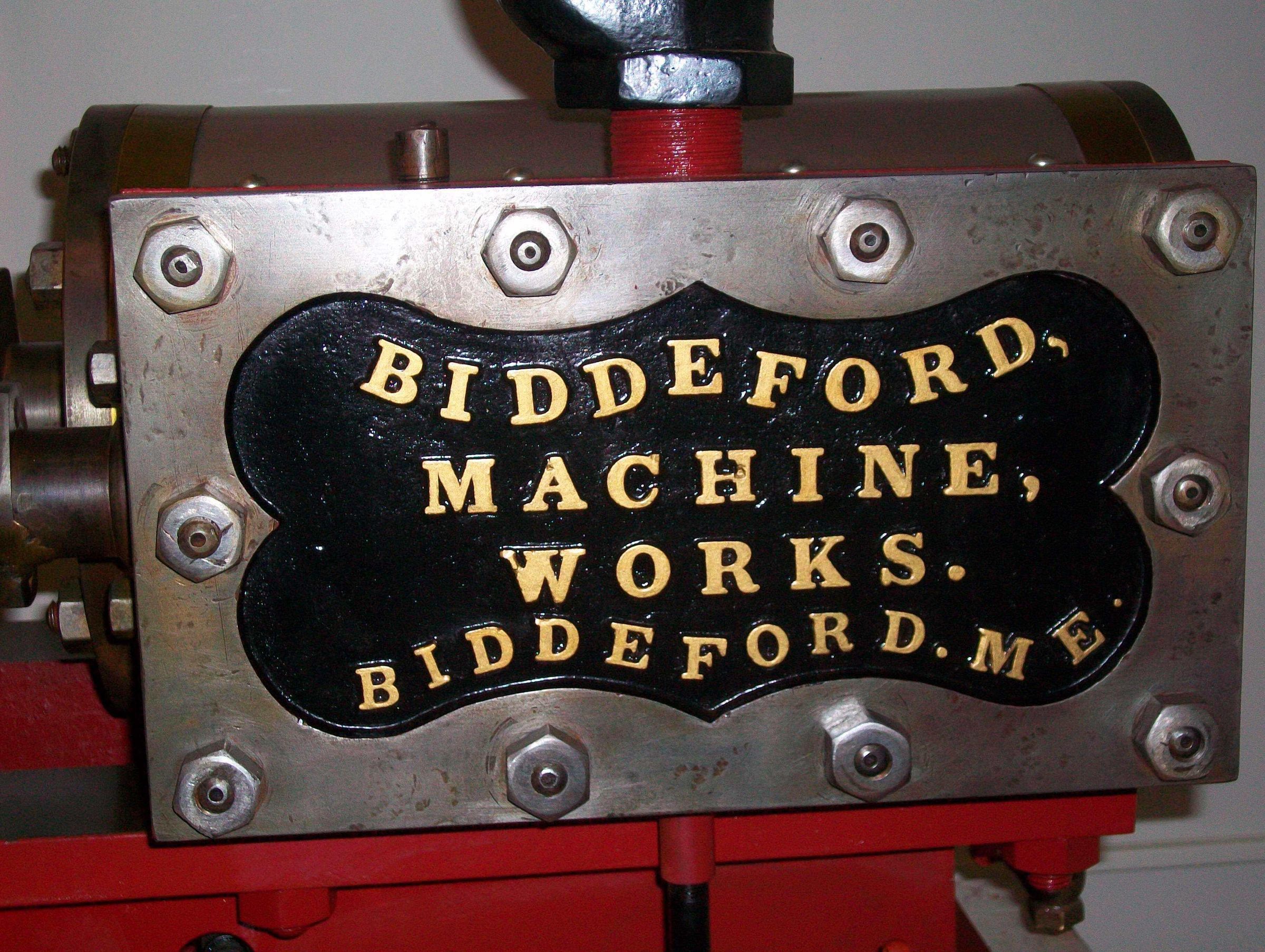 Single cylinder double-acting horizontal steam engine made by Biddeford Machine Works. The company was located at the corner of Pearl and Stone Streets (in the general vicinity of where Biddeford's Mechanic Park now is). It appears in Biddeford city directories from 1880-1886. The managers were Nathaniel and Herbert L. Currier of Saco, who lived on Elm and Beach Streets in Saco. This is a stationery engine used to pump and drive mills and factories - possibly the mills on the islands in the Saco River. There is a brass plate with the name "Biddeford Machine Works, Biddeford, Me."Dimensions