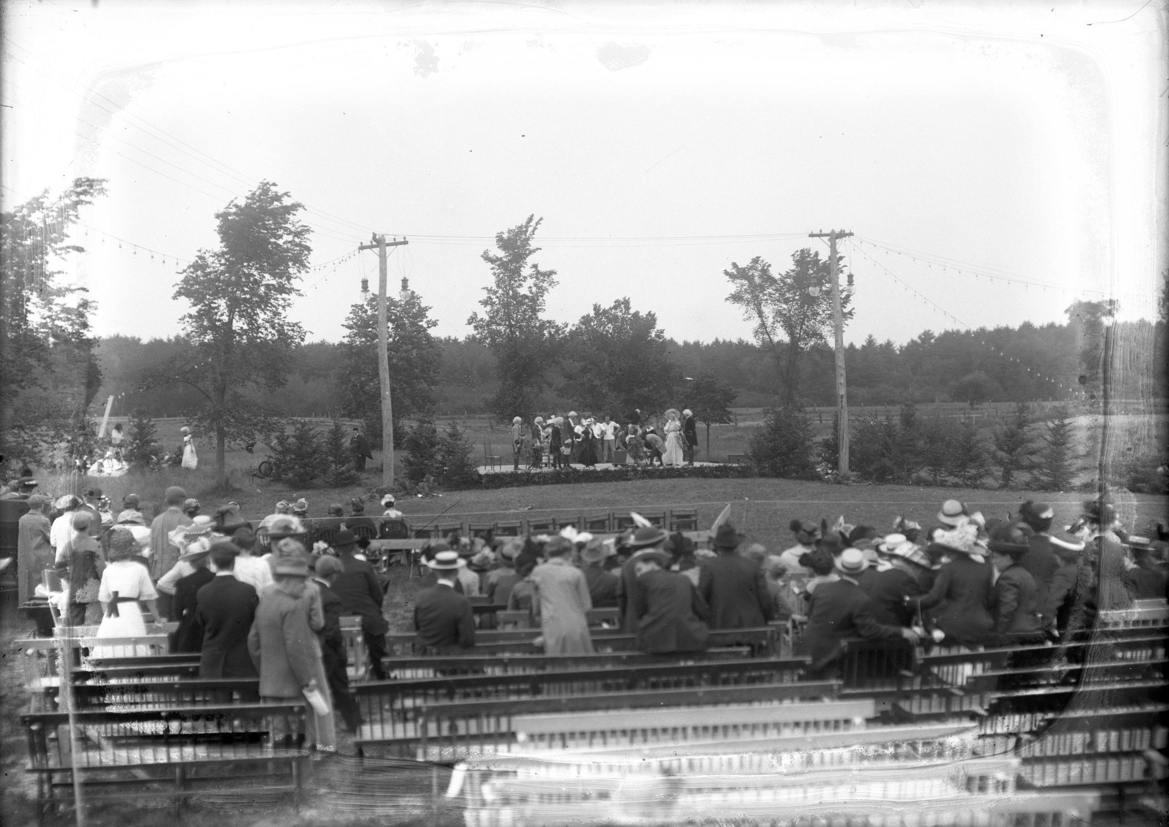 Glass plate negative photo of the Thornton Academy Centennial Celebration, June 19, 1913. Students perform a scene depicting Sir William Pepperell receiving guests from England. Thornton Academy put on a "History of Saco" pageant to celebrate the founding of the school (also see photo of program booklet from Dyer Library archives).