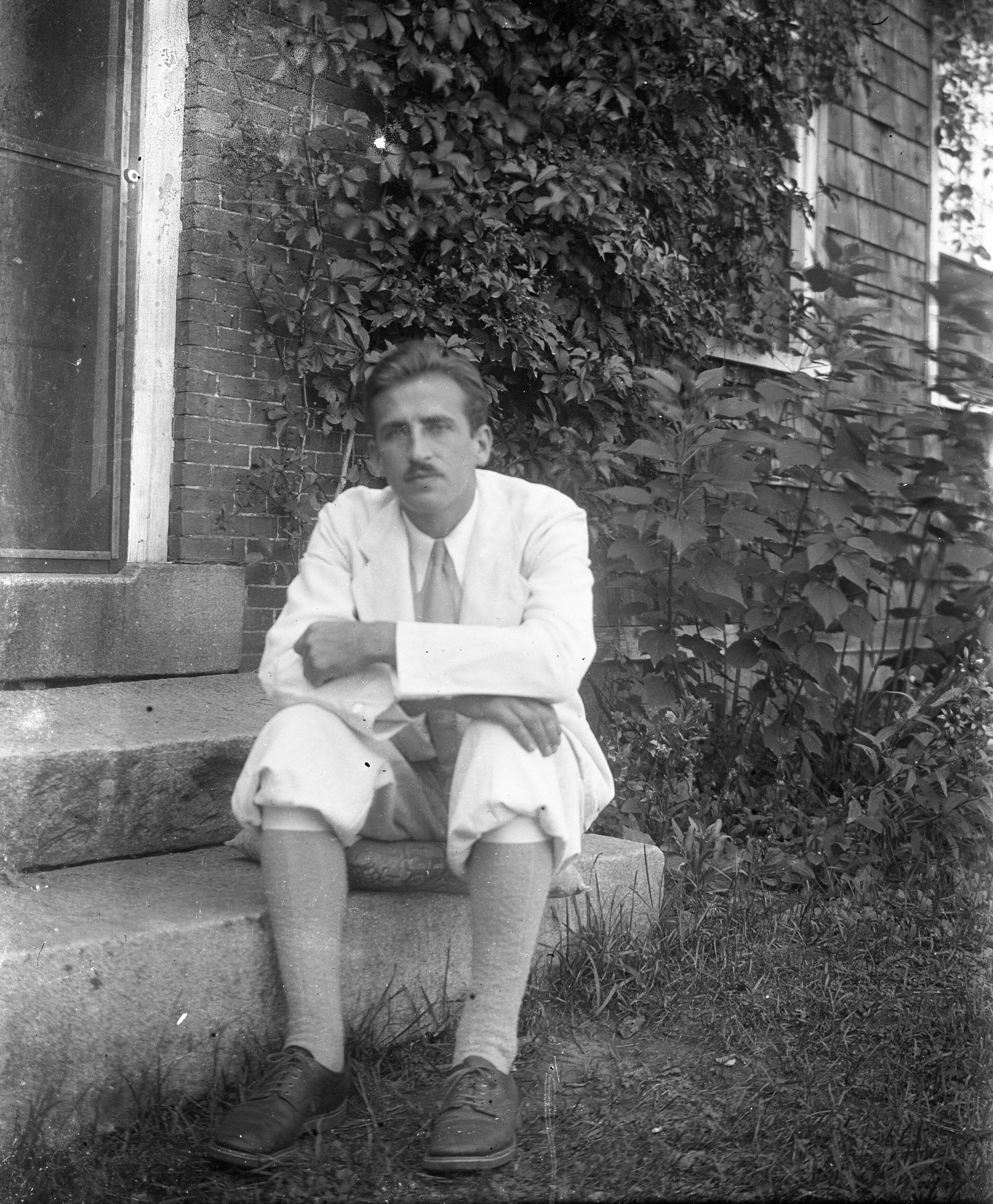 Glass plate negative photo of Charles A. Bradbury (older) sitting on steps.