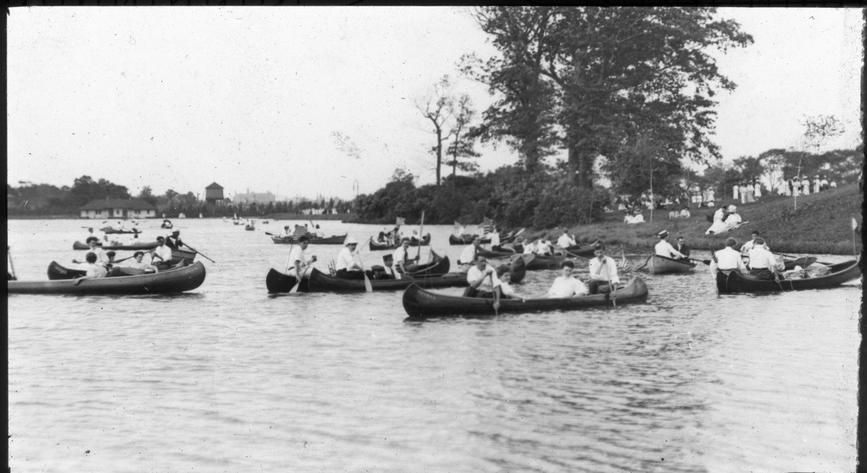 Glass lantern slide of a canoe park. "Canoeing" is written on a "Essex Camera Club, Newark, NJ" label. This photo appears in "The Cities on the Saco" (1985) by Jacques Downs (page 153), but the photo was likely taken at Branch Brook Park in Newark, NJ.