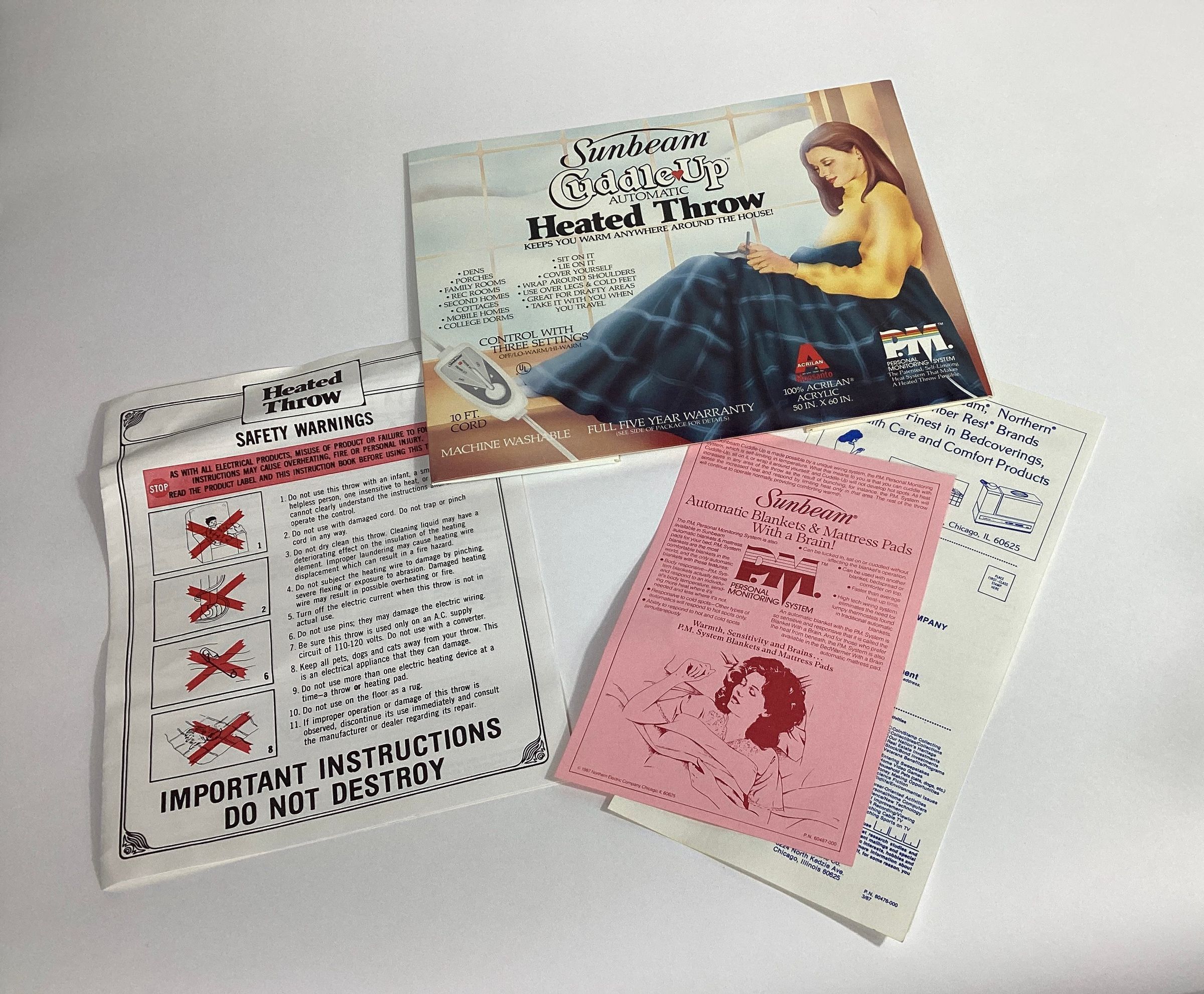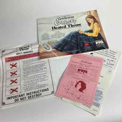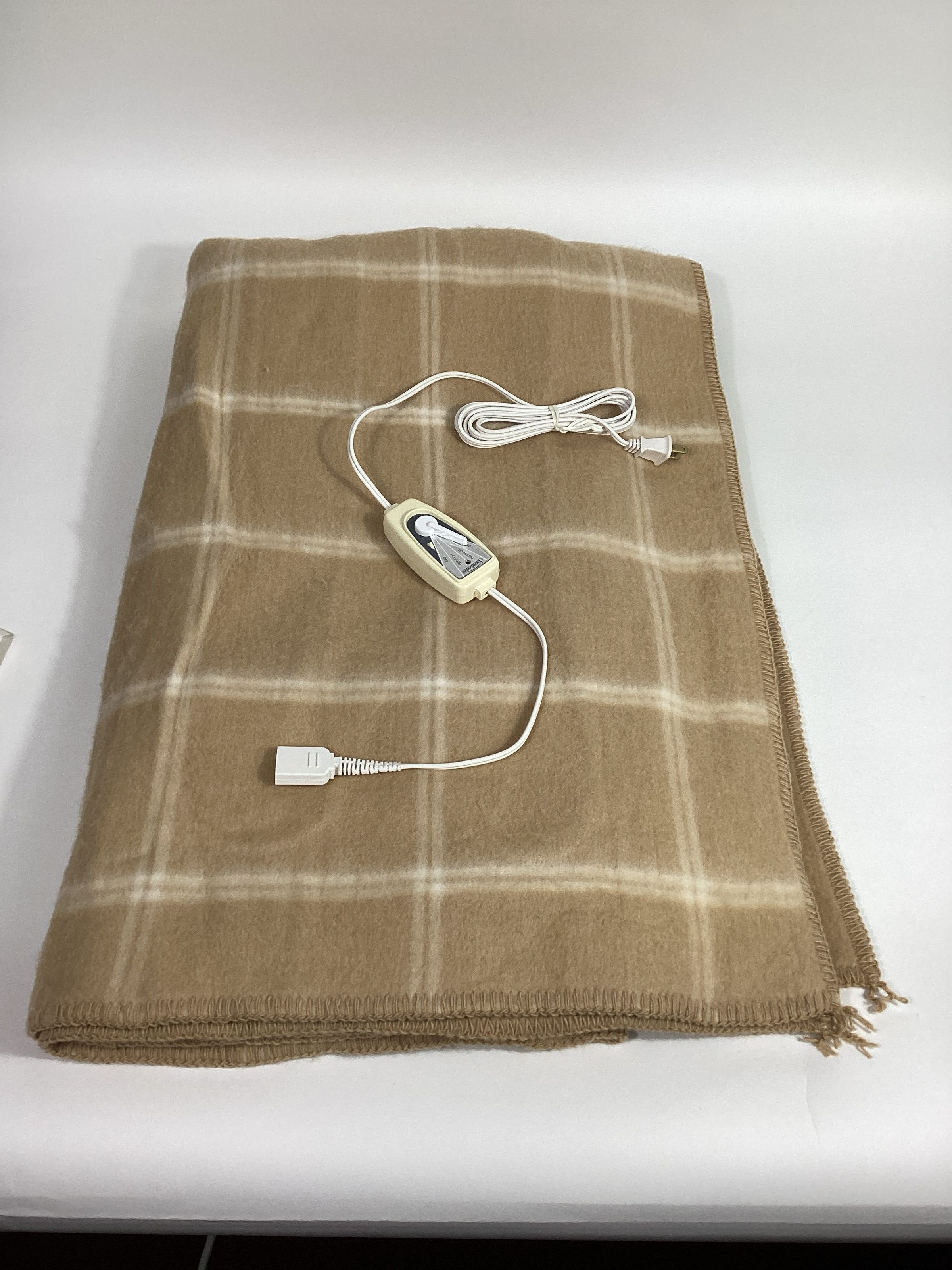 Twin-size tan nylon blanket with double cream-colored stripes in a square pattern. Single electric heat control. Retains its original packaging insert and paper instructions.