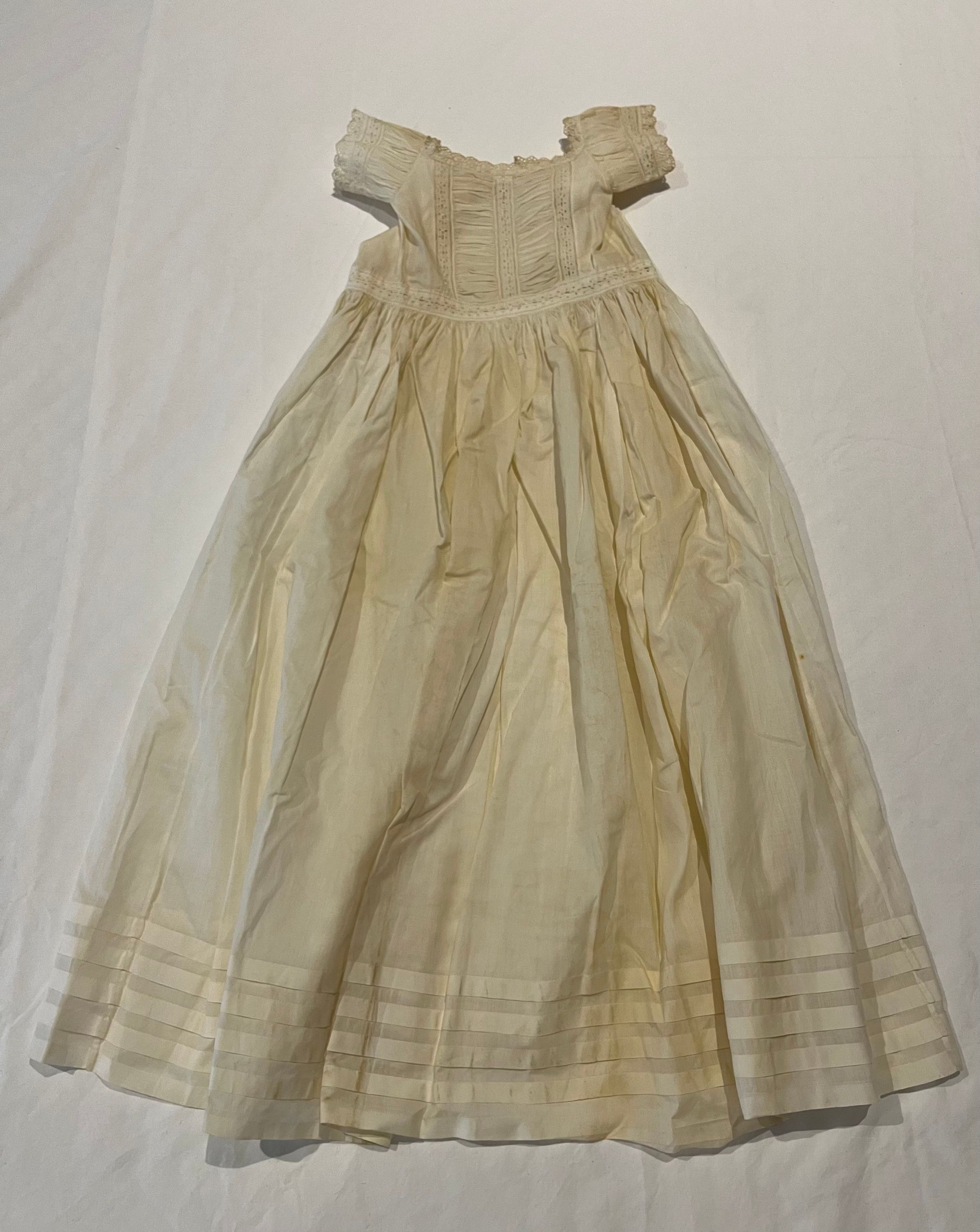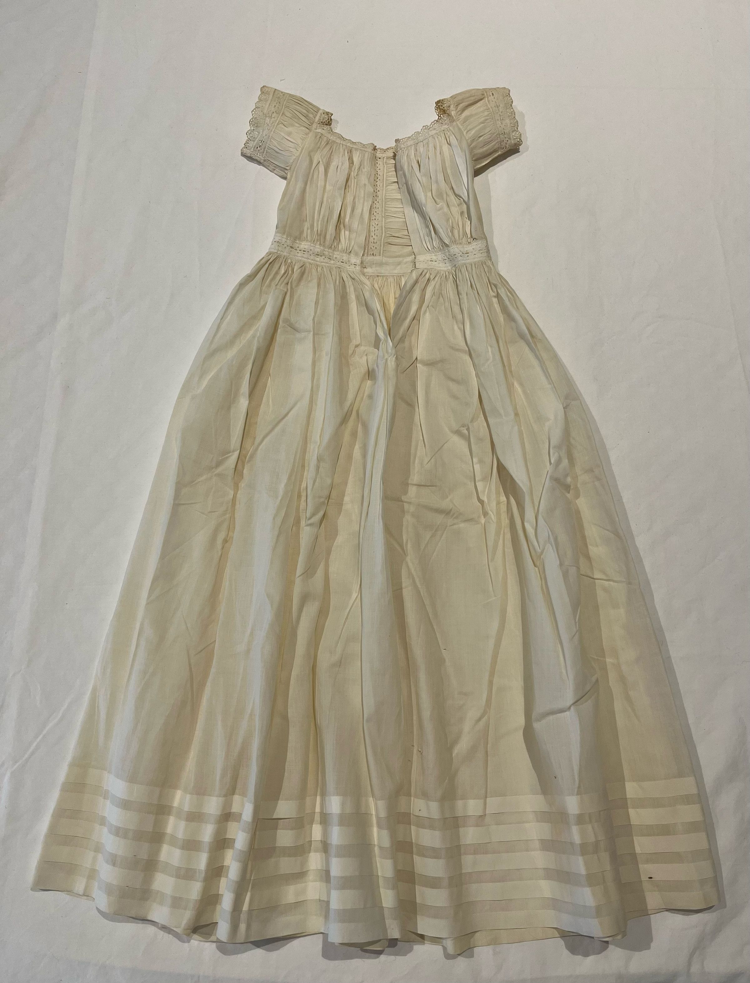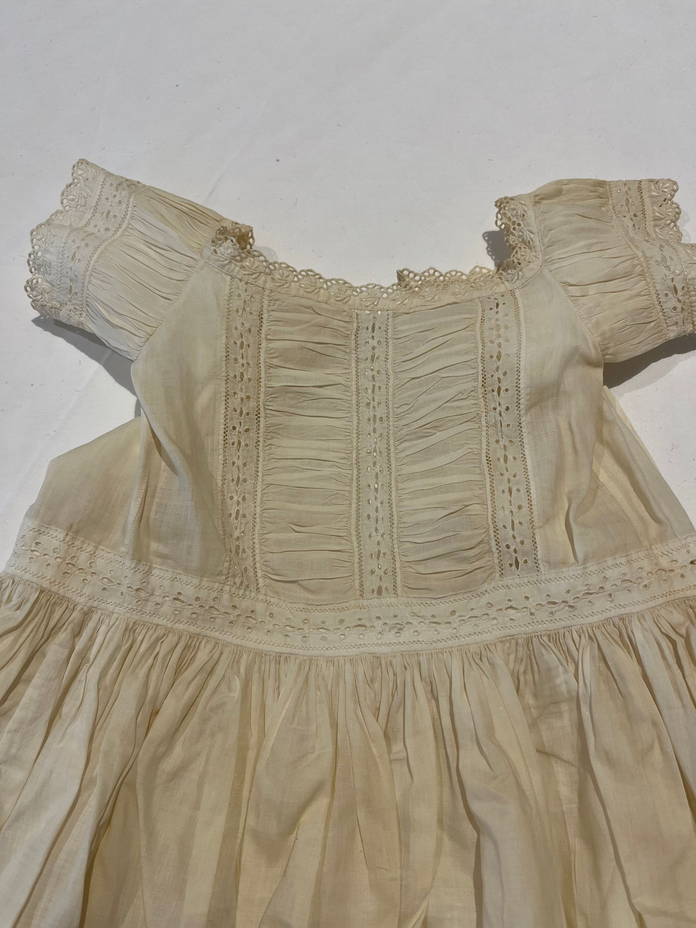 White lightweight cotton christening dress. Square neck trimmed with eyelet. Three vertical rows of eyelet with panels of horizontal gathers in between. Short sleeves with the same gathers trimmed with eyelet at the hem. Eyelet around the waistband. The skirt has four pleats above the hem. Opens in the back with a thread eye but no hook or button. Machine sewn.