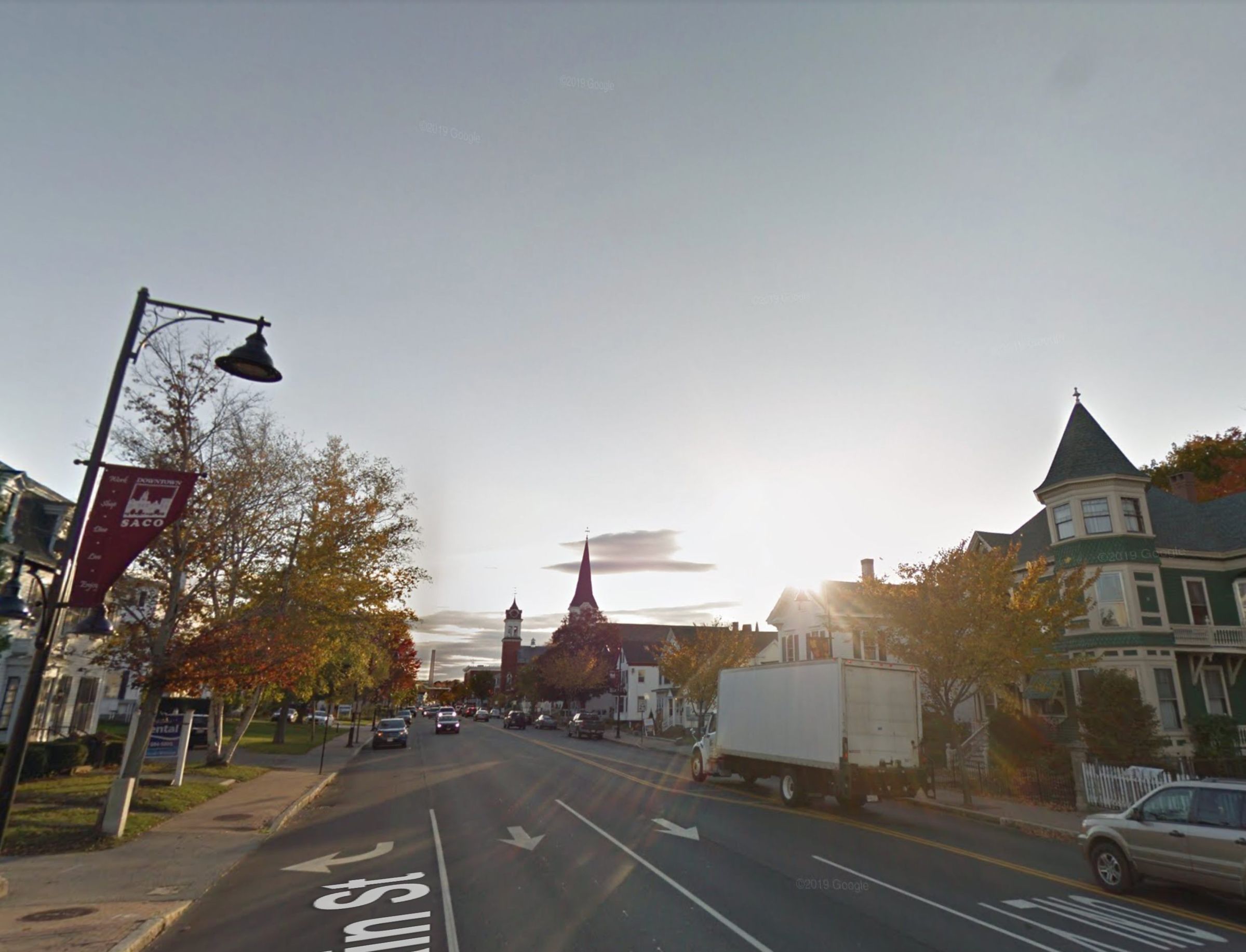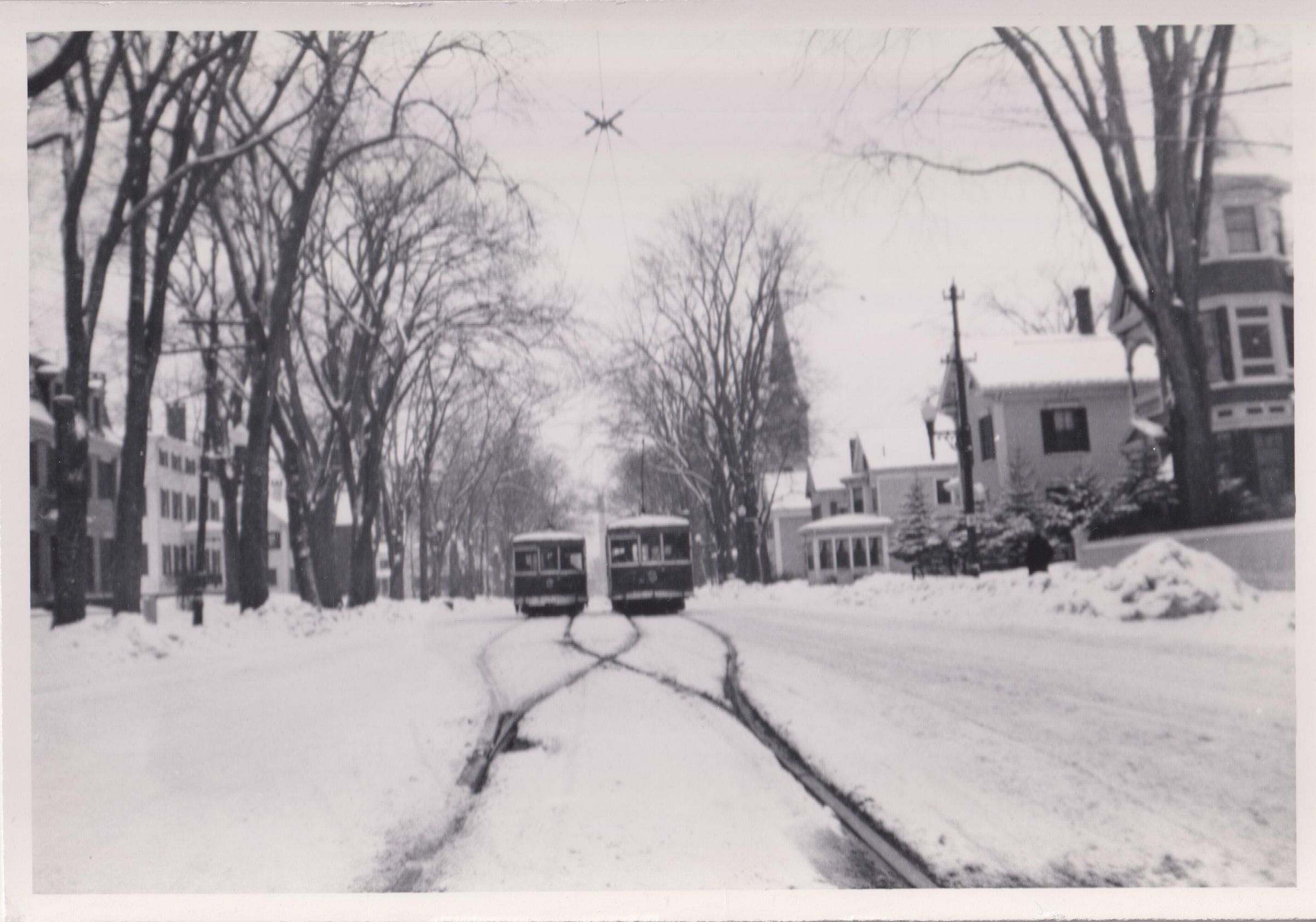 Black and white photograph of two trolleys crossing at "Nourse's Turnout" on Main Street, Saco, in the snow. The Queen Anne style Emma Hall House (1892) can be seen on the right, and the mansard roof of the Cornelius Sweetser House (1816) can be seen on the left. Although not pictured here, the Frank Nourse House, also known as the York Manufacturing Company Agent's House (1889), is to the right of the Emma Hall House. "Nourse's Turnout" was named after Frank Nourse, the first York Manufacturing agent to live at the house.