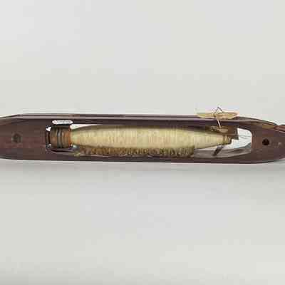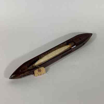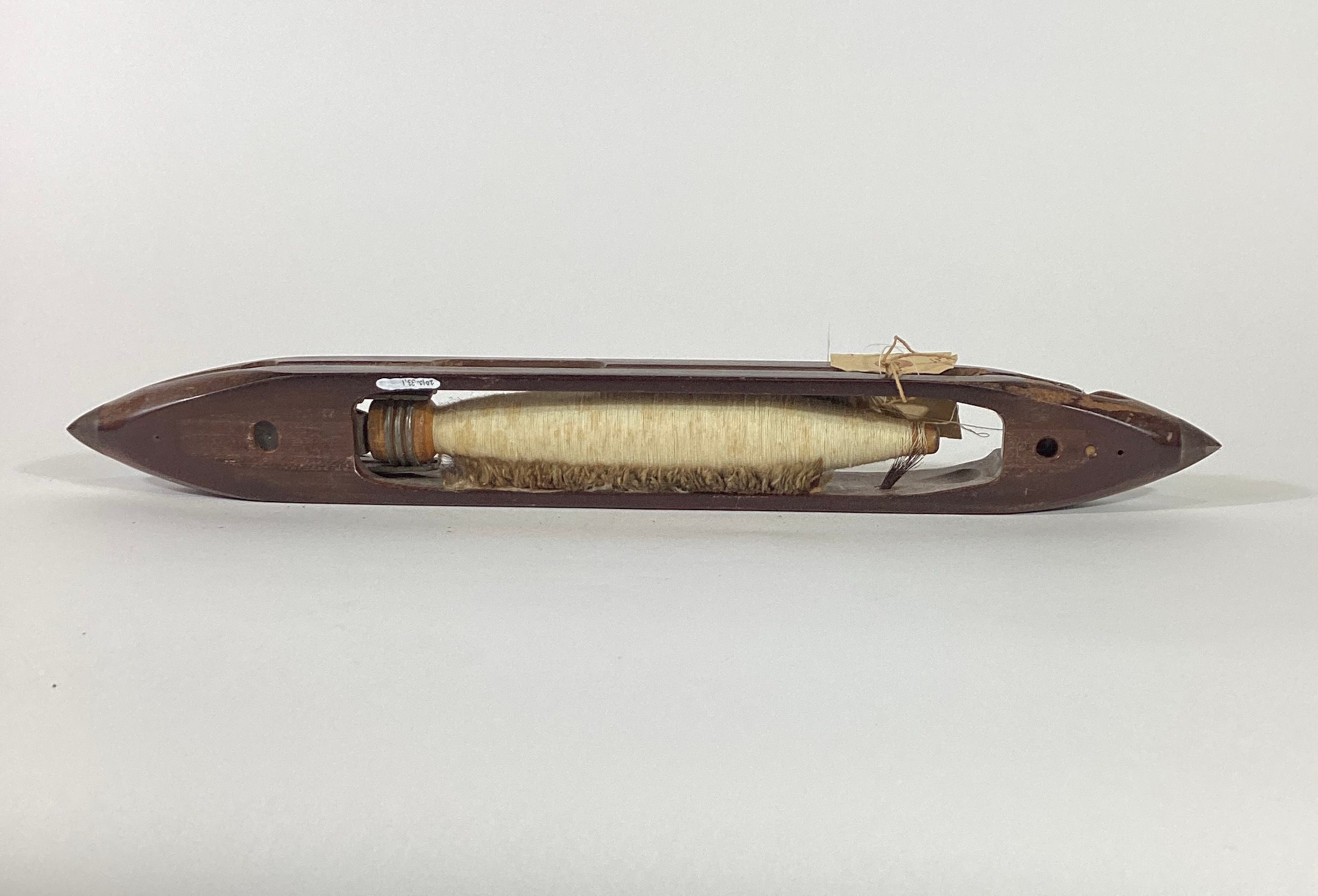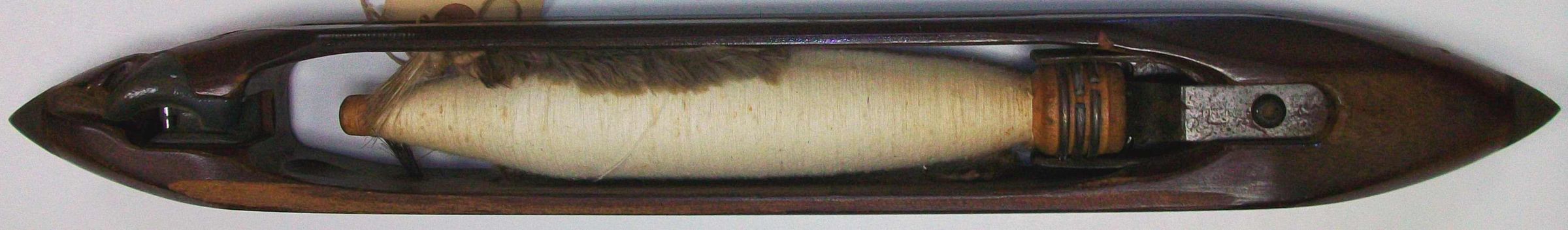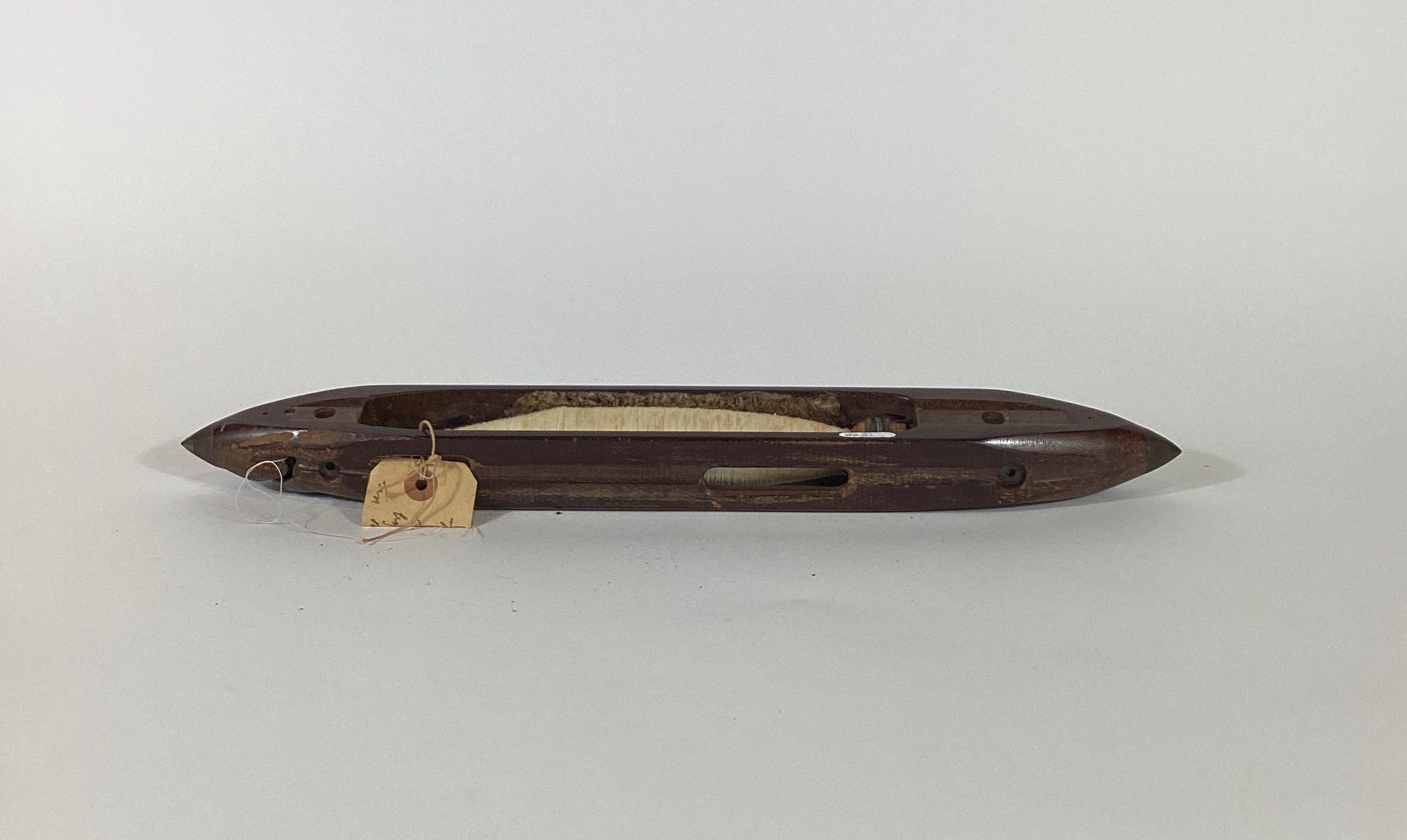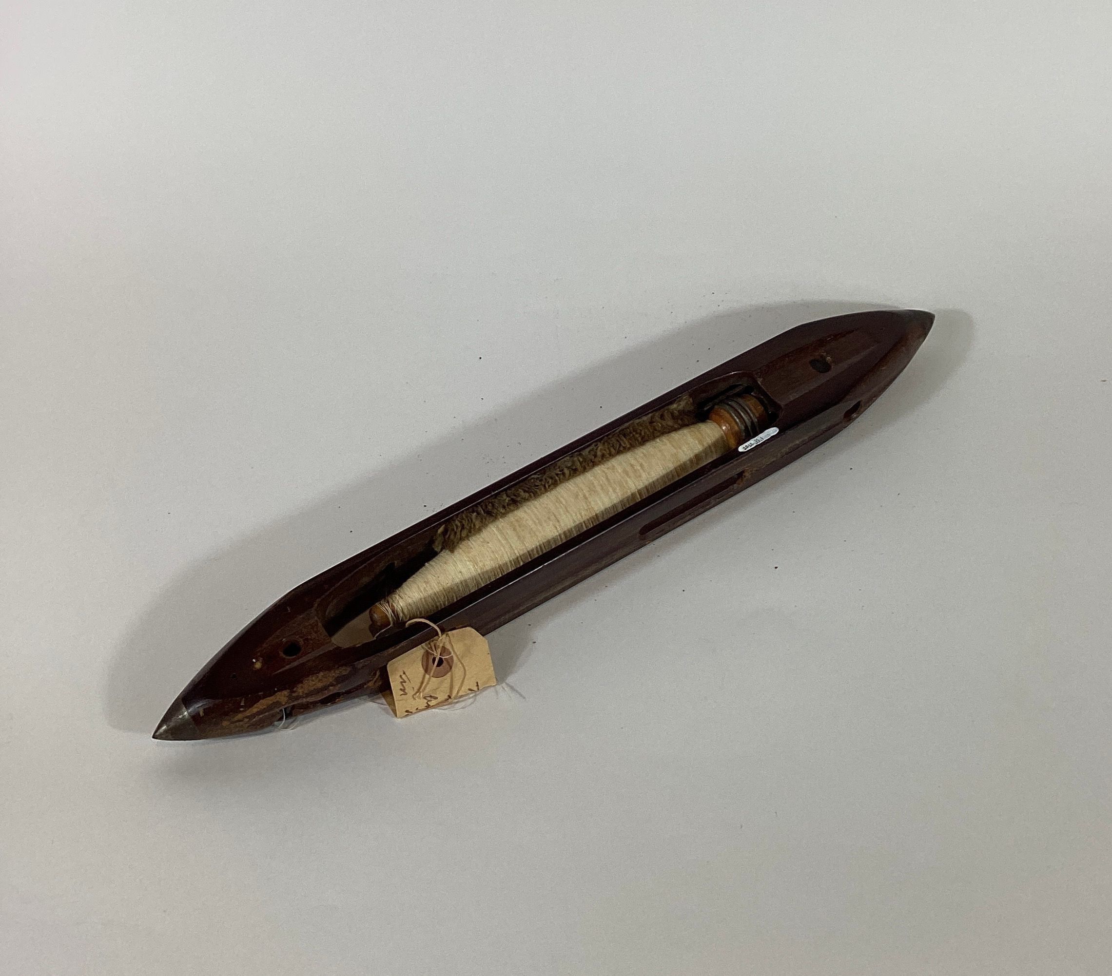Wood shuttle with bobbin filled with off-white thread in center. This was the last shuttle used by Pepperell Mill in Biddeford.