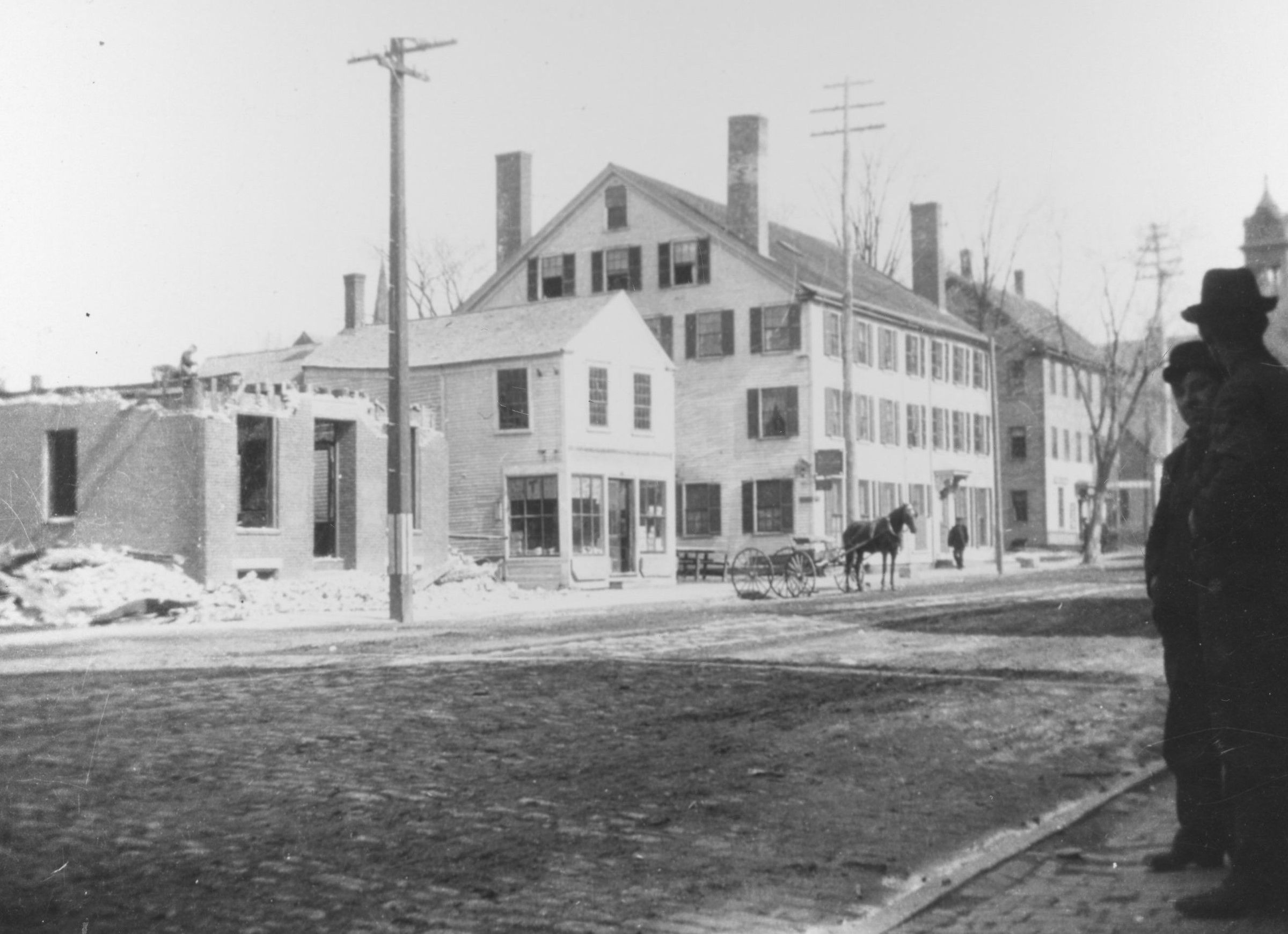 A print photograph of "Joker's Corner" on the corner of Main Street and Pleasant Street being dismantled to make way for the Masonic Block in 1907. The J.W. Beatty & Co. mill supplies and leather belting store on the left is almost completely dismantled while the Edwin D. Thomas grocery store is being emptied. The old Thornton House, then known as The Wallace" is still standing in this photo.