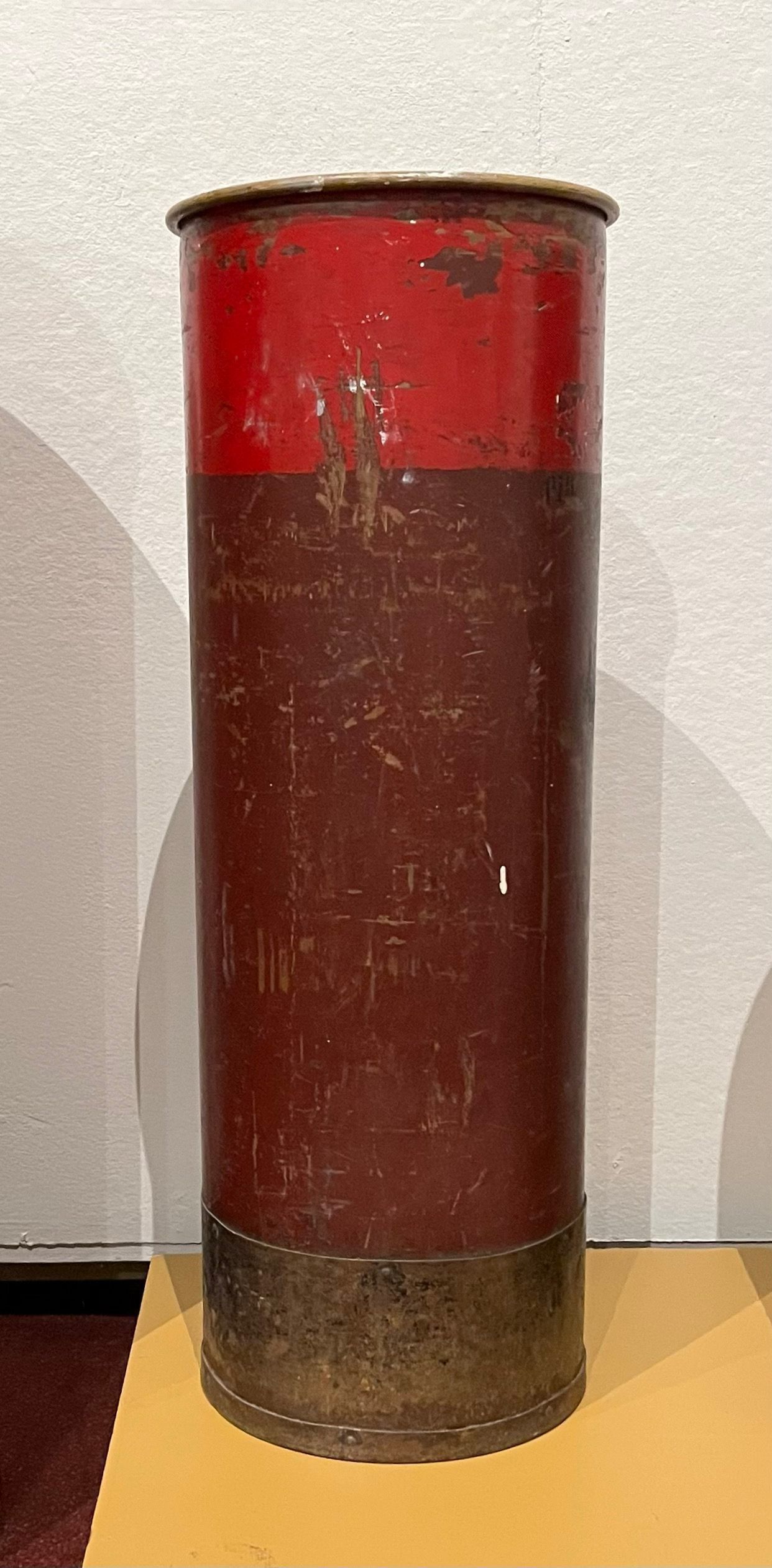 Sliver can with a rolled top and seamless sides of some type of composite material and a metal bottom. Painted red.