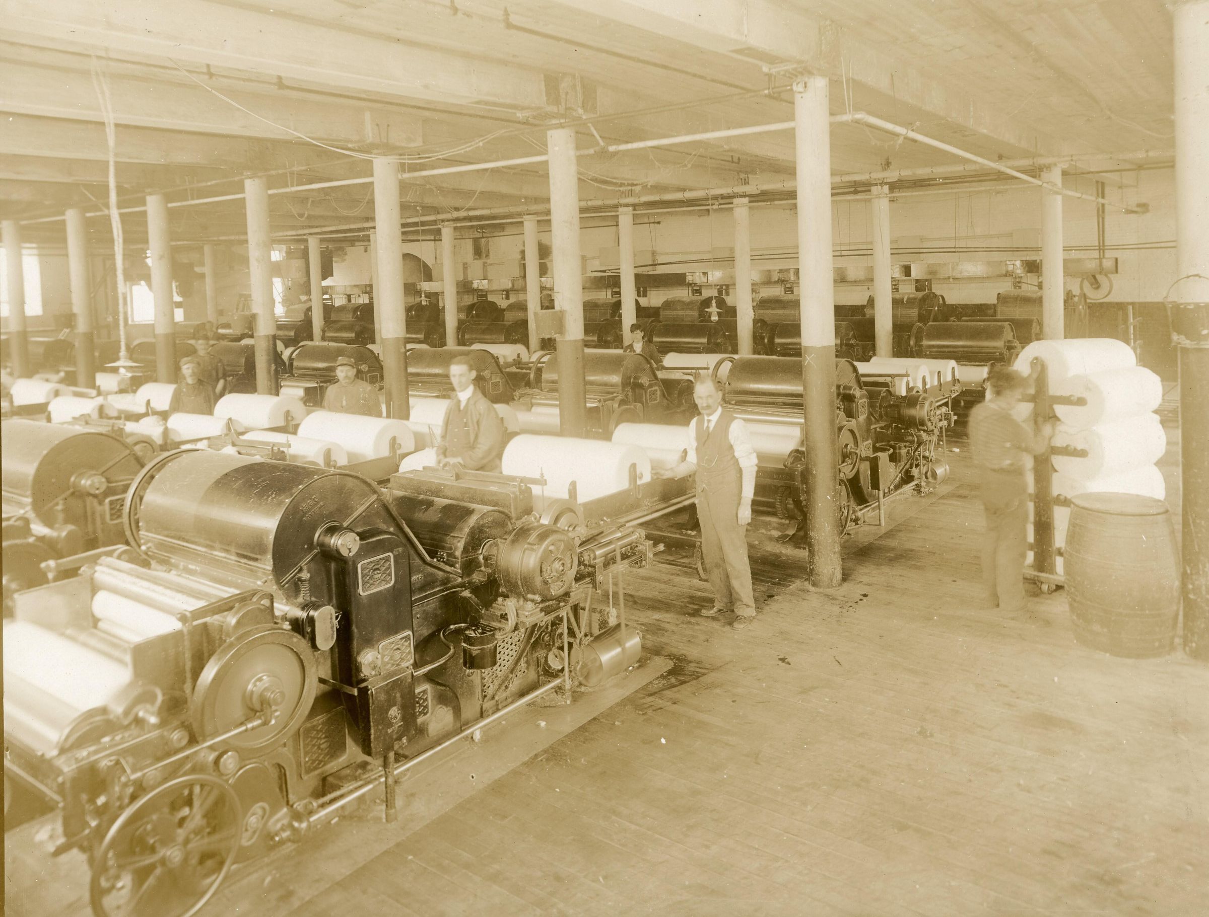 Photograph of workers in a picker room in the Laconia Division of the Pepperell Manufacturing Company. Laps of cotton moved from the opener picker through an intermediate picker and then were fed into a finisher picker. After that, the product of the finisher picker went to the carding machine. The picker machines cleaned the cotton by using fans and beaters and then formed it into rolls of uniform thickness.