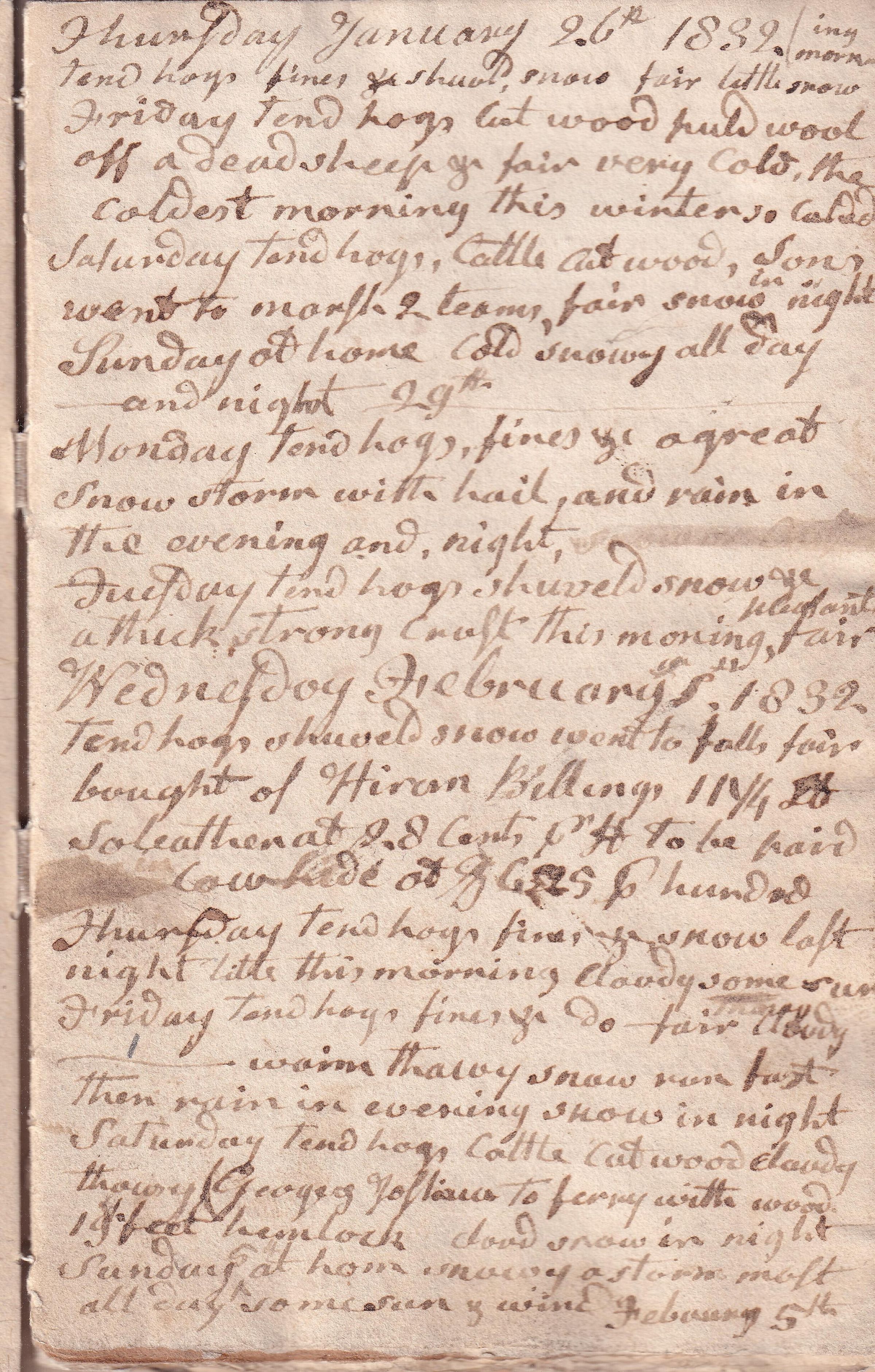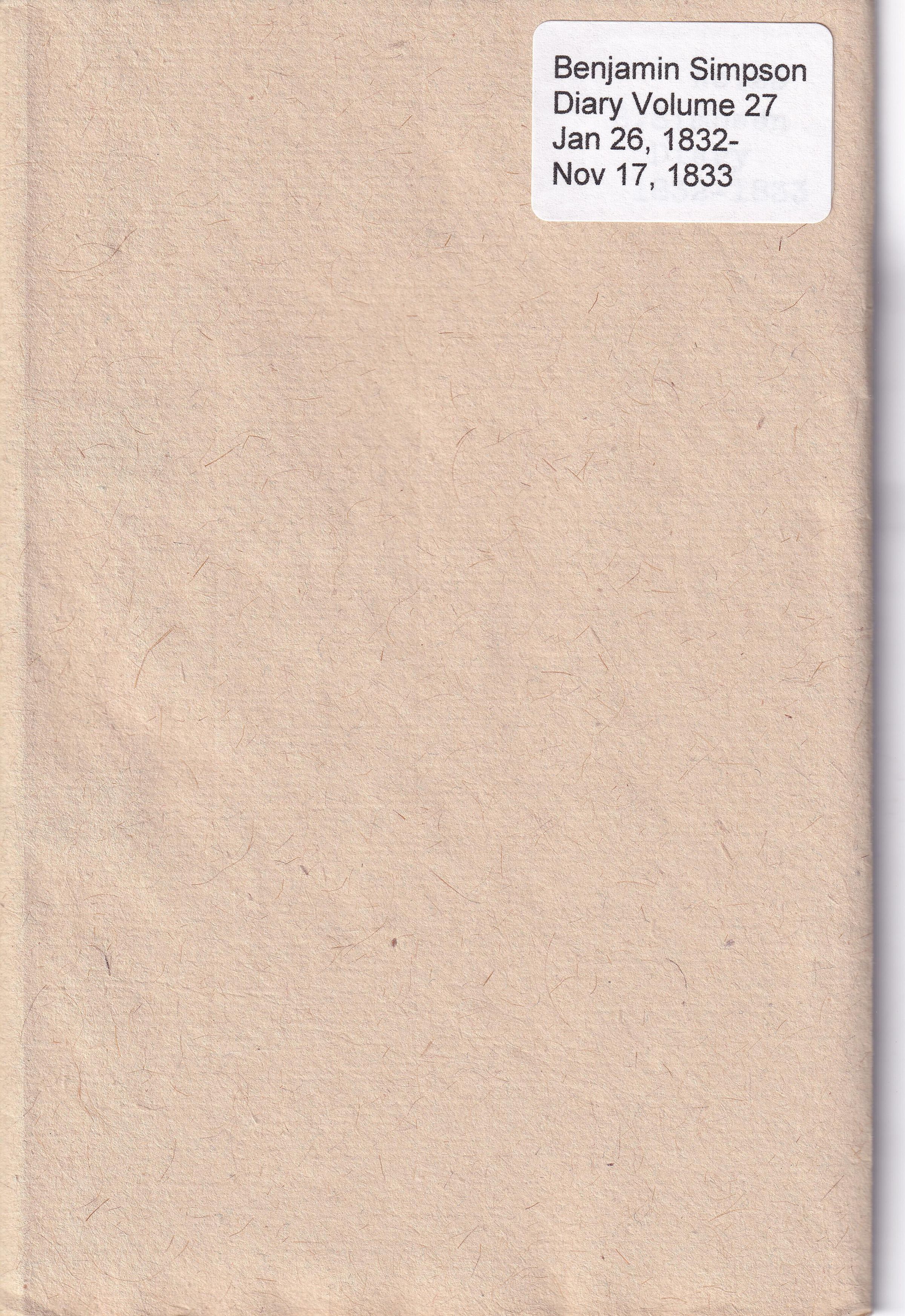 Twenty-seventh volume of the diary of Benjamin Simpson of Saco, 1781-1849. This volume covers the period January 26, 1832 through November 17, 1833; there is a gap in the diaries between October 1830 and January 1832. It is handwritten in ink on rag paper with a handsewn binding; it is now housed in a modern paper cover. Most of the entries are a single line. The date is listed at the top of each page, with individual entries (most without dates) listed below. Simpson noted his major task of the day and the weather.