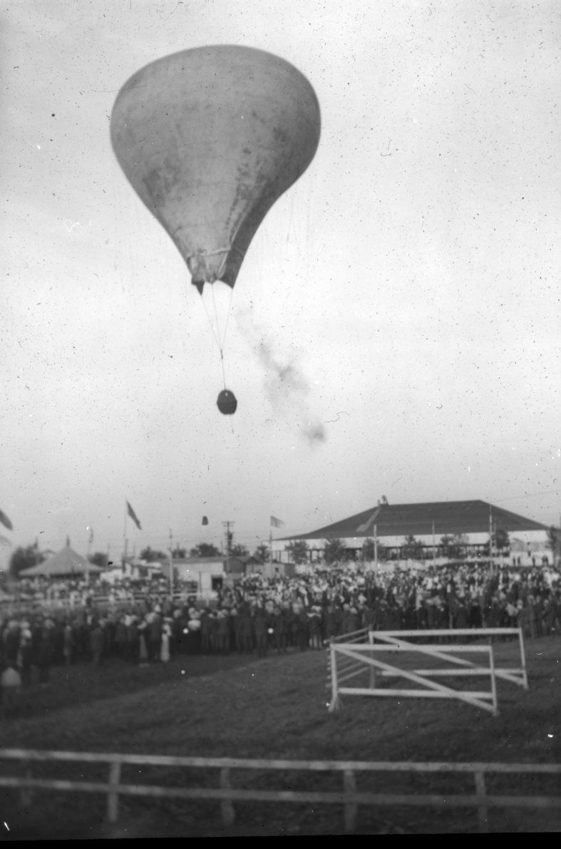 Glass lantern slide of a balloon flying over Hillside Park in New Jersey. "The Bomb, Hillside Park" is written on the label on the slide. This photo appears in "The Cities on the Saco" (1985) by Jacques Downes (pg. 155) but the photo was not taken in the Saco-OOB area.