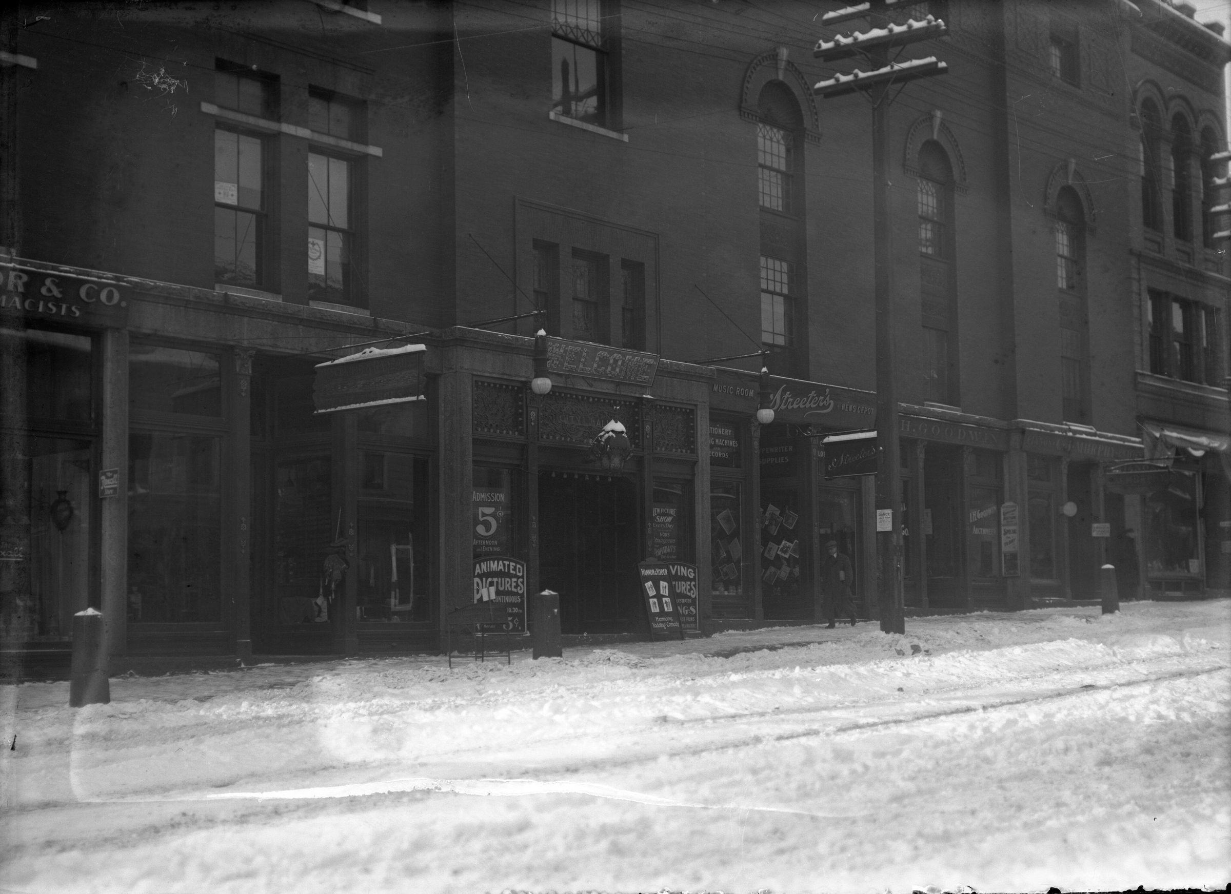 Glass plate negative photo of Biddeford City Opera House, also known as City Theater. Streeter's Music Room and News Depot is also visible, as well as Goodwin Auctioneers and C.J. Murphy Pianos.Made/Created