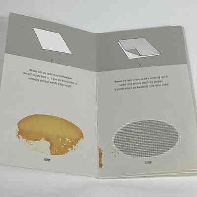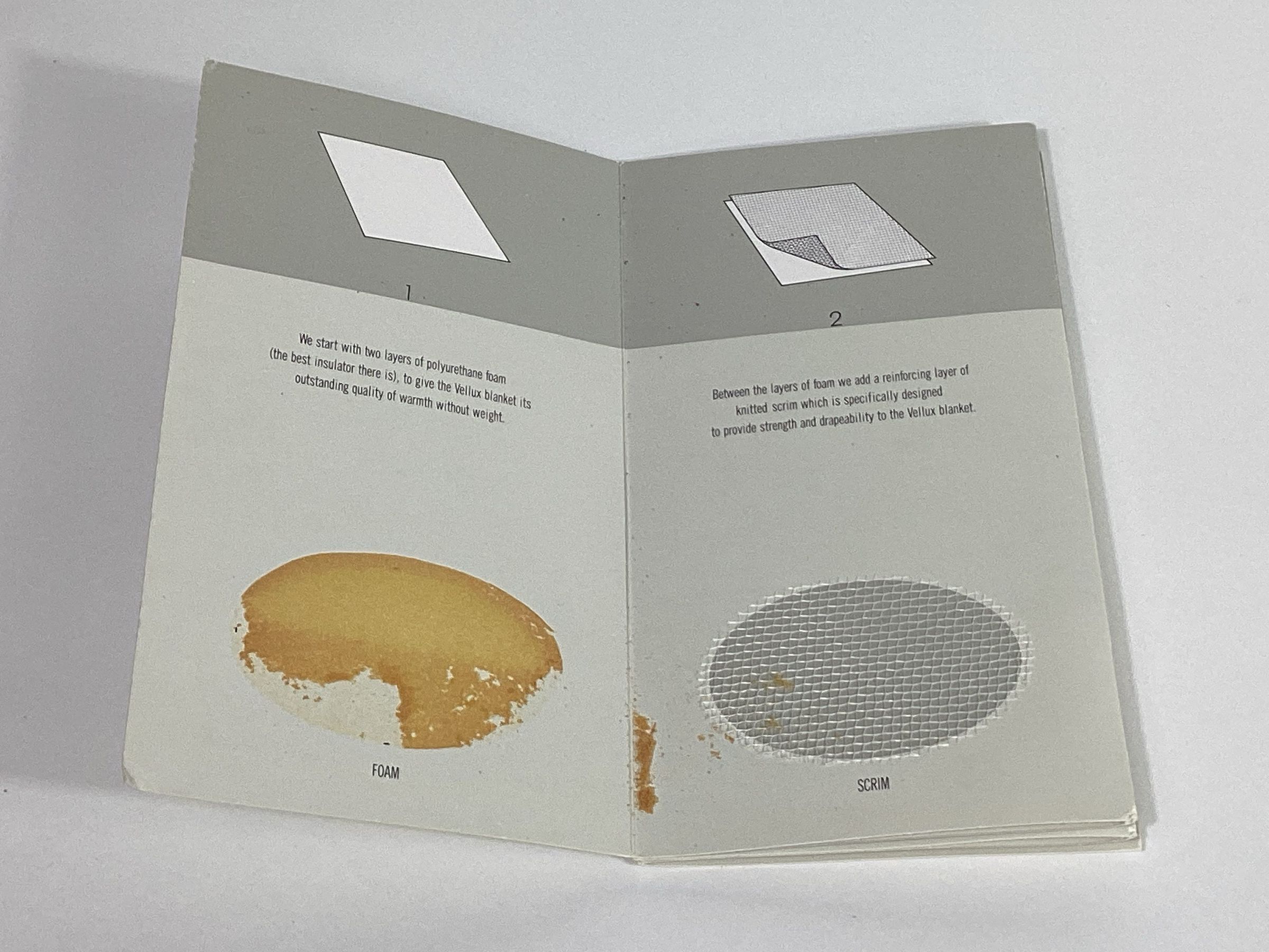 These two promotional brochures describe the various steps involved in the manufacture of Vellux blankets, from initial foam layer through an example of the finished blanket material after it had been washed 50 times. Also included is a sample of the product at each stage of production. The samples have all survived well, with the exception of the foam substrate layer which appears to be suffering from dry rot.