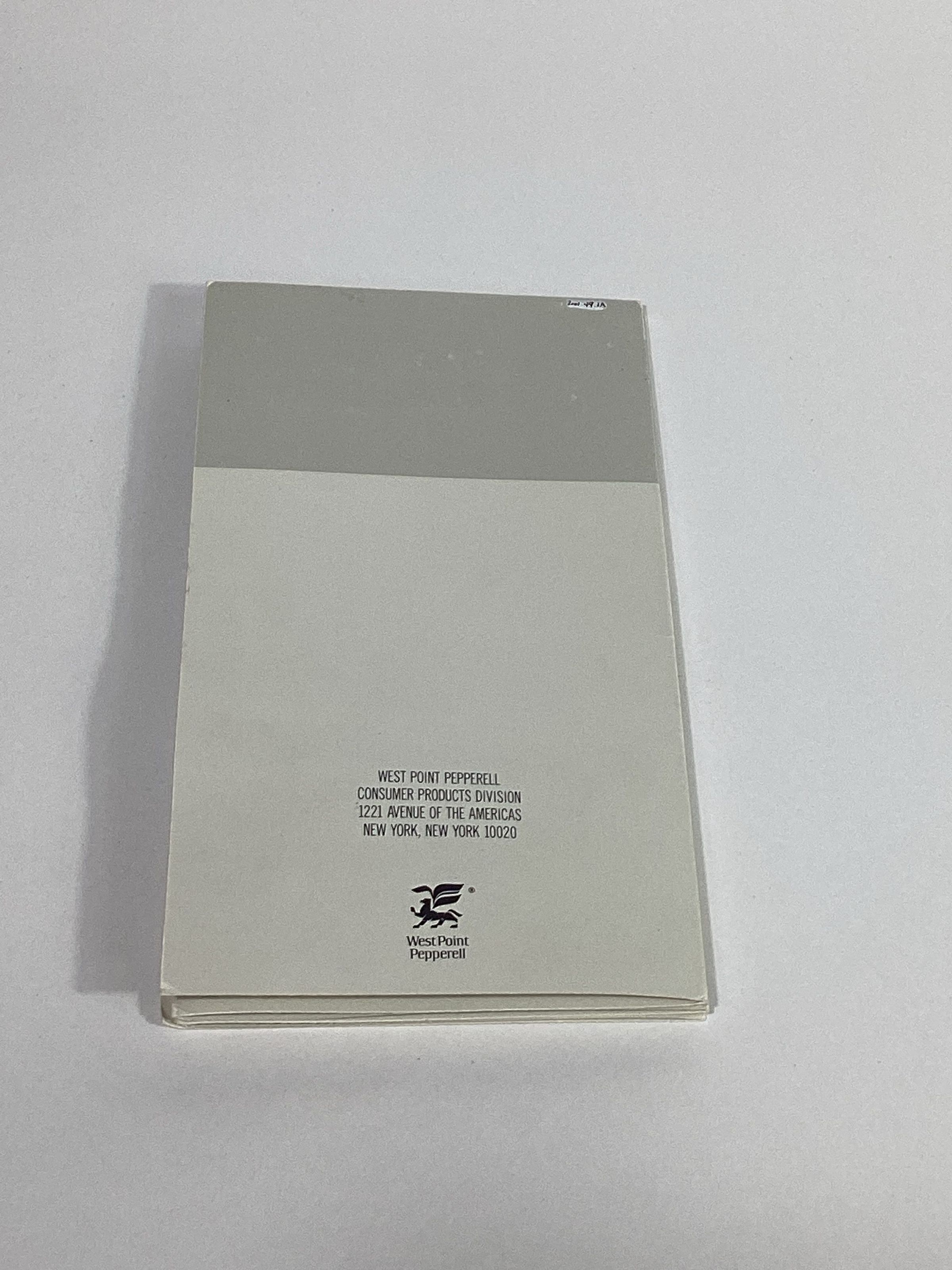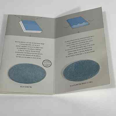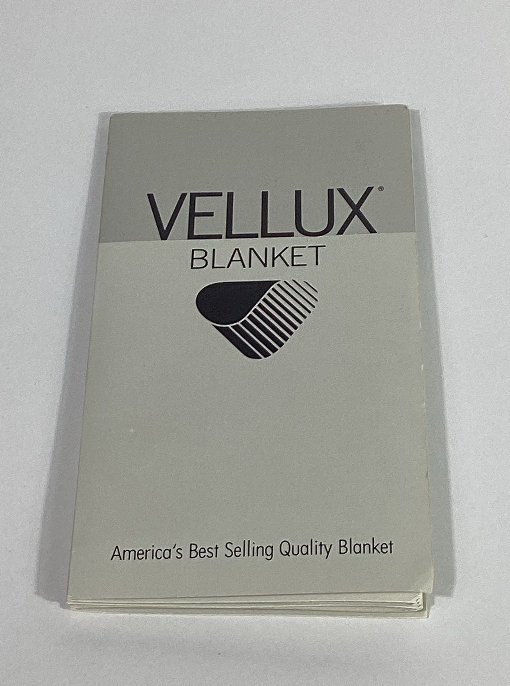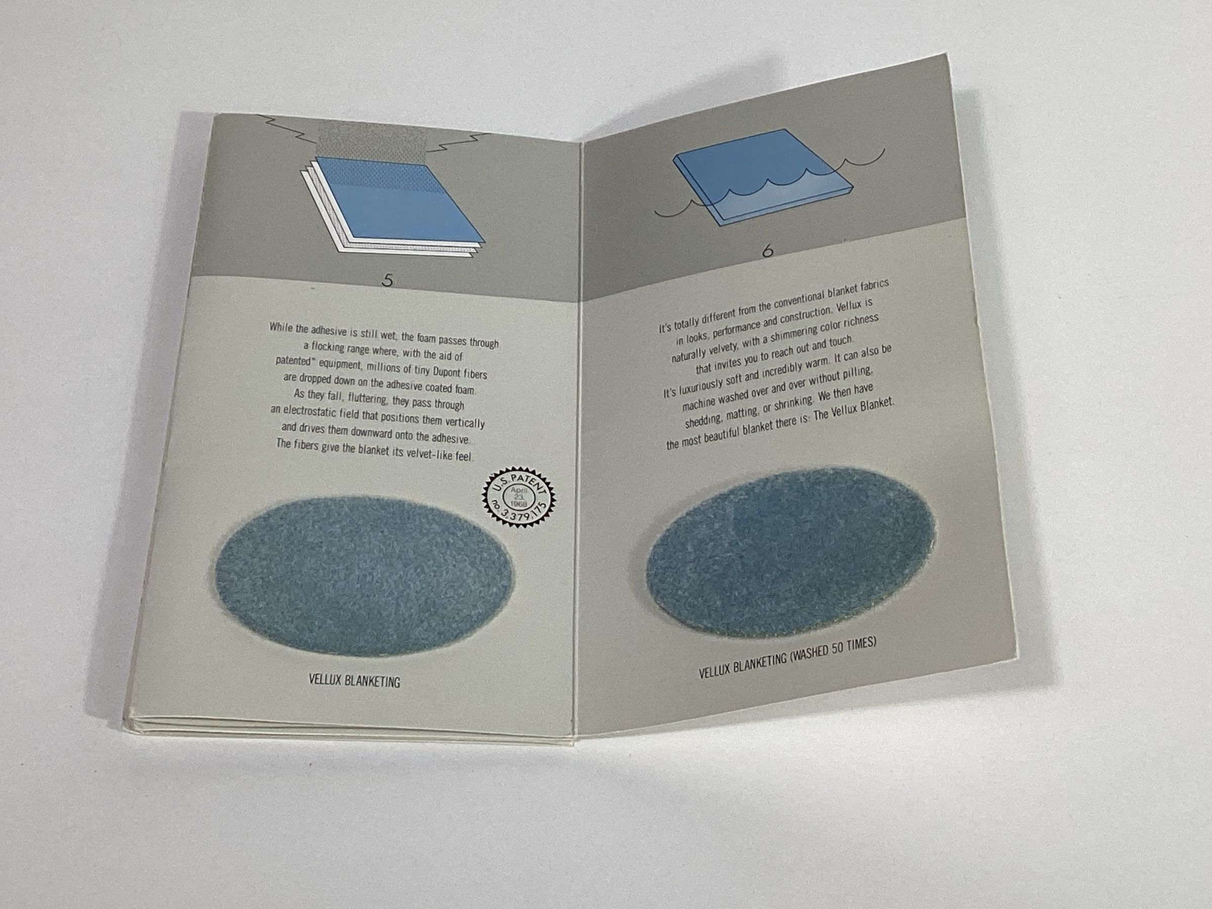 Vellux blanket booklet, "America's Best Selling Quality Blanket", published by the West Point Pepperell Consumer Products Division. Six-page booklet that describes the manufacturing process for Vellux blankets, with samples of the product from the various stages of production: polyurethan foam, knitted scrim, laminated substrate, colored adhesive, white nylon flock, and the final product of Vellux blanketing, both right after production and after being washed 50 times. On each page the manufacturing process is described.Dimensions