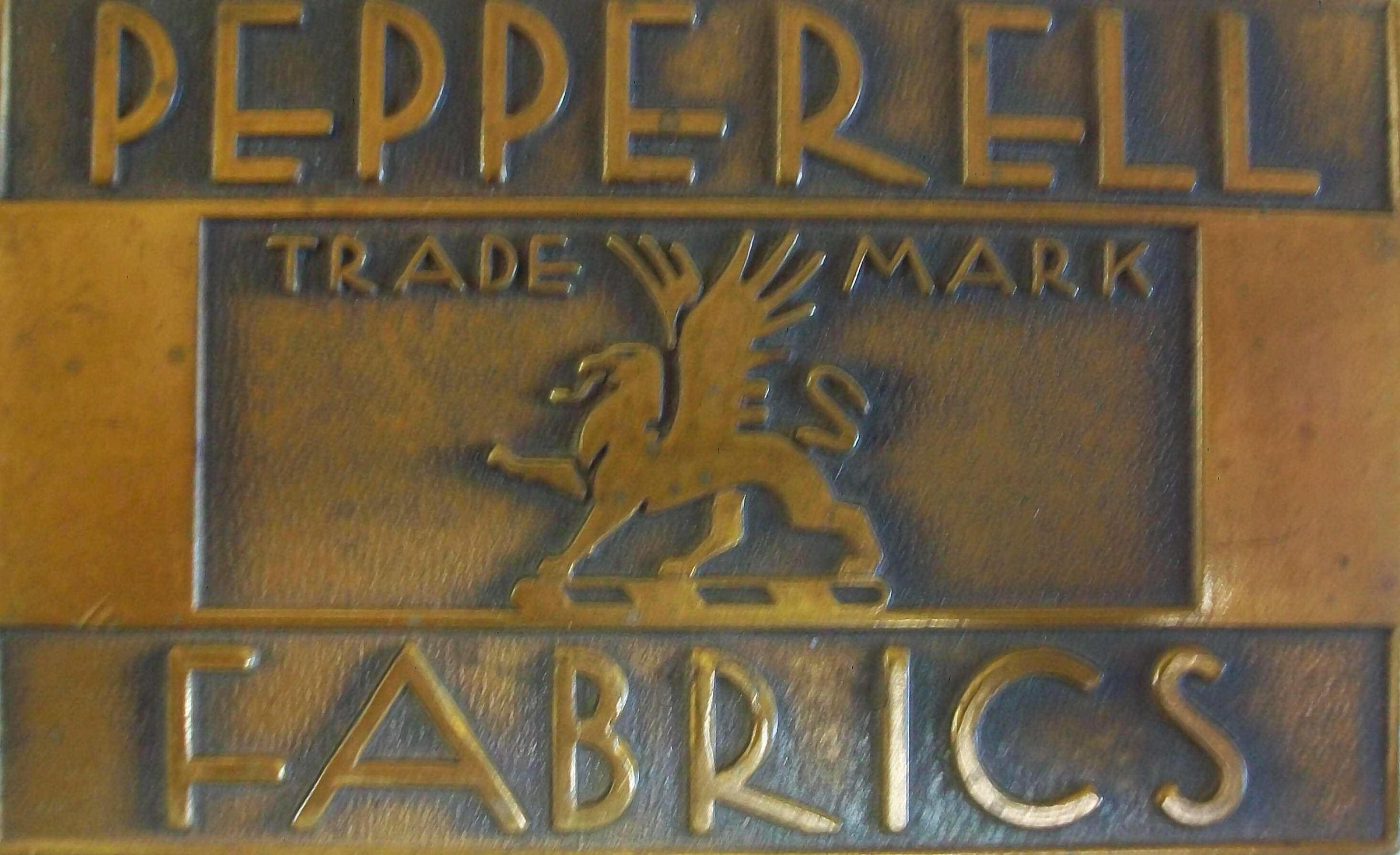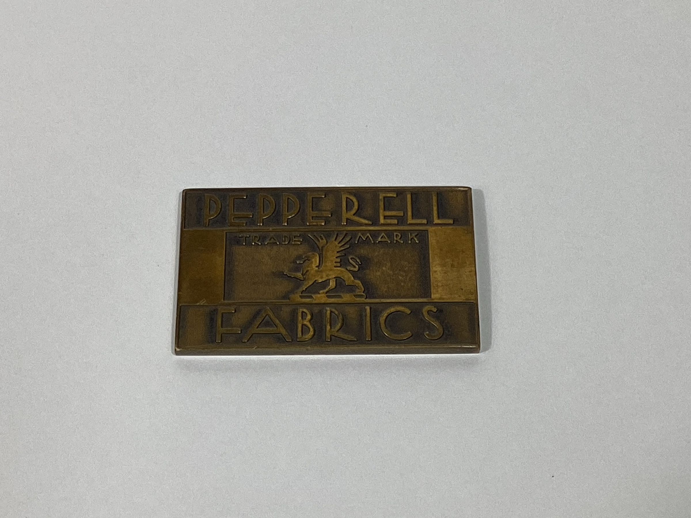 Brass paperweight with inscription on it "Pepperell Fabrics" In the center, "Trade Mark" with company logo. On the back "Jordan Craft, Boston, Mass."Dimensions