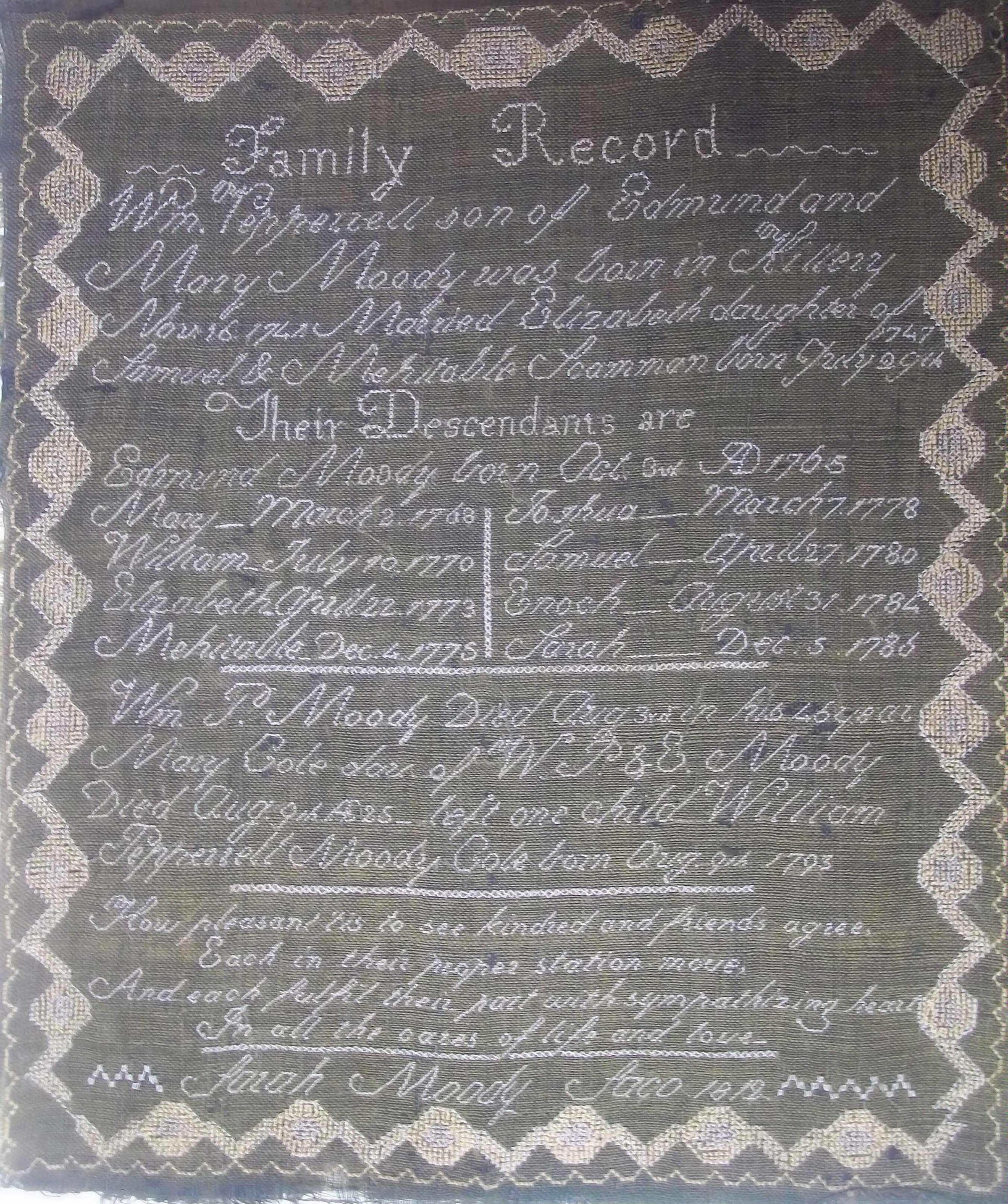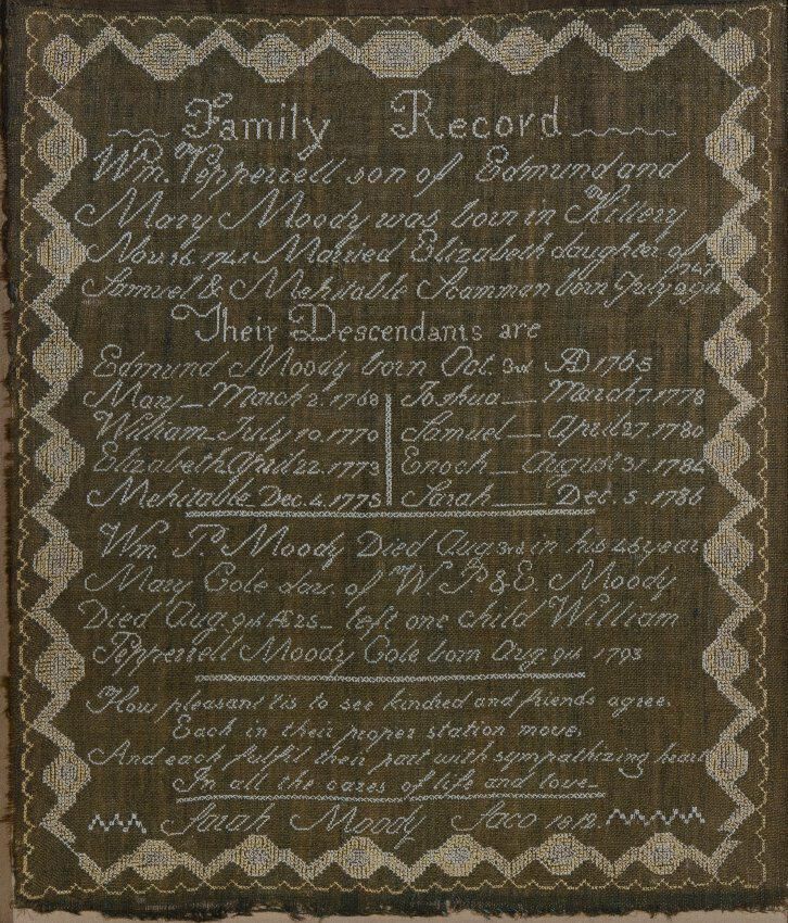 Family register sampler made by Sarah Moody of Saco in 1812, when she was 26. Worked in silk thread in cross and straight stitches on green linsey-woolsey fabric. Simple geometric border and text worked in sloping text, which is characteristic of the works of Sarah and her school.