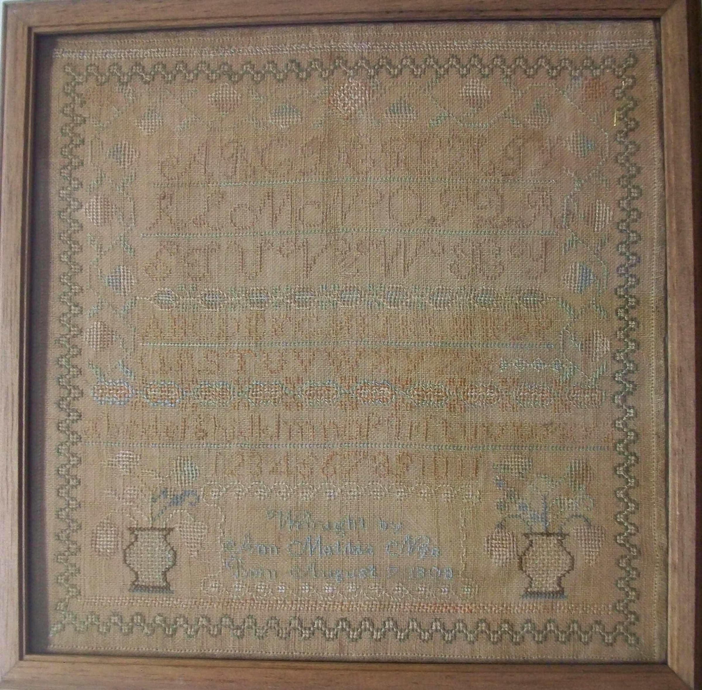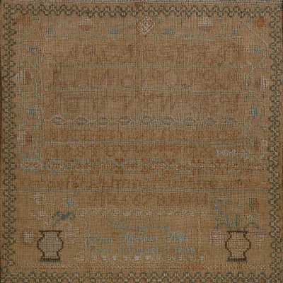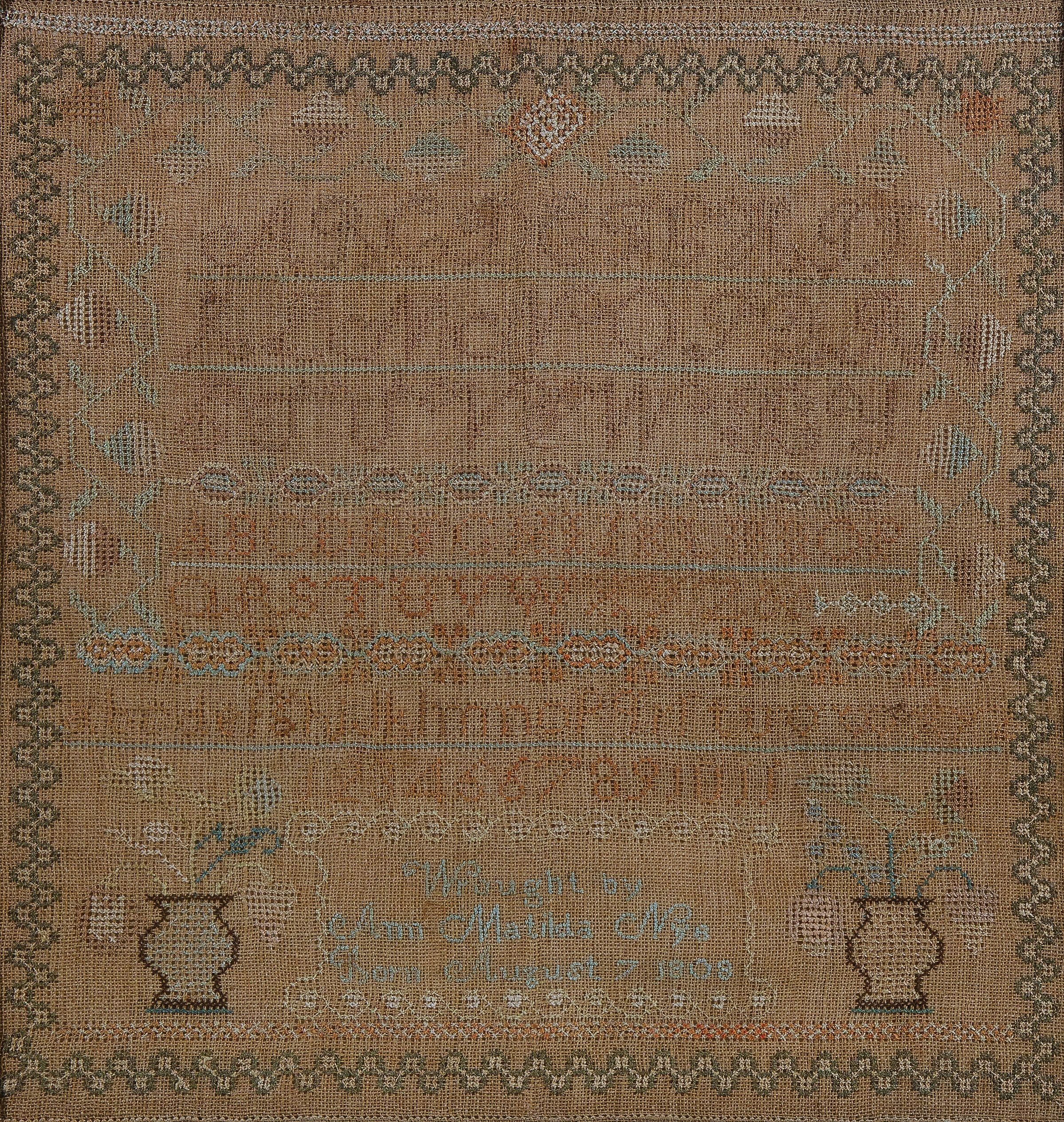 Sampler worked by Ann Matilda Nye on unbleached linen with silk thread in cross stitch over one and two threads. Geometric border with a stylized strawberry fine around the upper portion of the alphabet that encloses the first upper case alphabet. Two upper case and one lower case allphabets and one series of numbers, all separated by geometric decorative bands. The signature is enclosed in a geometric border at the bottom, flanked by two flower vases. The inscription reads: