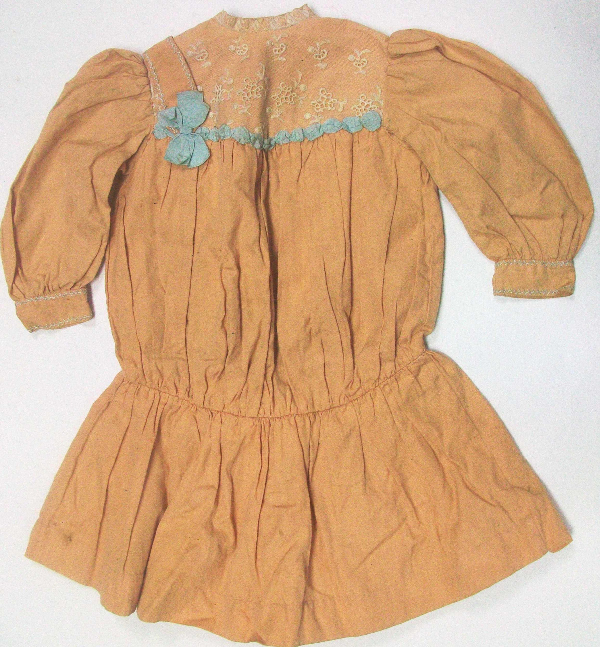 Apricot-colored child's cotton dress with a long waist and sleeves. Decorated with lace facing on the bodice, hand-embroidered trim on cuffs and shoulders, and blue ribbon trim and bows across lower-edge of bodice. Buttons in the back. Has a matching crocheted purse (2011.9.4).Dimensions