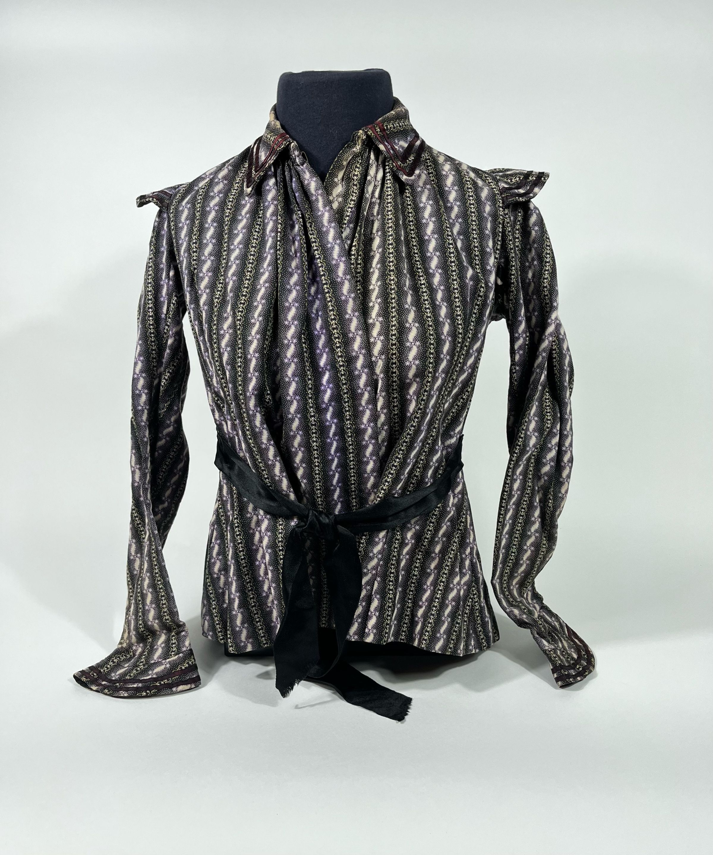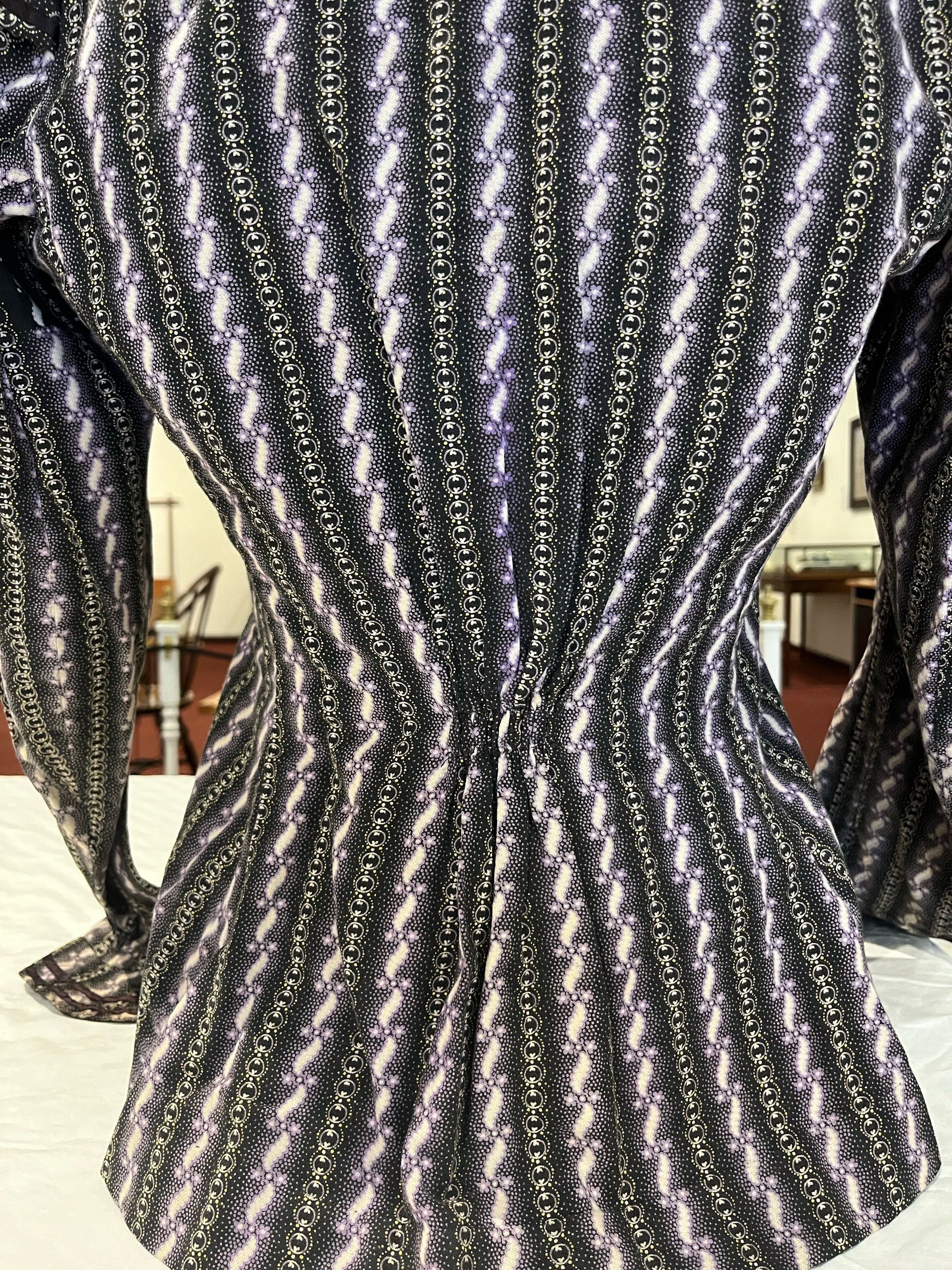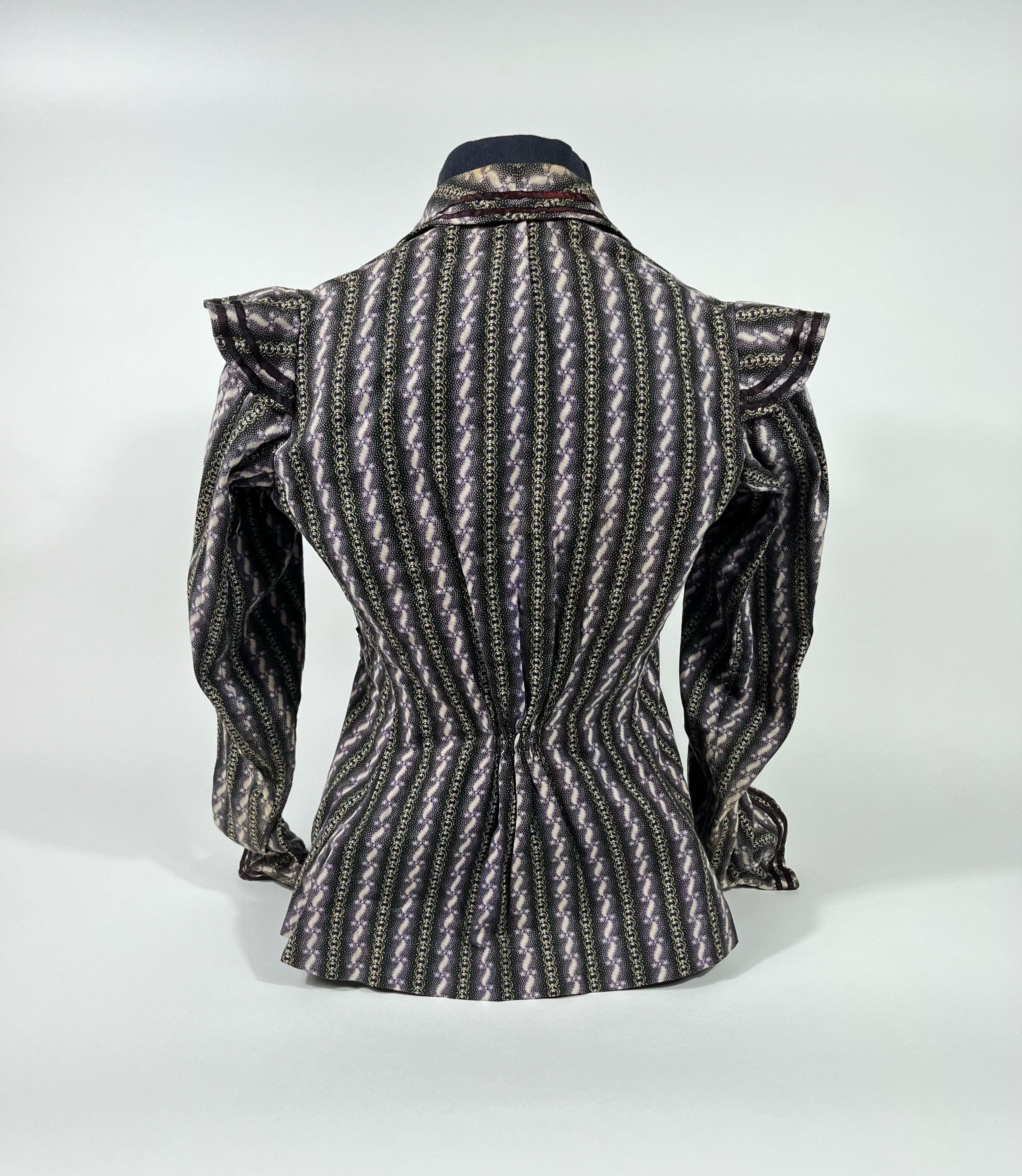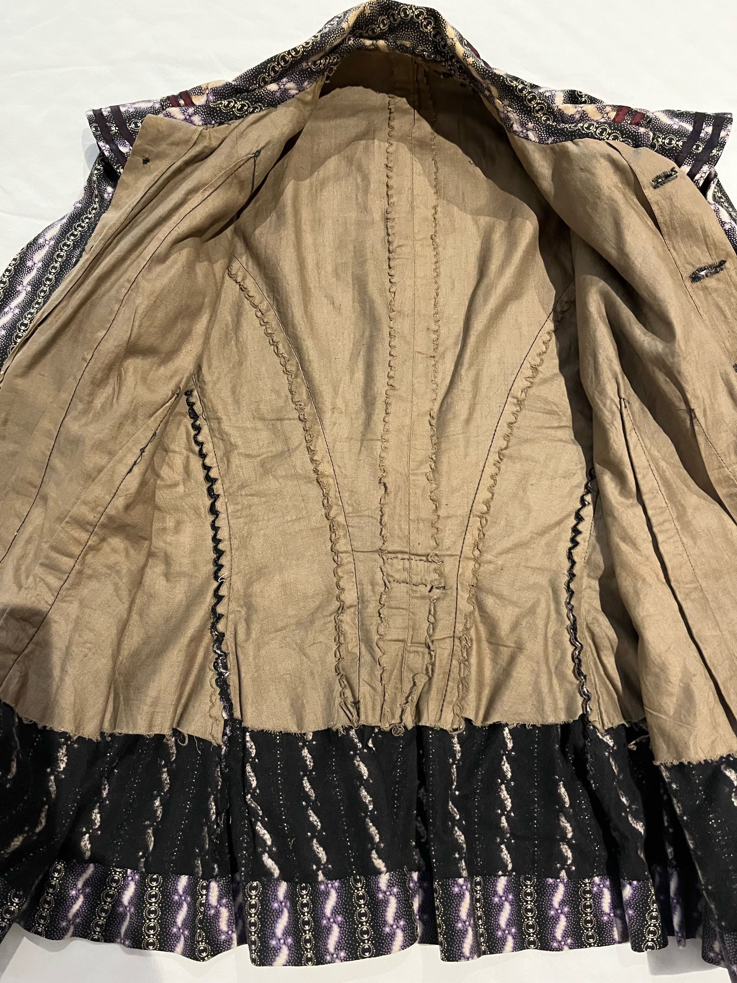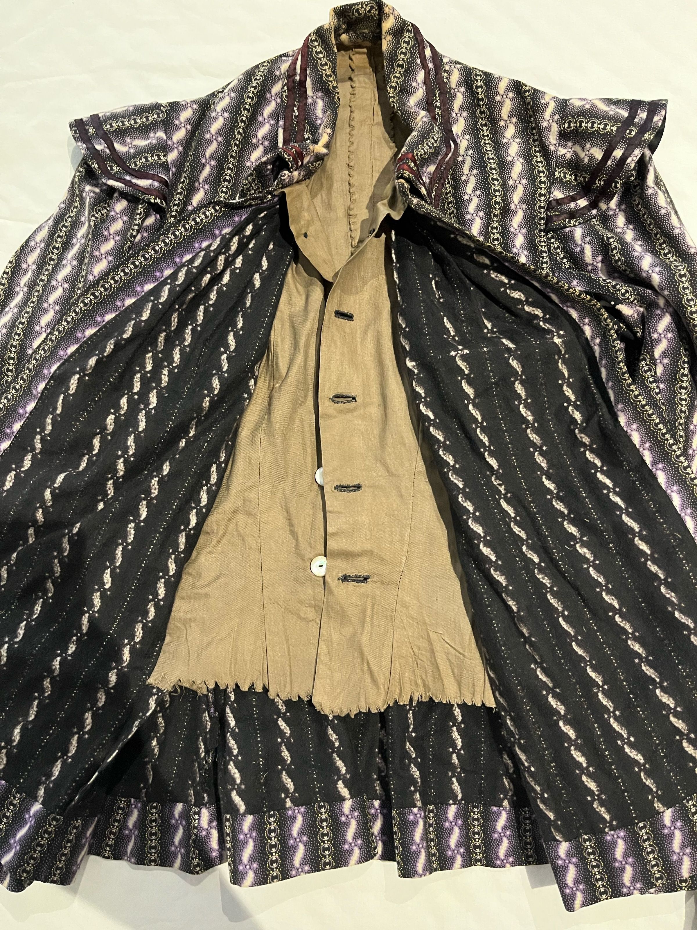 Purple, black, and white printed cotton jacket with maroon satin ribbon on collar and sleeve caps. Wide black satin ribbons are sewn to each side seam at the waist and serve as a belt to close the jacket. The exterior fashion fabric has no closures. Brown cotton twill lining sewn in along the back and side seams; the front sections are loose and close down the front with 5 white buttons. Buttonholes are hand sewn, as are the pleats in the back; the balance of the garment is machine sewn.
