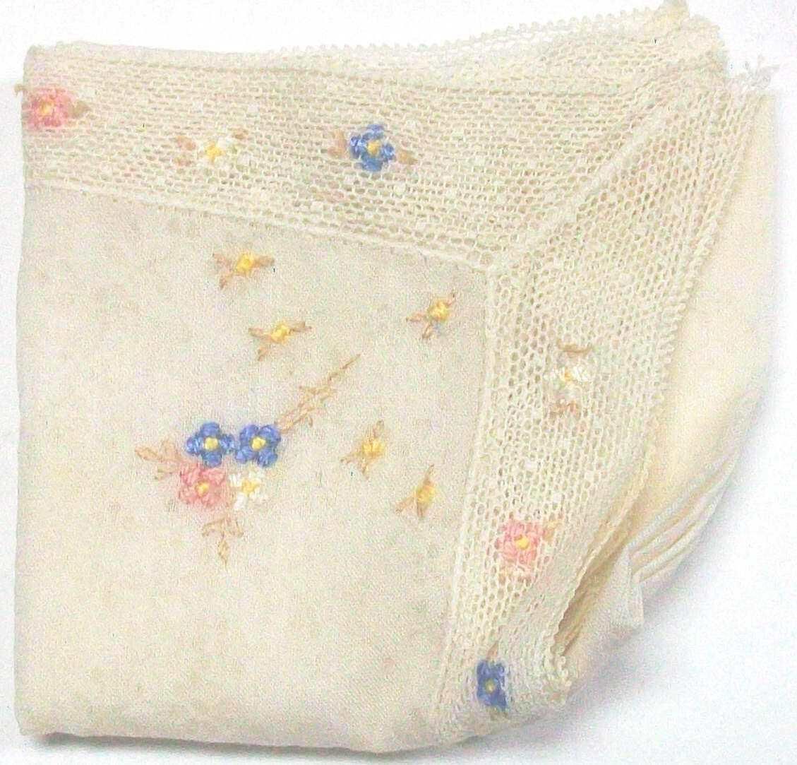 White cotton handkerchief with daisy design woven into fabric, edged with half-inch white lace, embroidered with tiny blue and apricot flowers in one corner. Matches child's dress and purse in 2011.9.3 and 2011.9.4