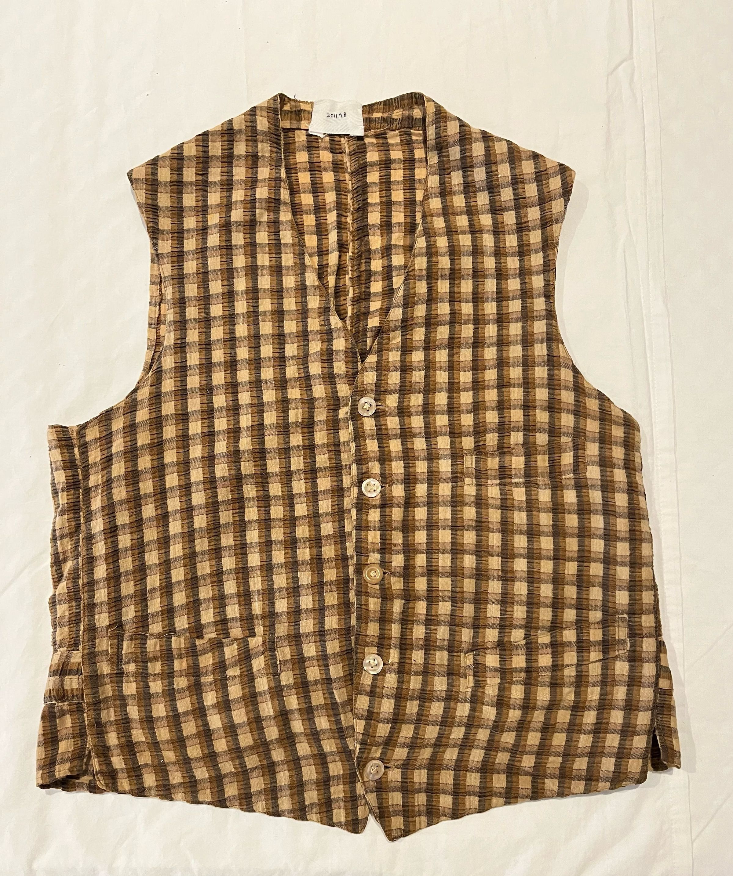 Many people would not consider this vest a “fashionable” garment. Although relatively simple in construction, without a lining, and of an inexpensive cotton material, it shows that the interest in current styles affected the design of everyday clothes. Checked vests were particularly popular in men's clothing in the late 1850s. They were frequently worn with checked trousers, not always matching in scale or color, which probably made for some very eye-catching combinations. Because this vest is of a fairly light-weight cotton seersucker and only single breasted, it was probably intended for warm-weather wear.