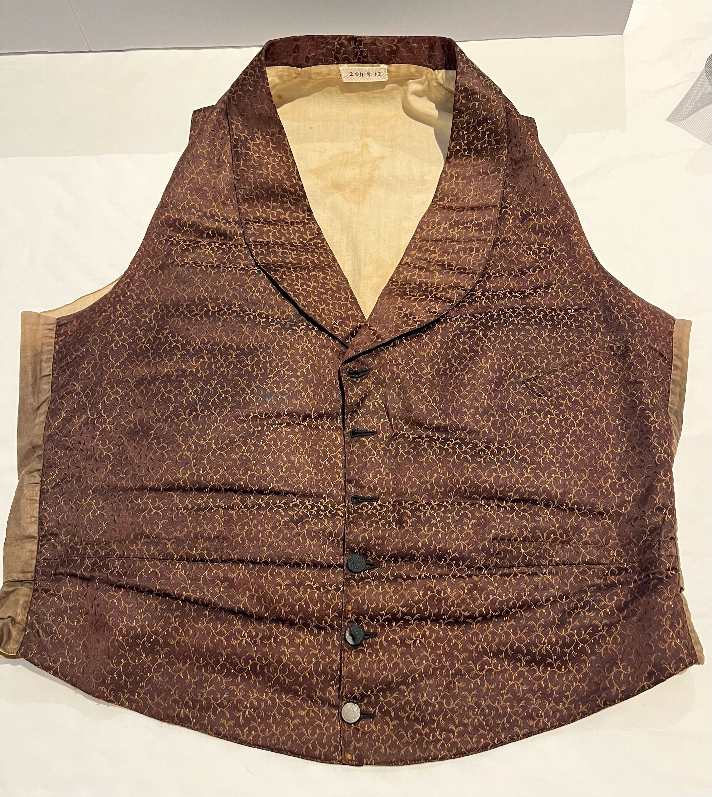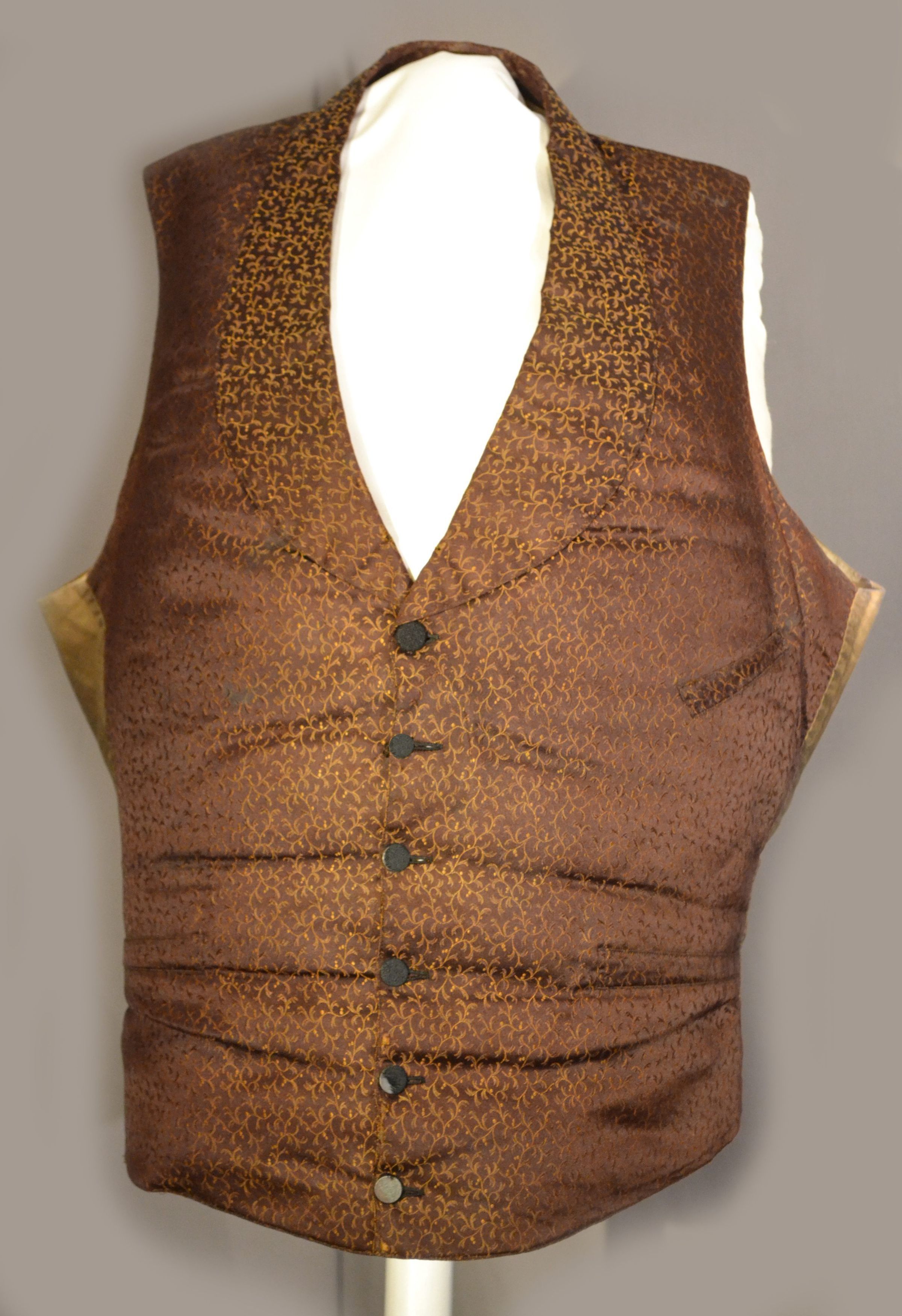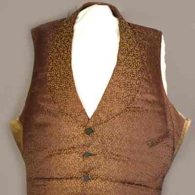 In the 1840s, the fashionable male silhouette called for broad shoulders and a narrow waist. When nature needed a little assistance, padding was added to a garment to allow the wearer to achieve the stylish barrel-shaped ideal. In order to make it easier to adjust the fit of vests to create the nipped-in waist look, many makers began to develop improved fasteners in the 1830s and 1840s, some using buckles and others employing elastic, invented in 1820. This vest has areas of wool padding inserted between the fashion fabric and the lining material, and rear straps fitted with an adjustable metal buckle. The satin fabric with its small woven yellow pattern would have provided a bit of brightness in comparison to the drab wool frock coat and trousers with which the vest would have been worn.