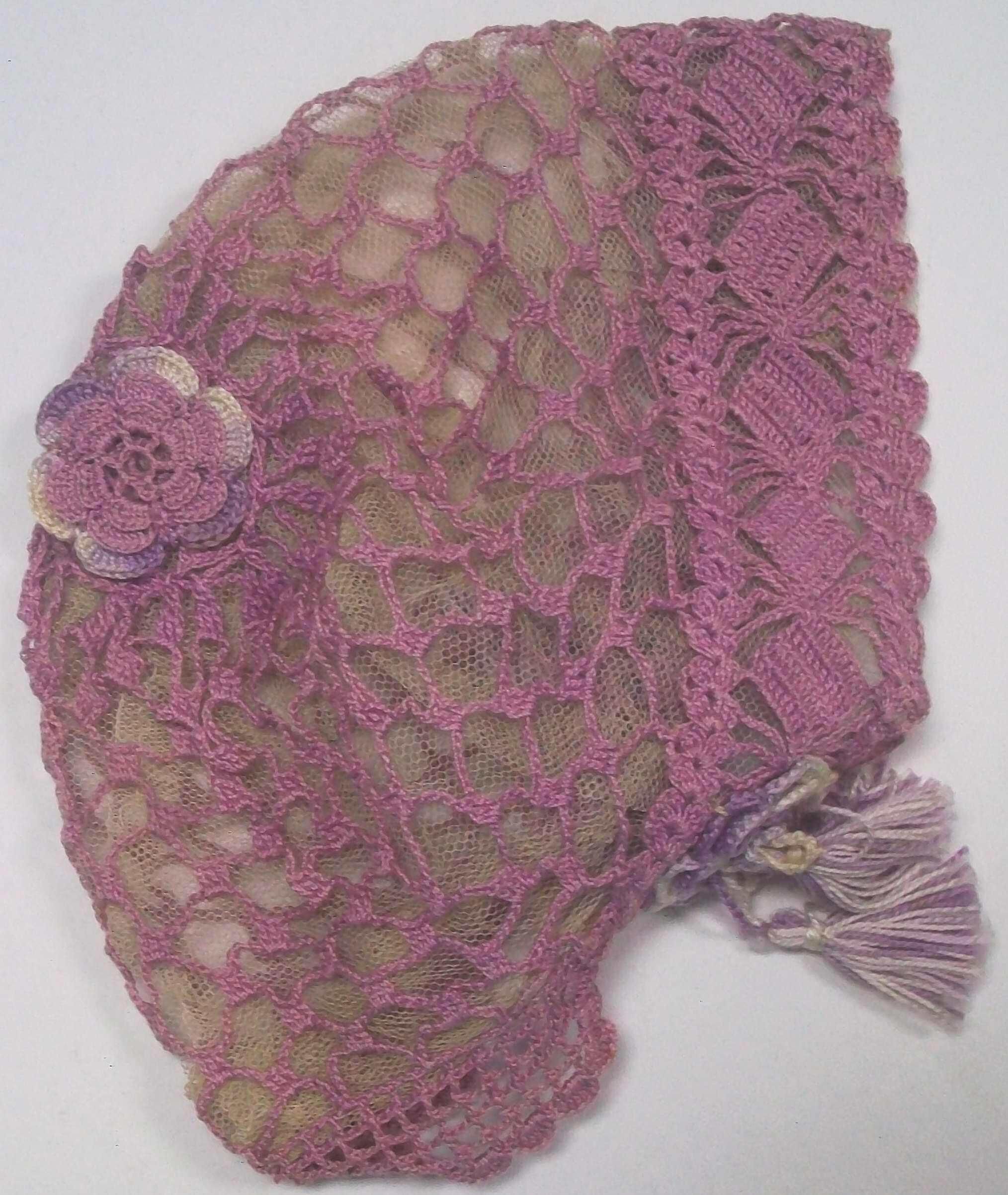 Lady's mauve crocheted day cap with a crocheted flower at the back of and two similar flowers with tassels at the bottom. Lined with beige nylon net fabric.Dimensions