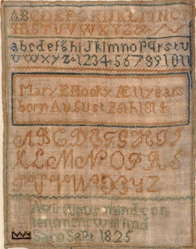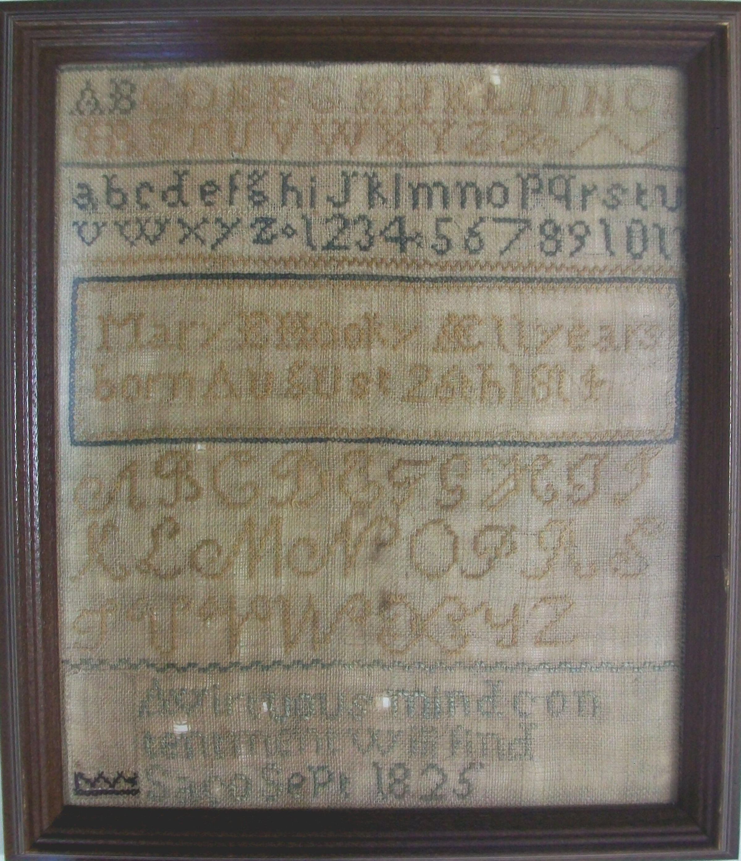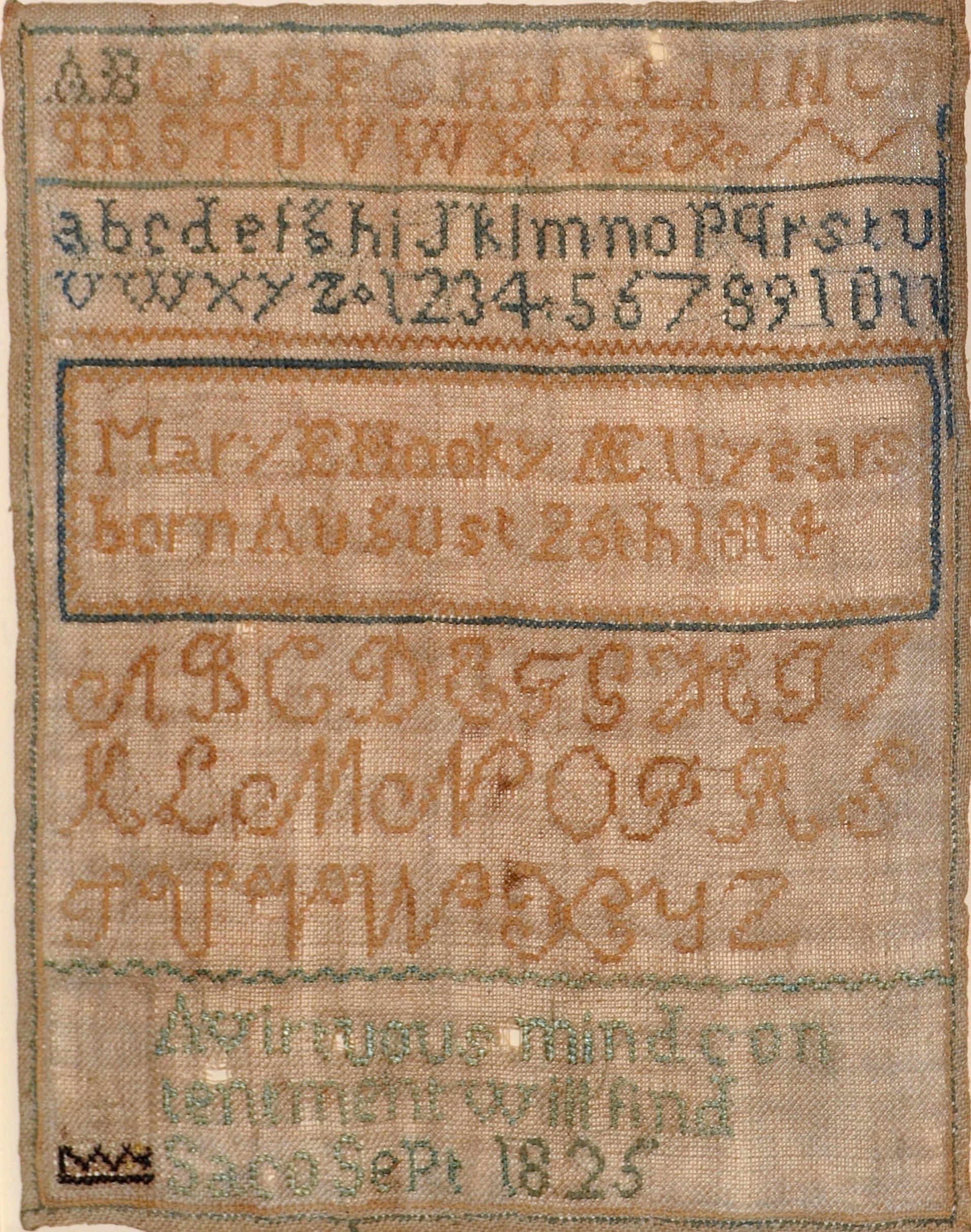Marking sampler on unbleached linen worked in silk thread in cross and straight stitches by Mary Edgecomb Hooky when she was 11 years old. Three alphabets, two upper case and one lower case, and one set of numbers. Mary inscribed her name in the middle, surrounded by a sawtoothed border: