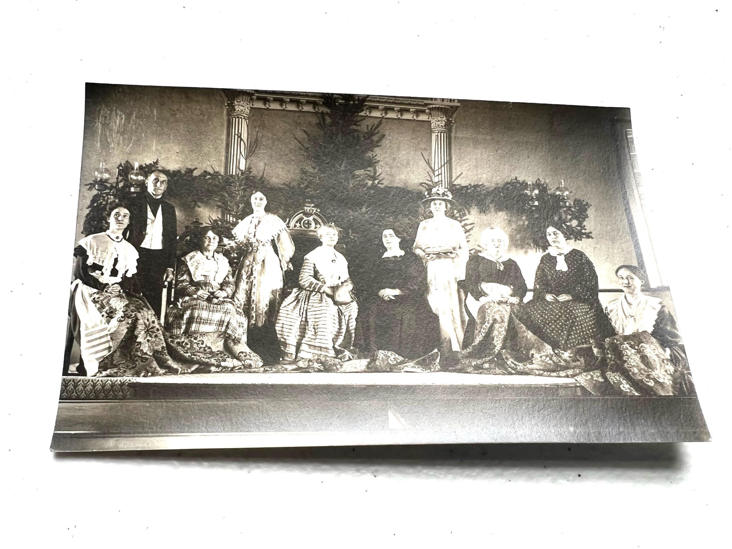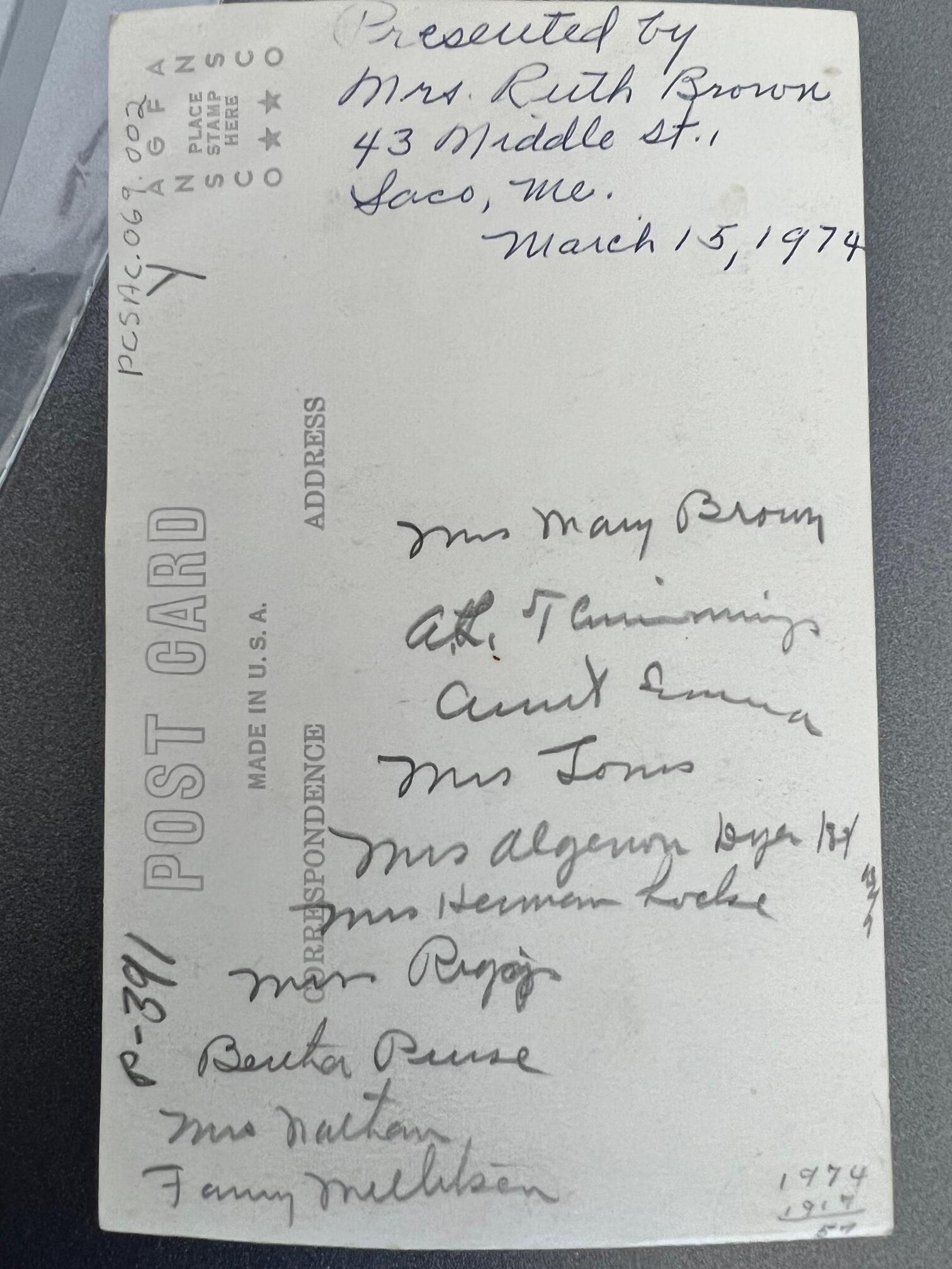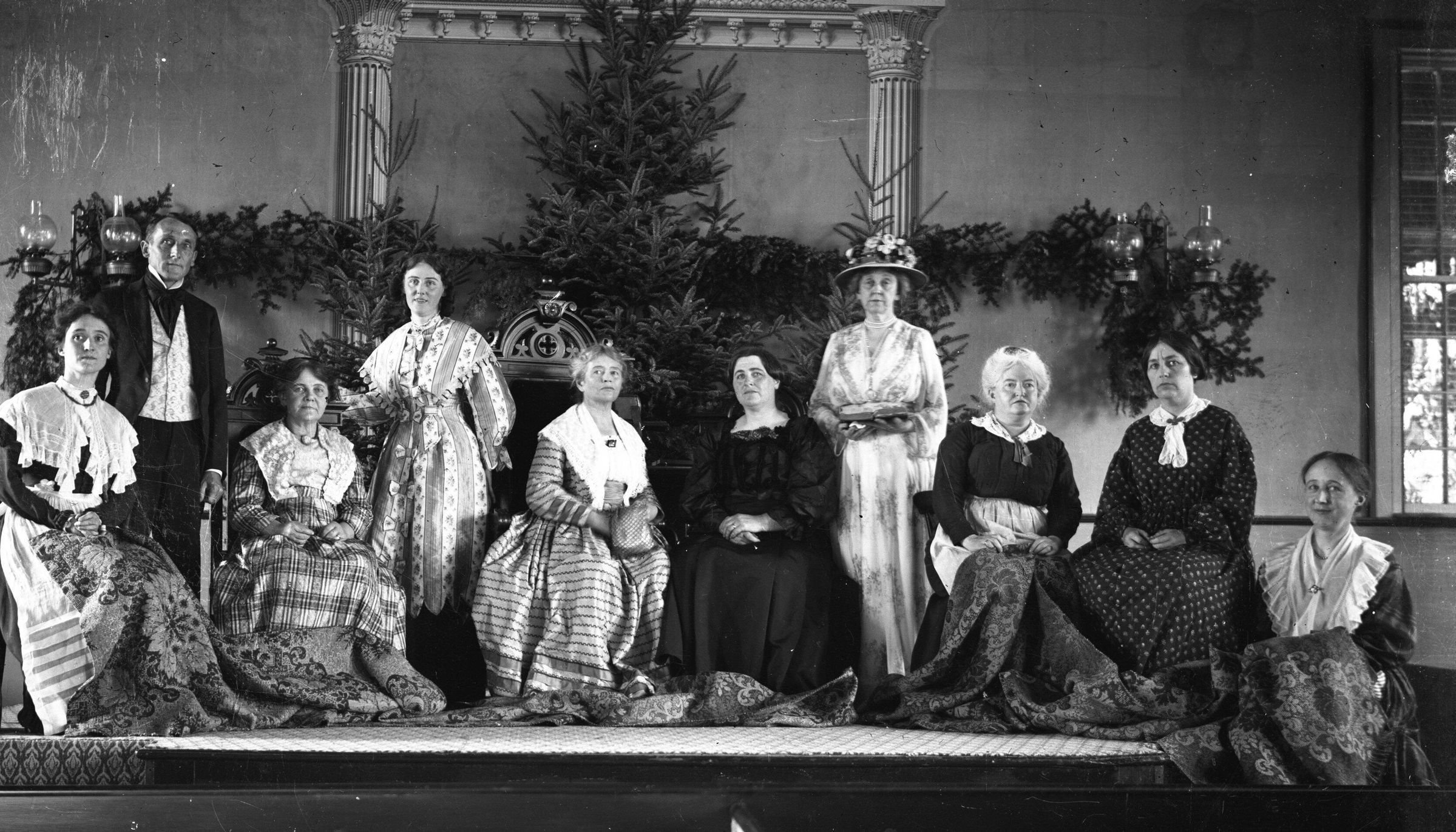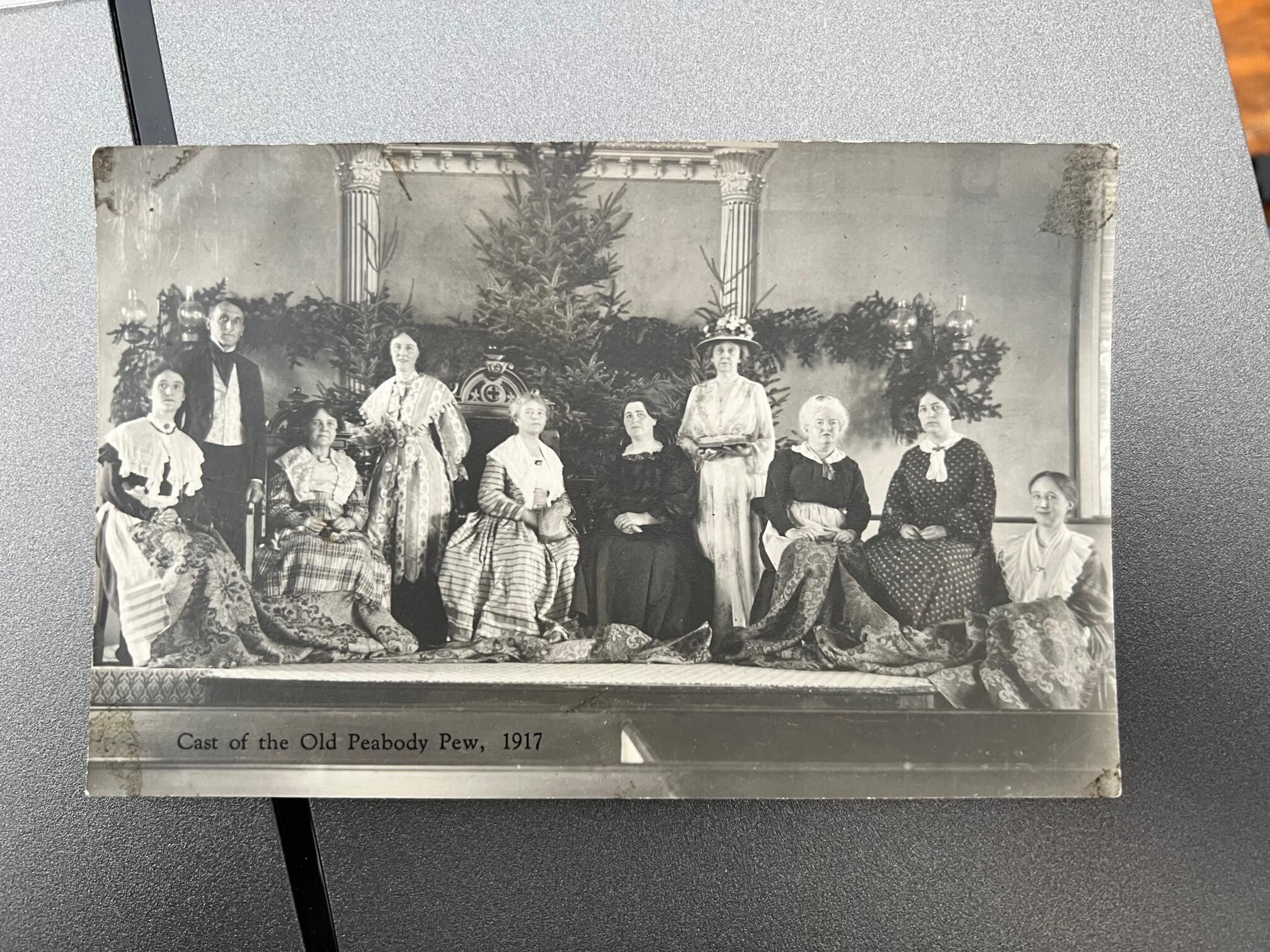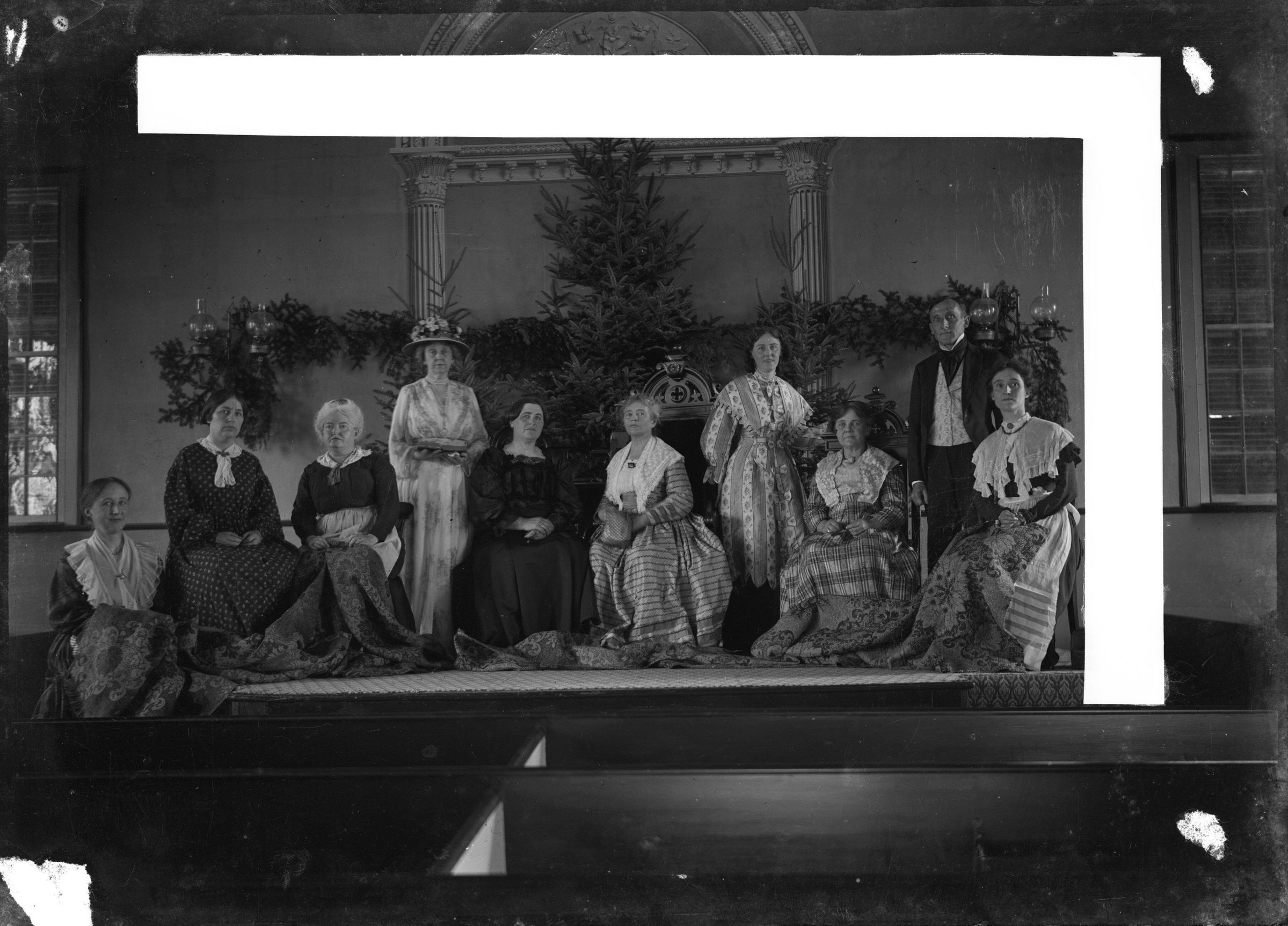 Glass plate negative photo of the cast of The Old Peabody Pew, a play written by Kate Douglas Wiggin. This photo was taken at the Tory Hill Church in Buxton, ME. Kate Douglas Wiggin can be seen (wearing her signature hat) posing with the cast. The gentleman on the left is A.L.T. Cummings, a long time performer of the play. A section of postcard has been pasted onto the back of the slide - "Aug. 10, 1933" is written on it in pencil. This is likely the processing date when this photo was made into postcards (KDW died in 1923). This postcard is still widely sold today as antique ephemera. This same postcard is in the Dyer Library archives "Gibeon E. Bradbury Family Papers" collection (MMS51.Ph4). There is also another postcard with the same image in the archives (PCSA.069.002) with the following information written on the back: "Presented by Mrs. Ruth Brown, 43 Middle St., Saco, ME. March 15, 1974. Mrs. Mary Brown, A. L. T. Cummings, Aunt Emma, Mrs. Lonas [?], Mrs. Algernon Dyer, Mrs. Herman Locke, Mrs. Riggs [Kate Douglas Wiggin was called 'Mrs. Riggs' in her circle of associates], Bertha Pierce, Mrs. Nathan, Fanny Milliken." The Maine Historical Society (Maine Memory Network) has a copy of the same print with slightly different identifications/names for the individuals.Made/Created