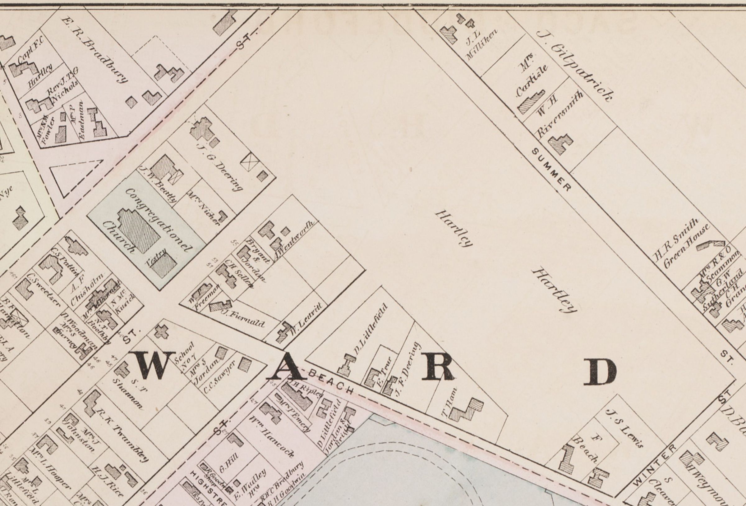 "Hartley Field," where the parking lot and the Saco Museum stand today, stretched across the street from the Hartley House (also known as the Coit House) owned by Captain Samuel Hartley. The field went beyond the bounds of C.K. Burns and ended at Winter Street.