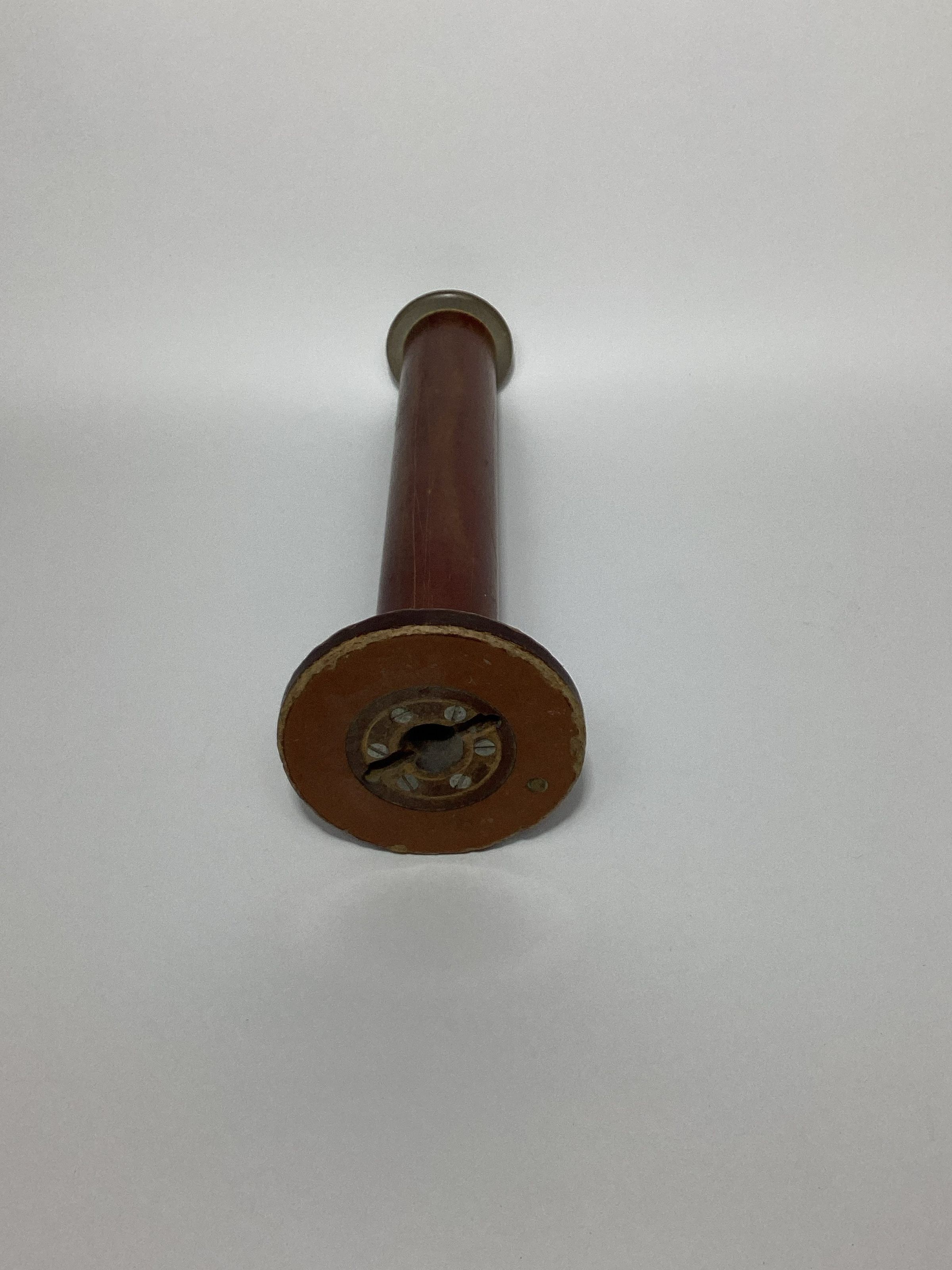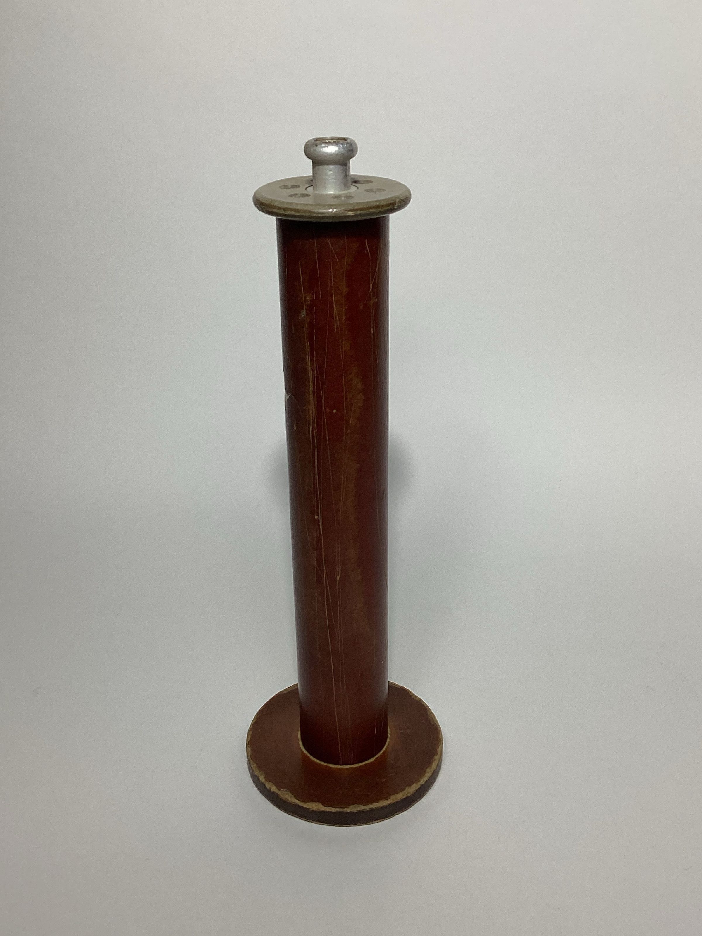 Large rayon twister spool with a metal knob at the top. The flange at the bottom of the bobbin is larger than that at the top and has a metal bushing with a slotted hole.Dimensions